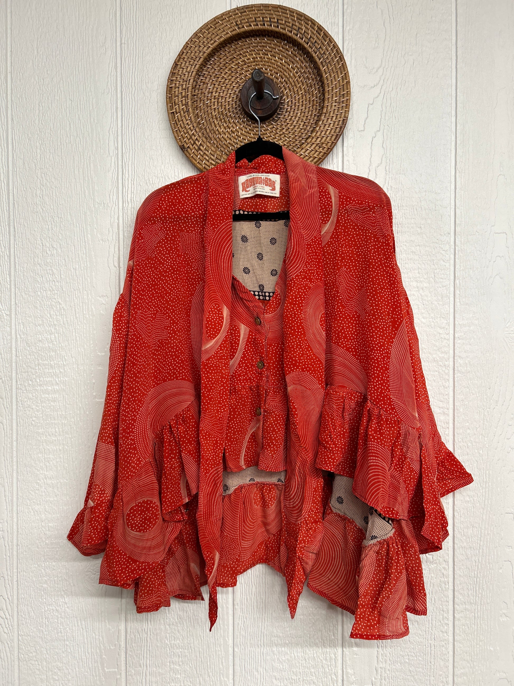 Crafted from vintage crepe sari this romantic piece features ruffles throughout, tie closure on the neck that can be opened or closed, fully functional button placket, high low hem, bell sleeve.
