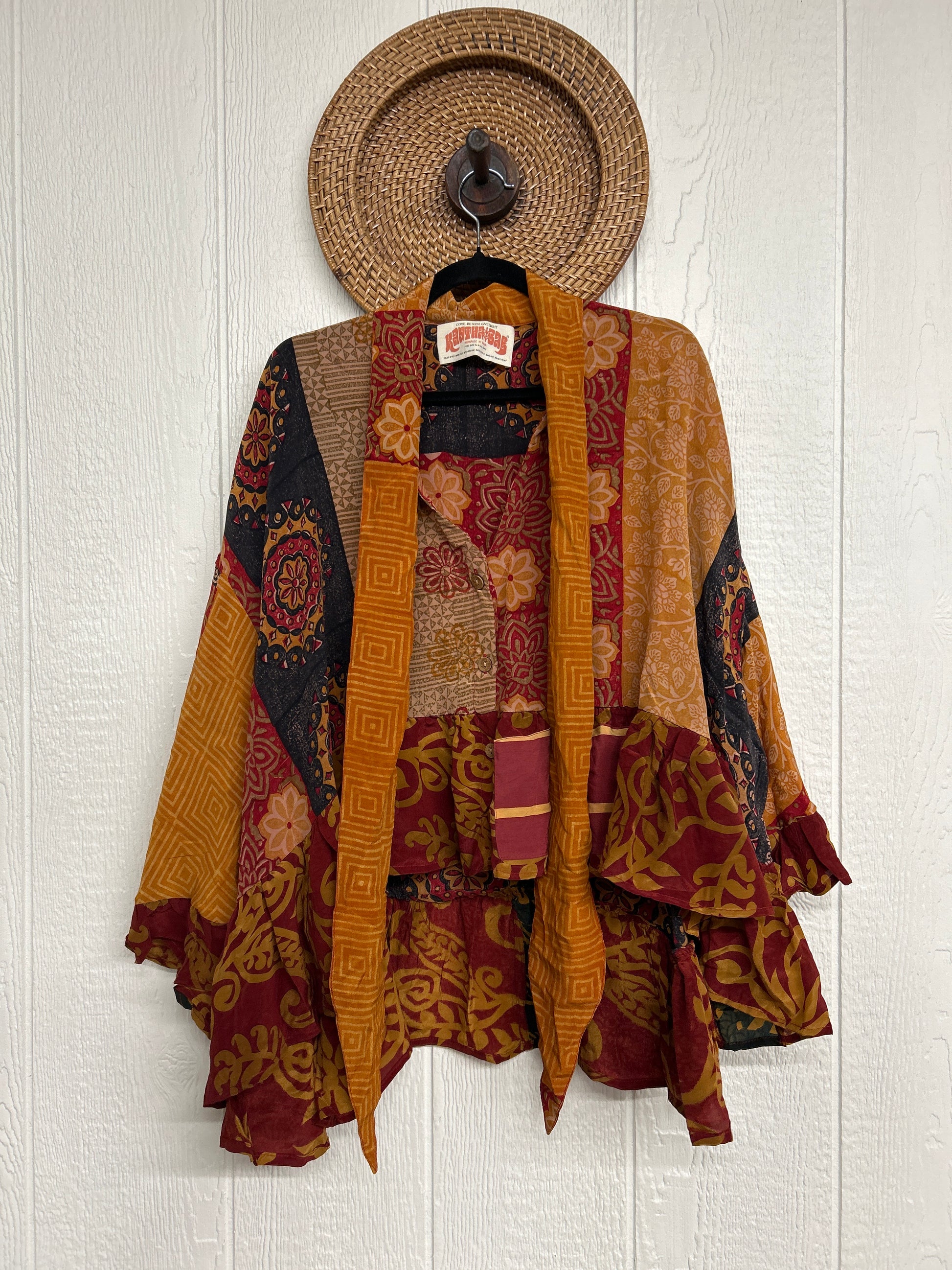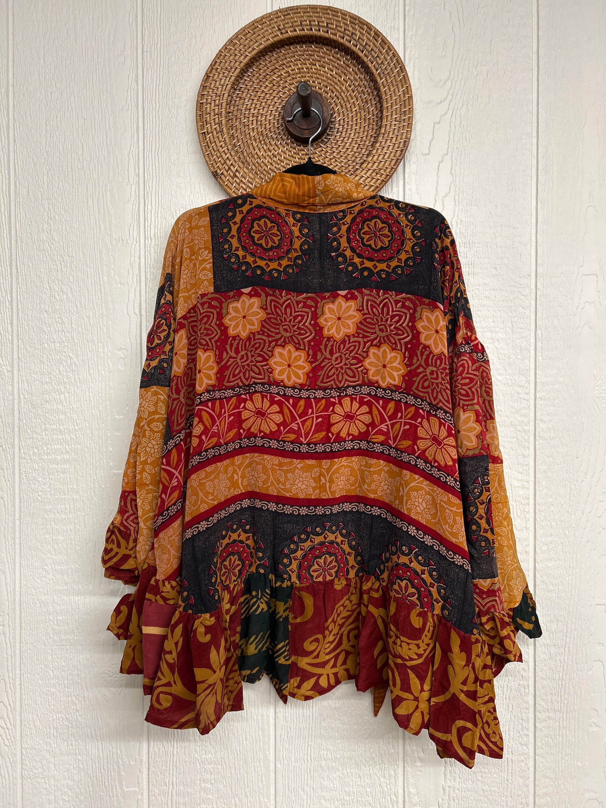 Crafted from vintage crepe sari this romantic piece features ruffles throughout, tie closure on the neck that can be opened or closed, fully functional button placket, high low hem, bell sleeve.