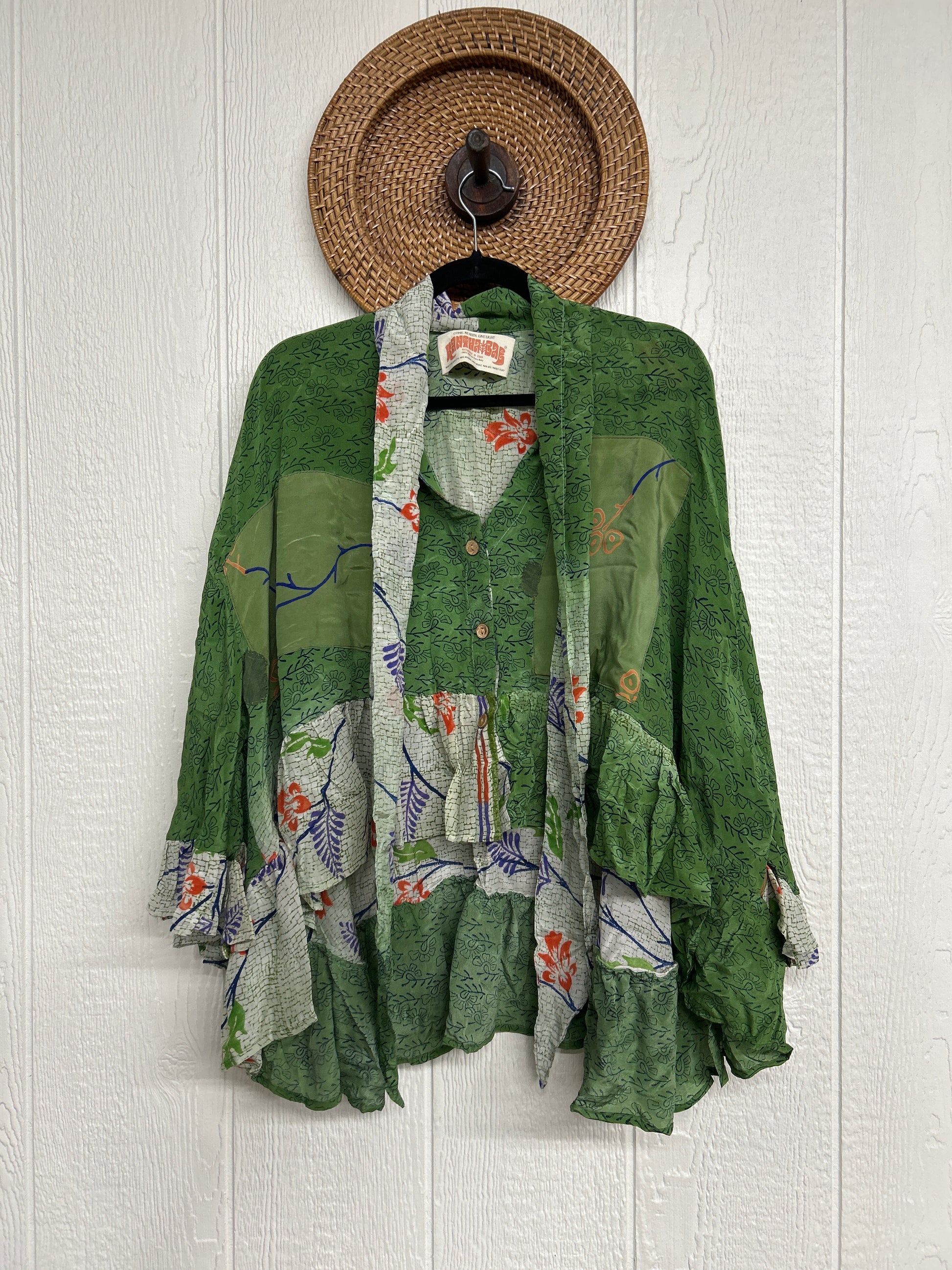 Crafted from vintage crepe sari this romantic piece features ruffles throughout, tie closure on the neck that can be opened or closed, fully functional button placket, high low hem, bell sleeve.