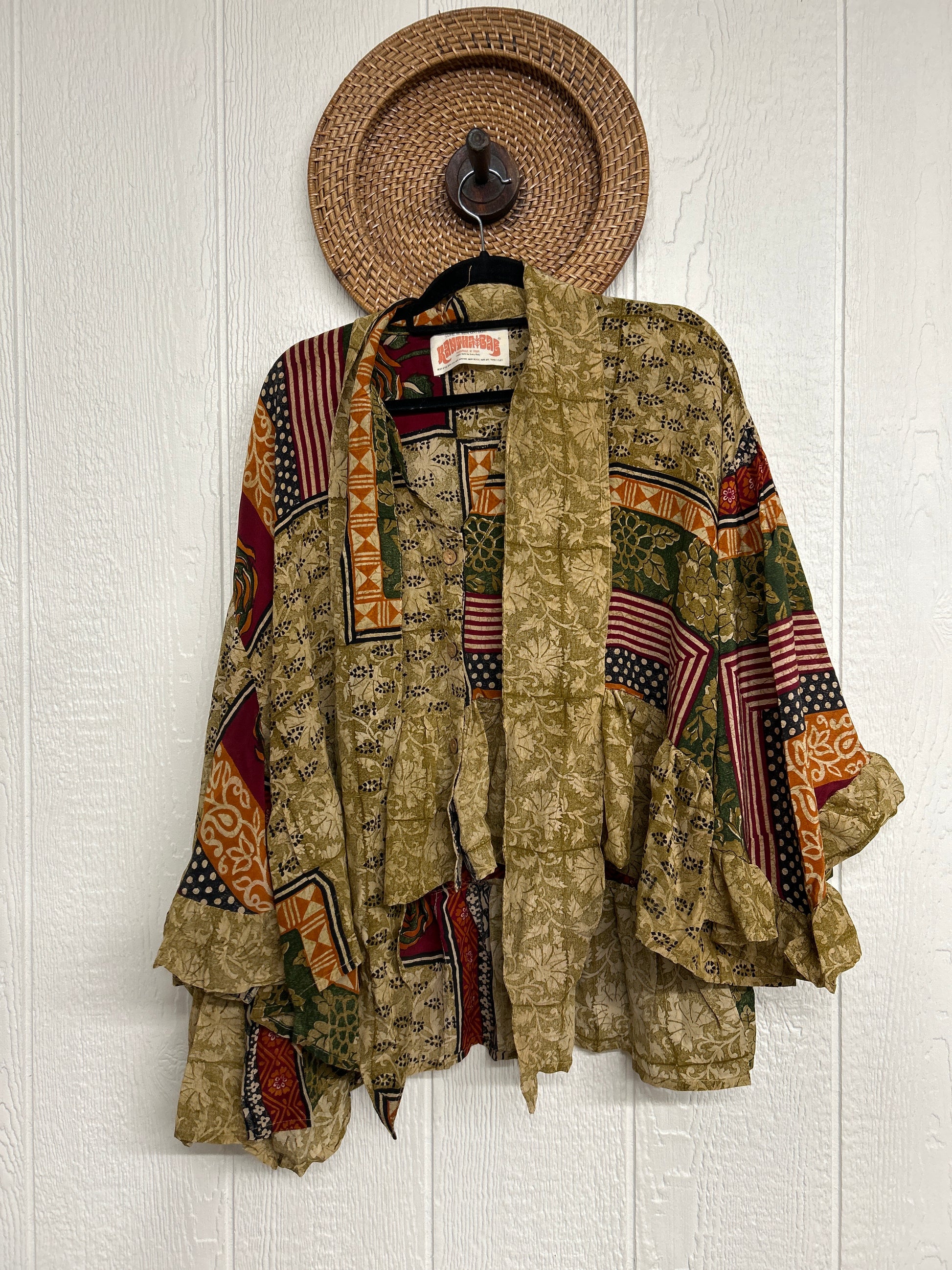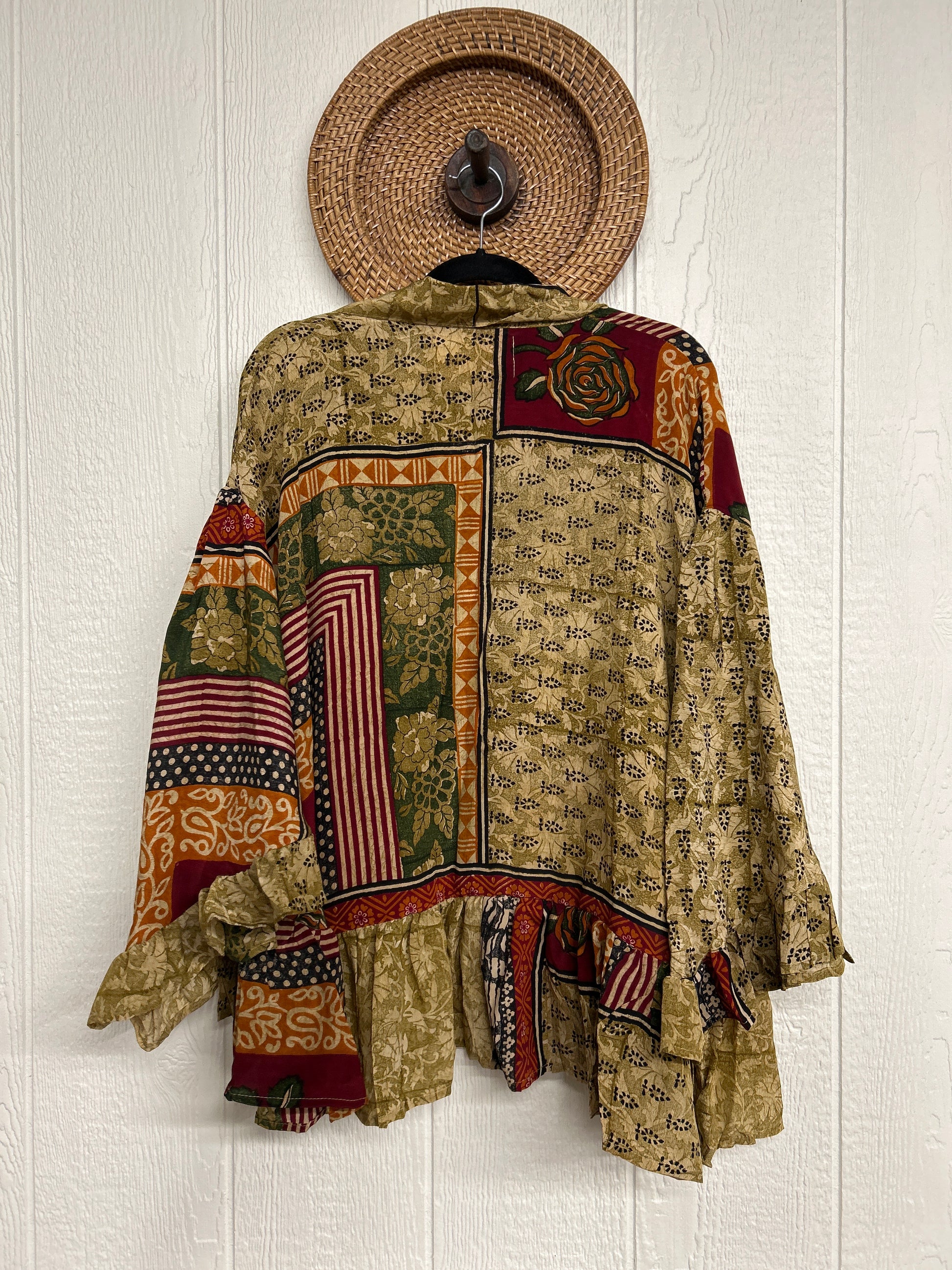 Crafted from vintage crepe sari this romantic piece features ruffles throughout, tie closure on the neck that can be opened or closed, fully functional button placket, high low hem, bell sleeve.