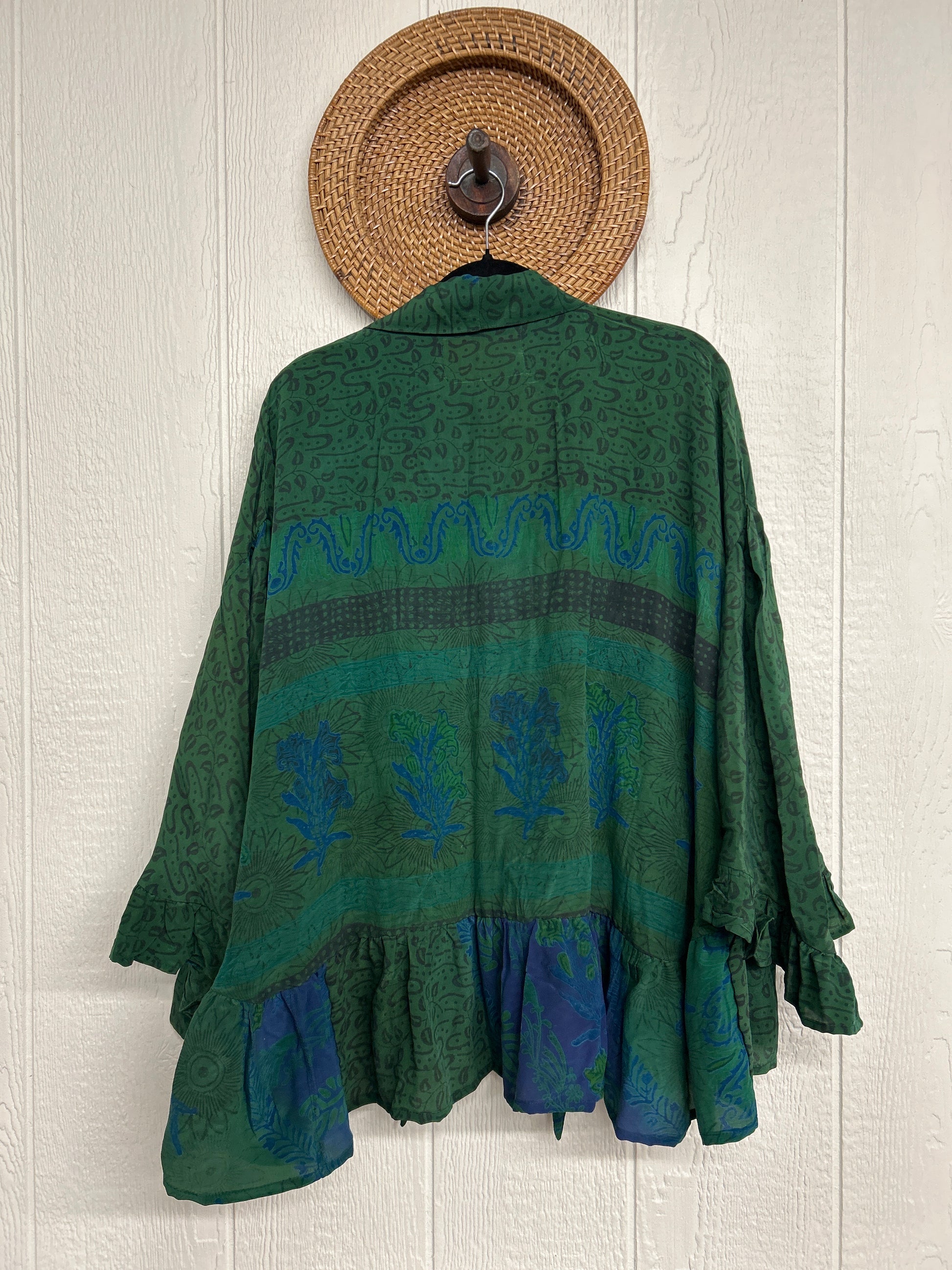 Crafted from vintage crepe sari this romantic piece features ruffles throughout, tie closure on the neck that can be opened or closed, fully functional button placket, high low hem, bell sleeve.