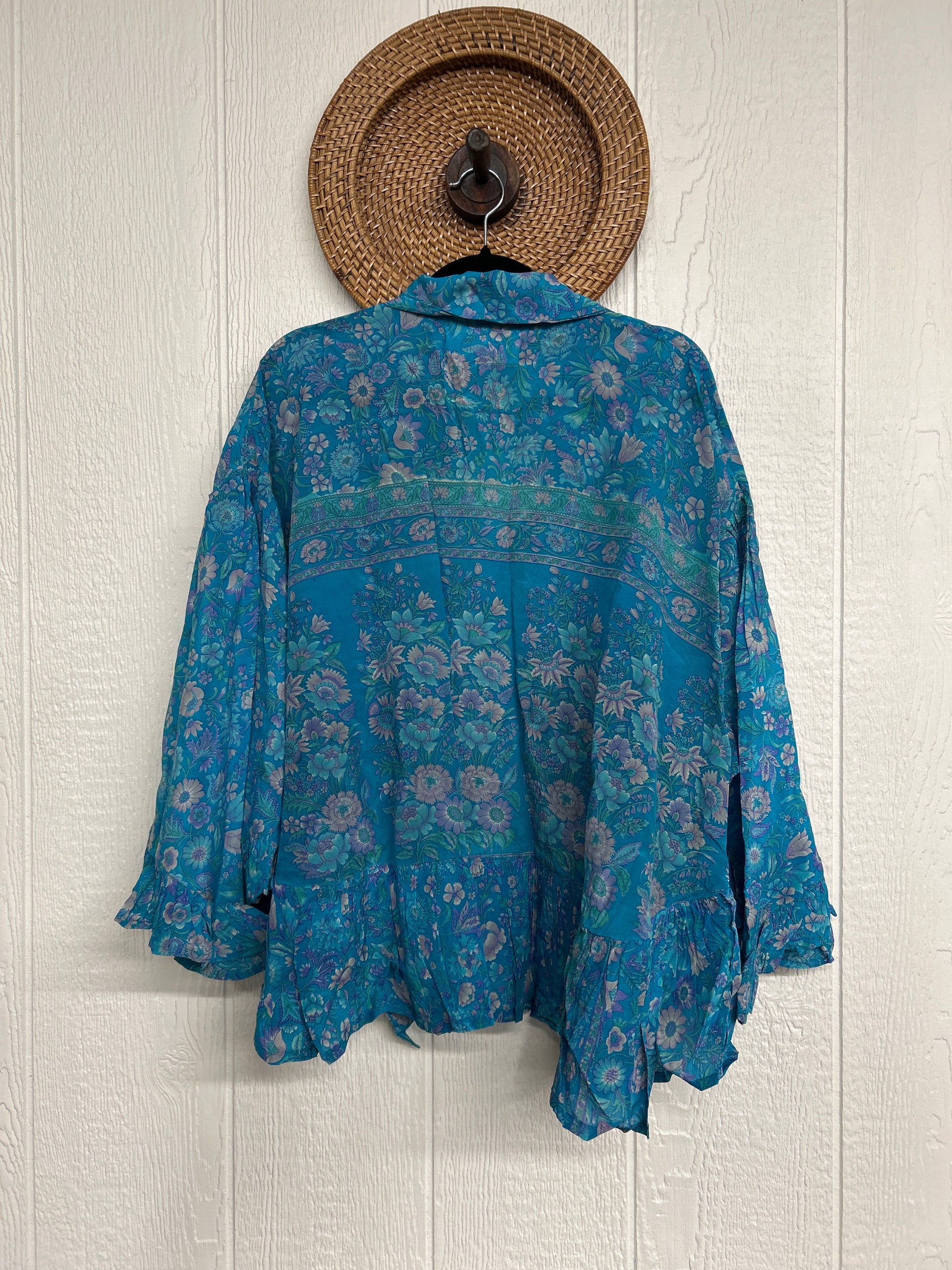 Crafted from vintage crepe sari this romantic piece features ruffles throughout, tie closure on the neck that can be opened or closed, fully functional button placket, high low hem, bell sleeve.
