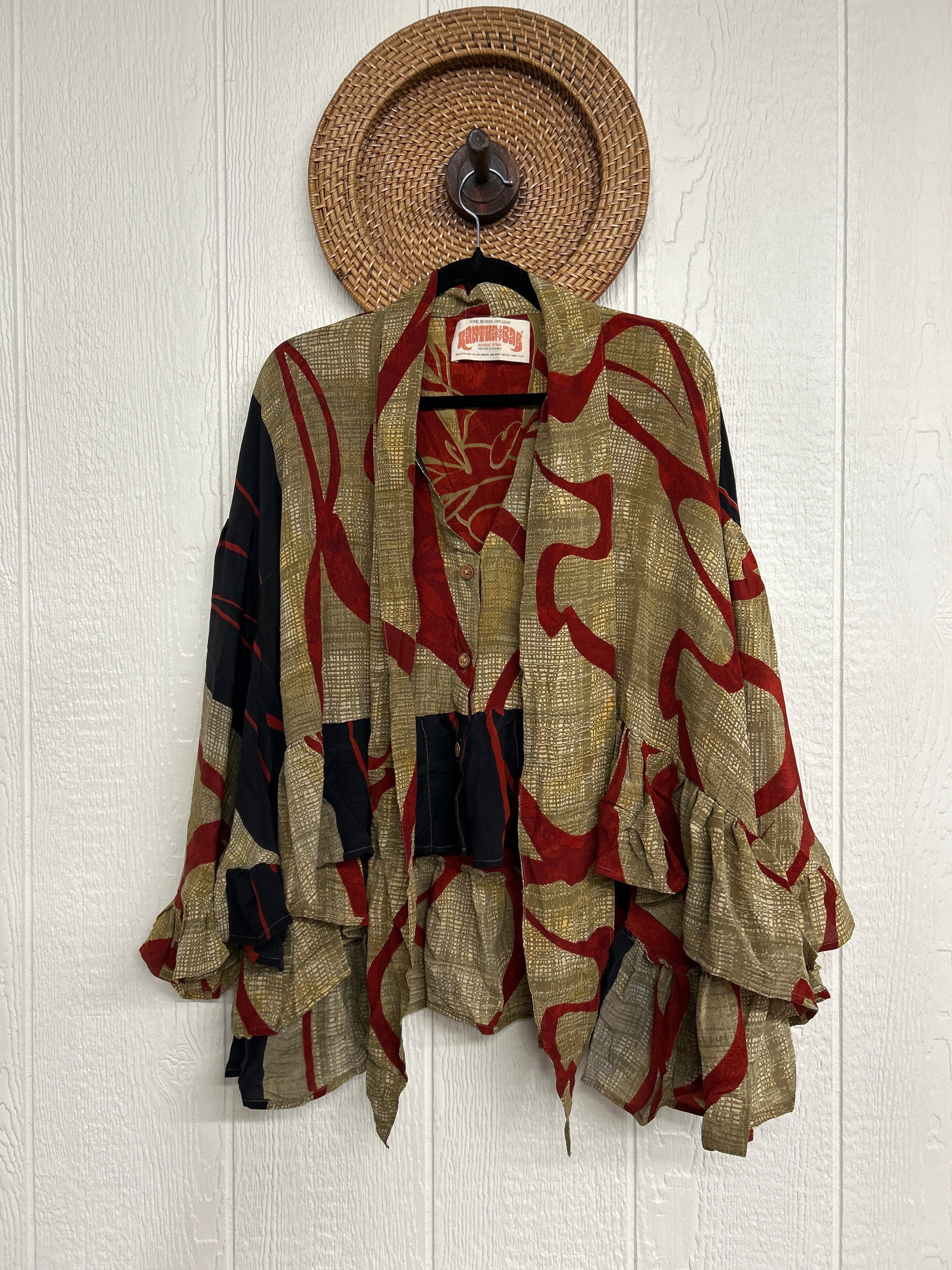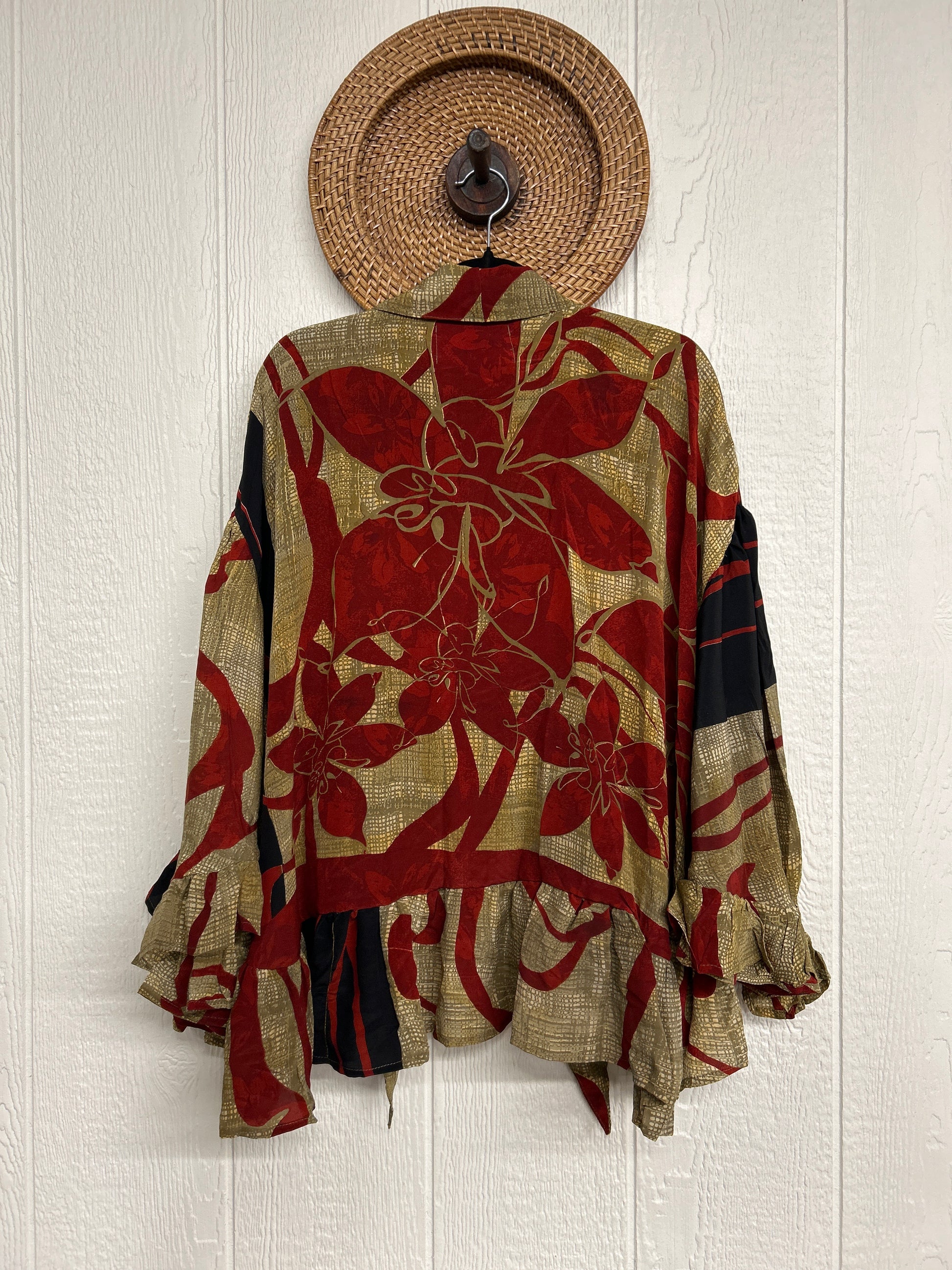 Crafted from vintage crepe sari this romantic piece features ruffles throughout, tie closure on the neck that can be opened or closed, fully functional button placket, high low hem, bell sleeve.