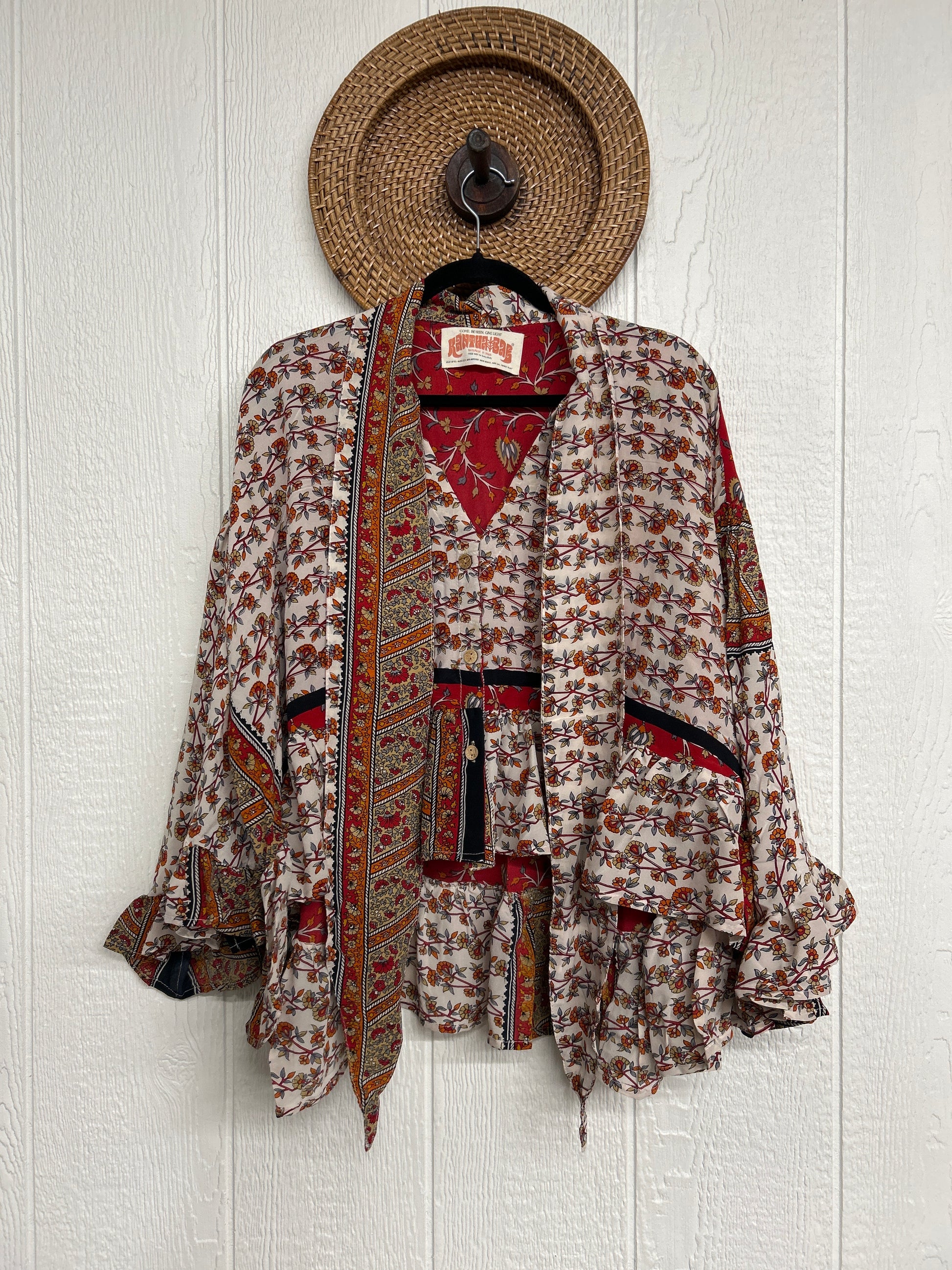 Crafted from vintage crepe sari this romantic piece features ruffles throughout, tie closure on the neck that can be opened or closed, fully functional button placket, high low hem, bell sleeve.