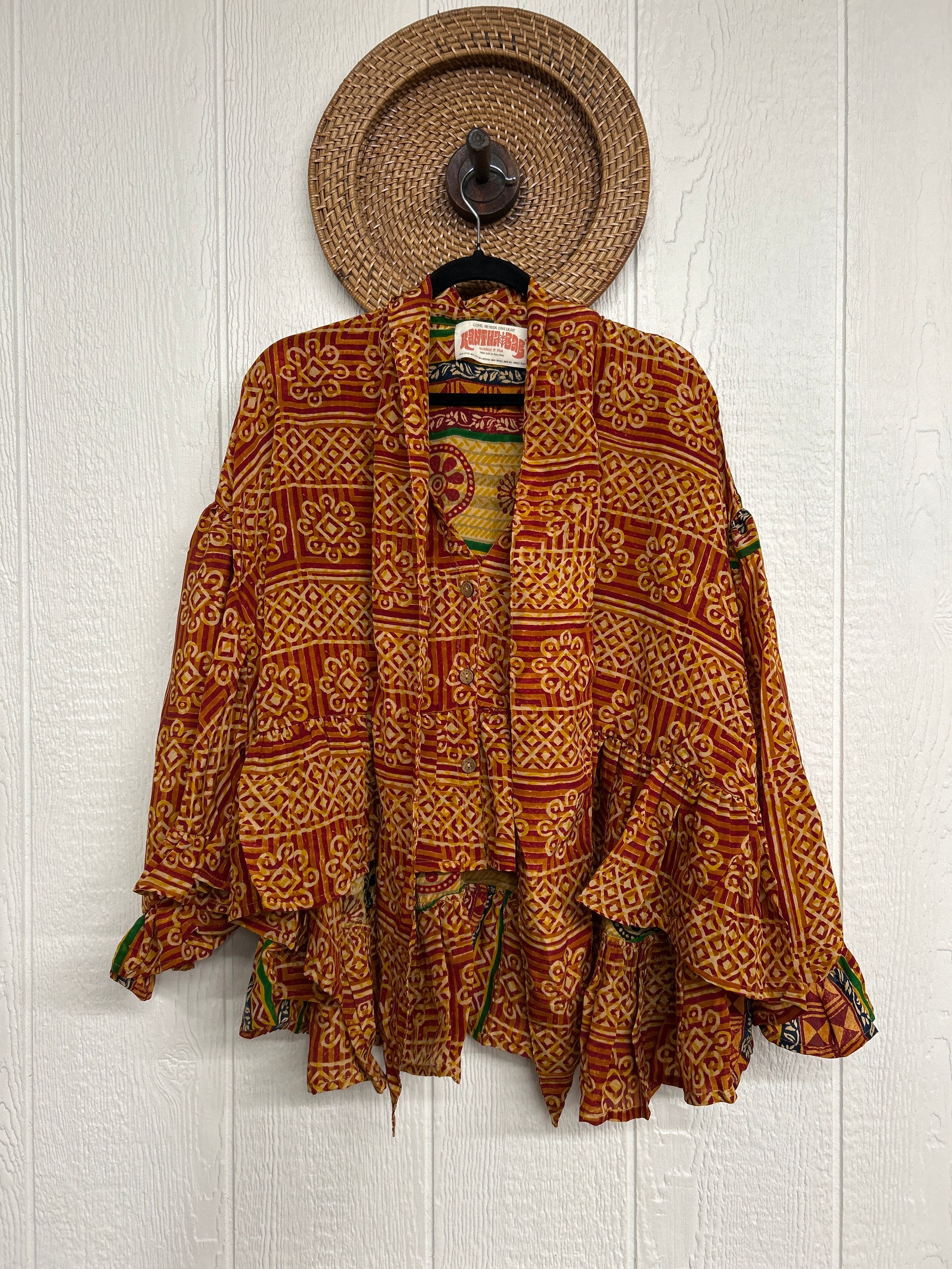 Crafted from vintage crepe sari this romantic piece features ruffles throughout, tie closure on the neck that can be opened or closed, fully functional button placket, high low hem, bell sleeve.