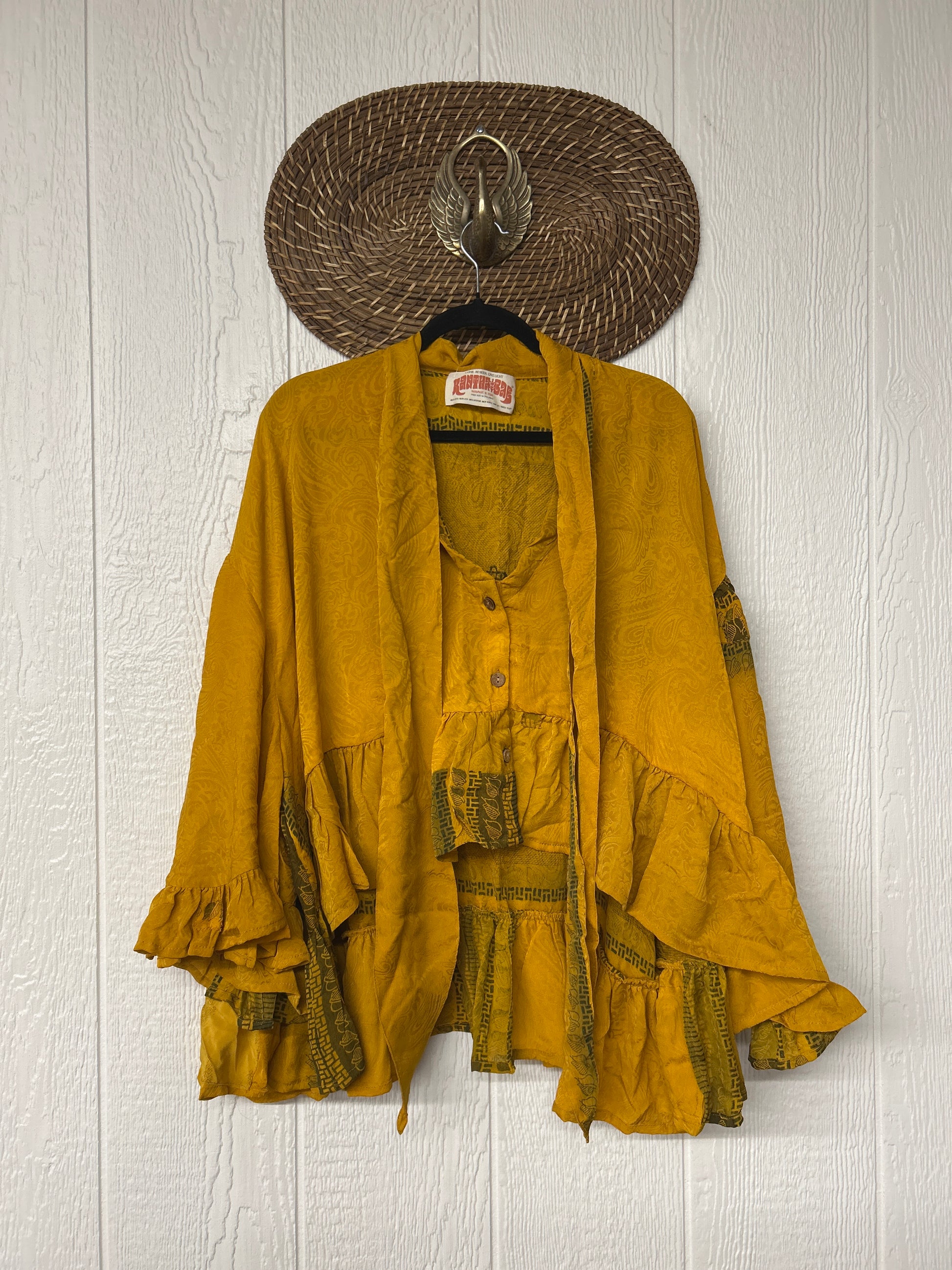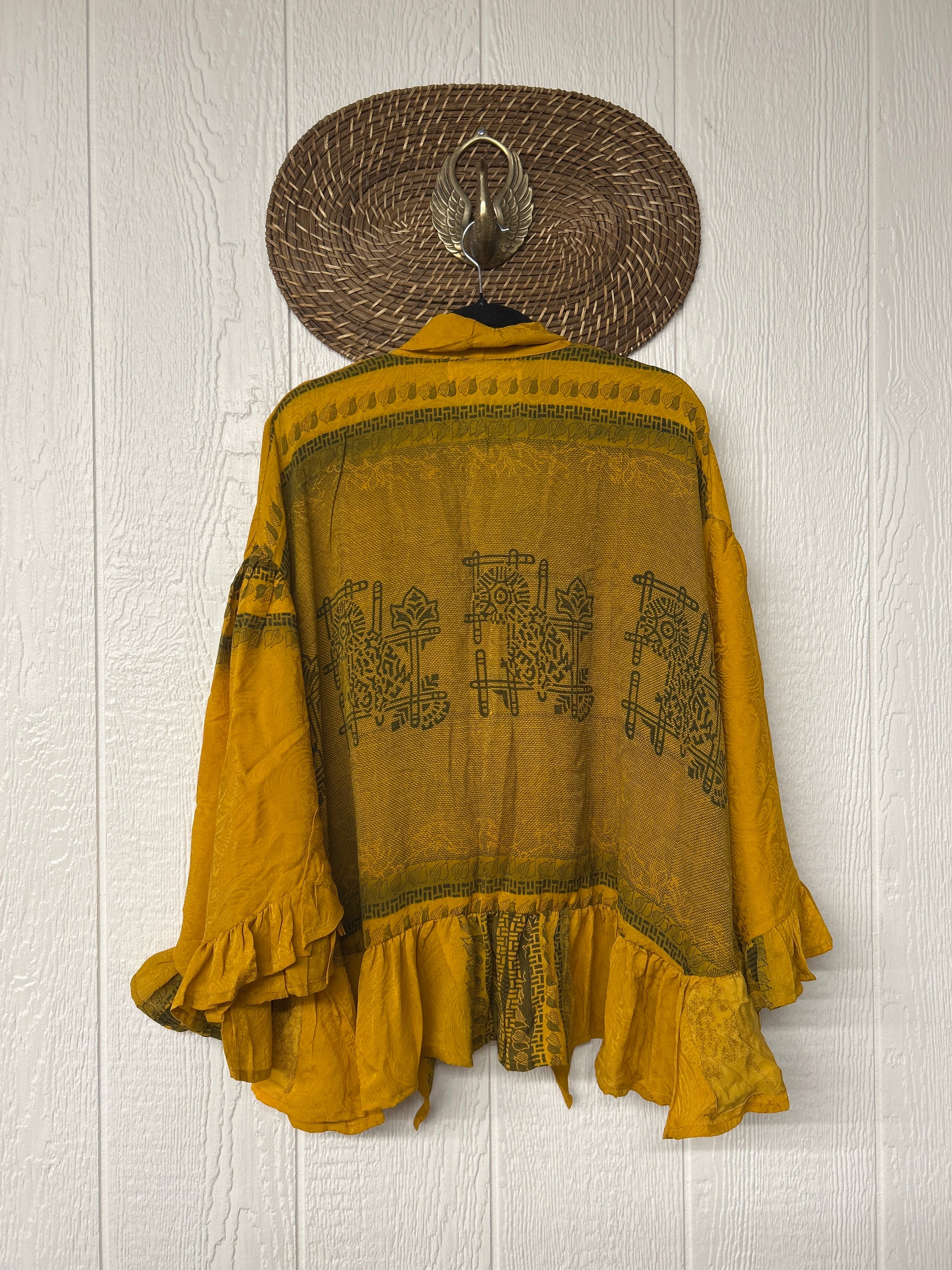 Crafted from vintage crepe sari this romantic piece features ruffles throughout, tie closure on the neck that can be opened or closed, fully functional button placket, high low hem, bell sleeve.