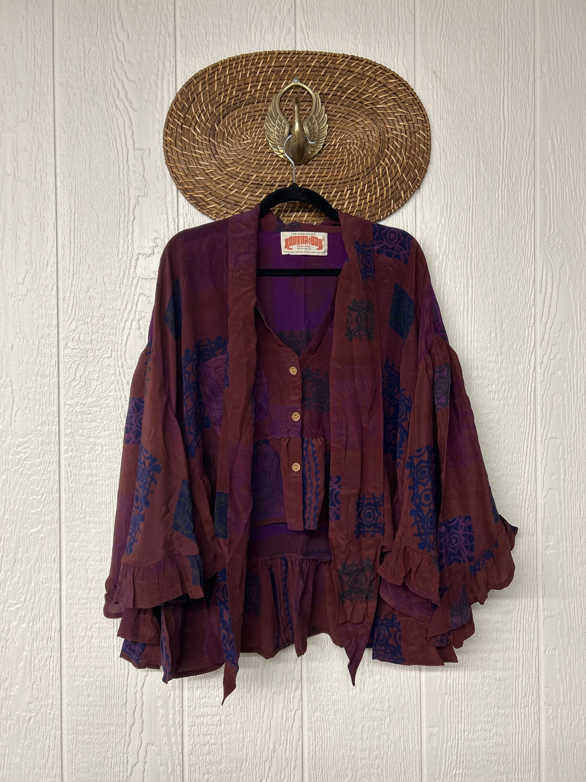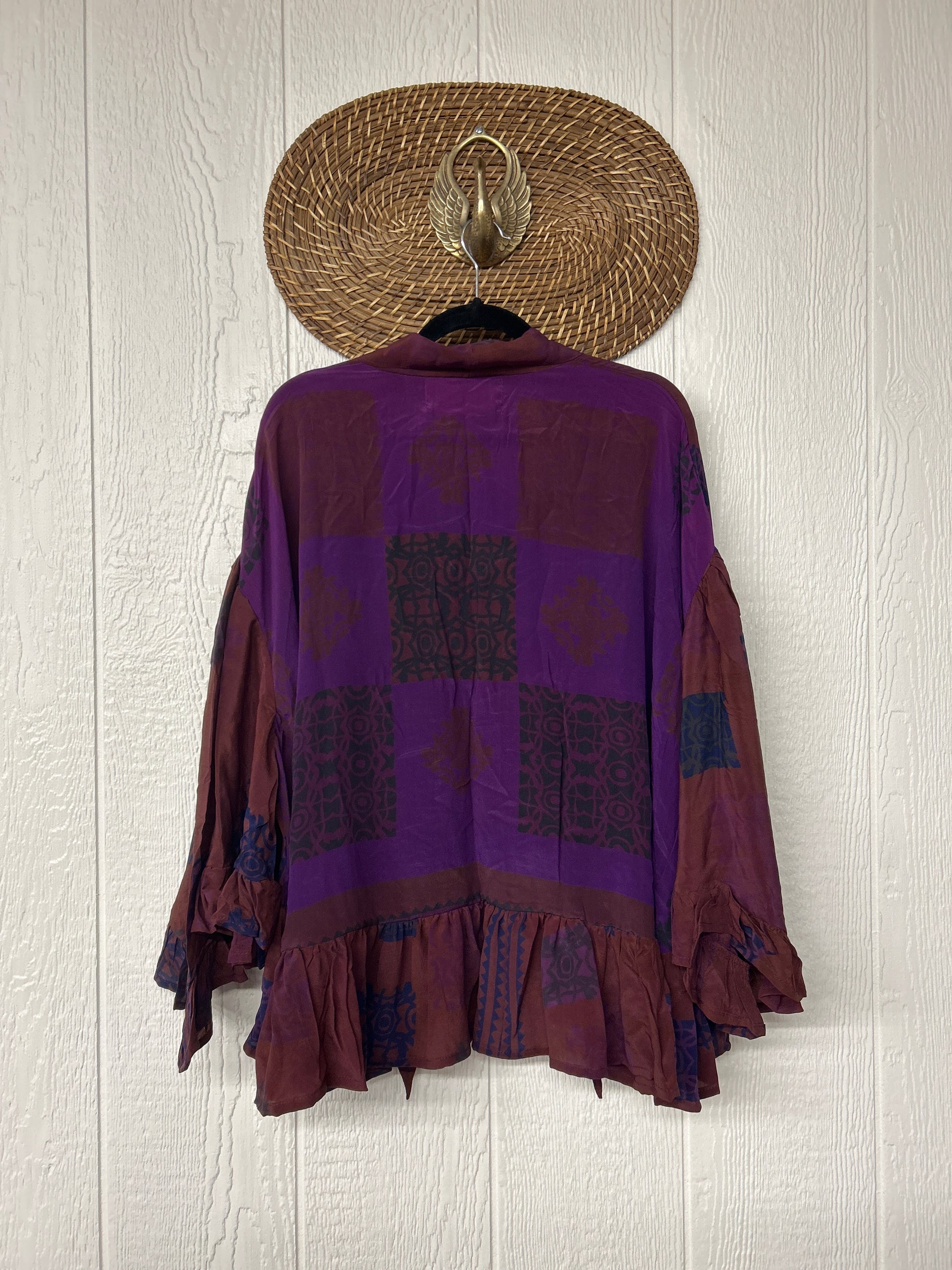 Crafted from vintage crepe sari this romantic piece features ruffles throughout, tie closure on the neck that can be opened or closed, fully functional button placket, high low hem, bell sleeve.
