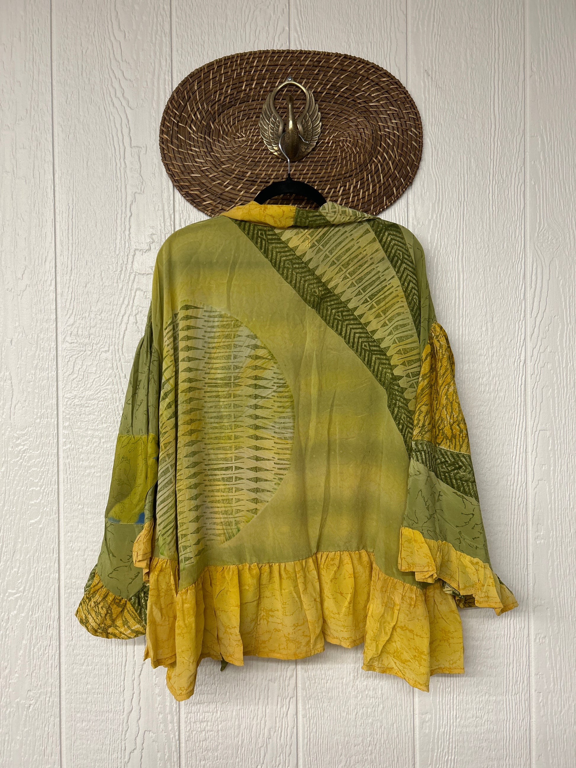 Crafted from vintage crepe sari this romantic piece features ruffles throughout, tie closure on the neck that can be opened or closed, fully functional button placket, high low hem, bell sleeve.