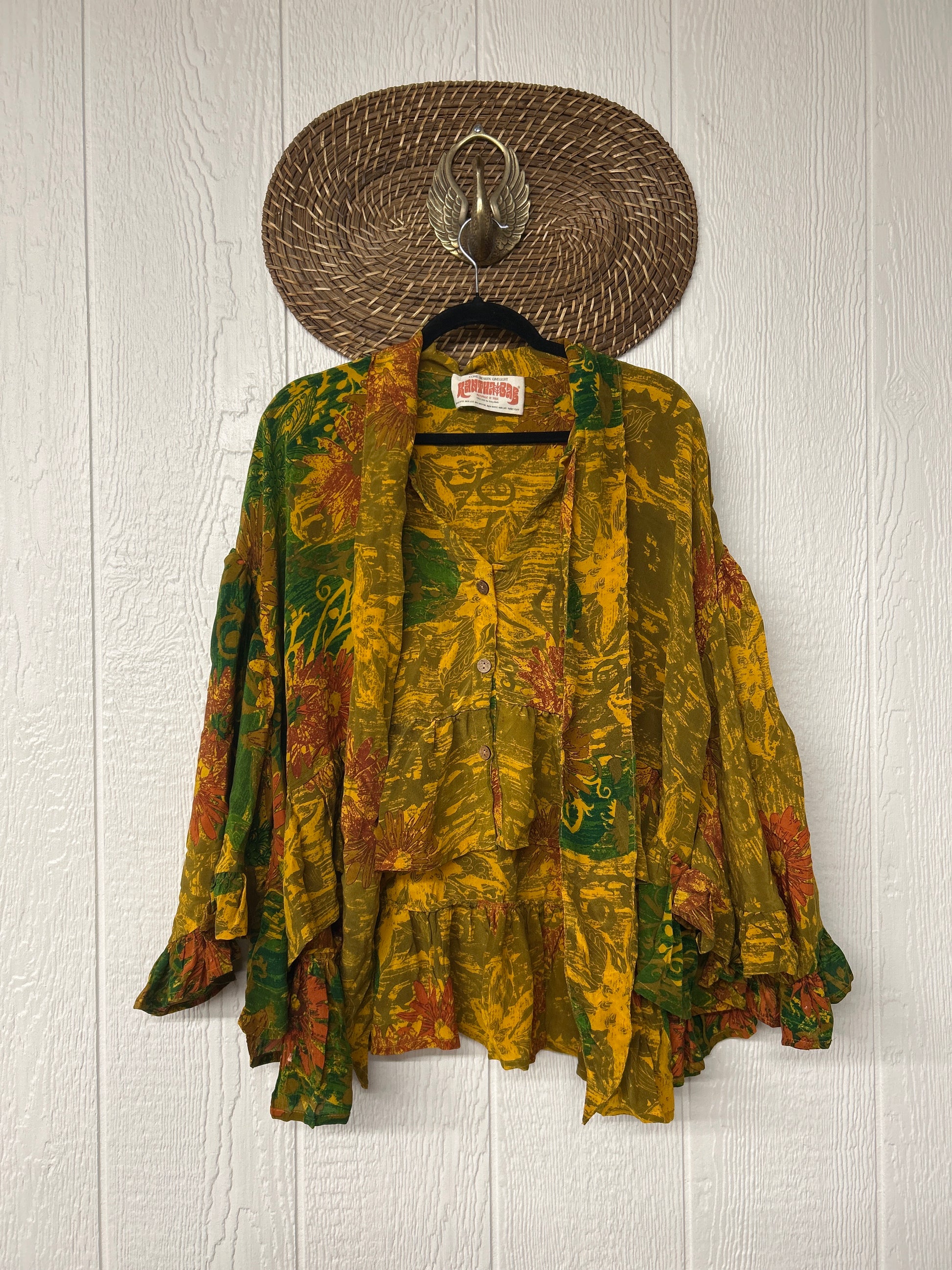Crafted from vintage crepe sari this romantic piece features ruffles throughout, tie closure on the neck that can be opened or closed, fully functional button placket, high low hem, bell sleeve.