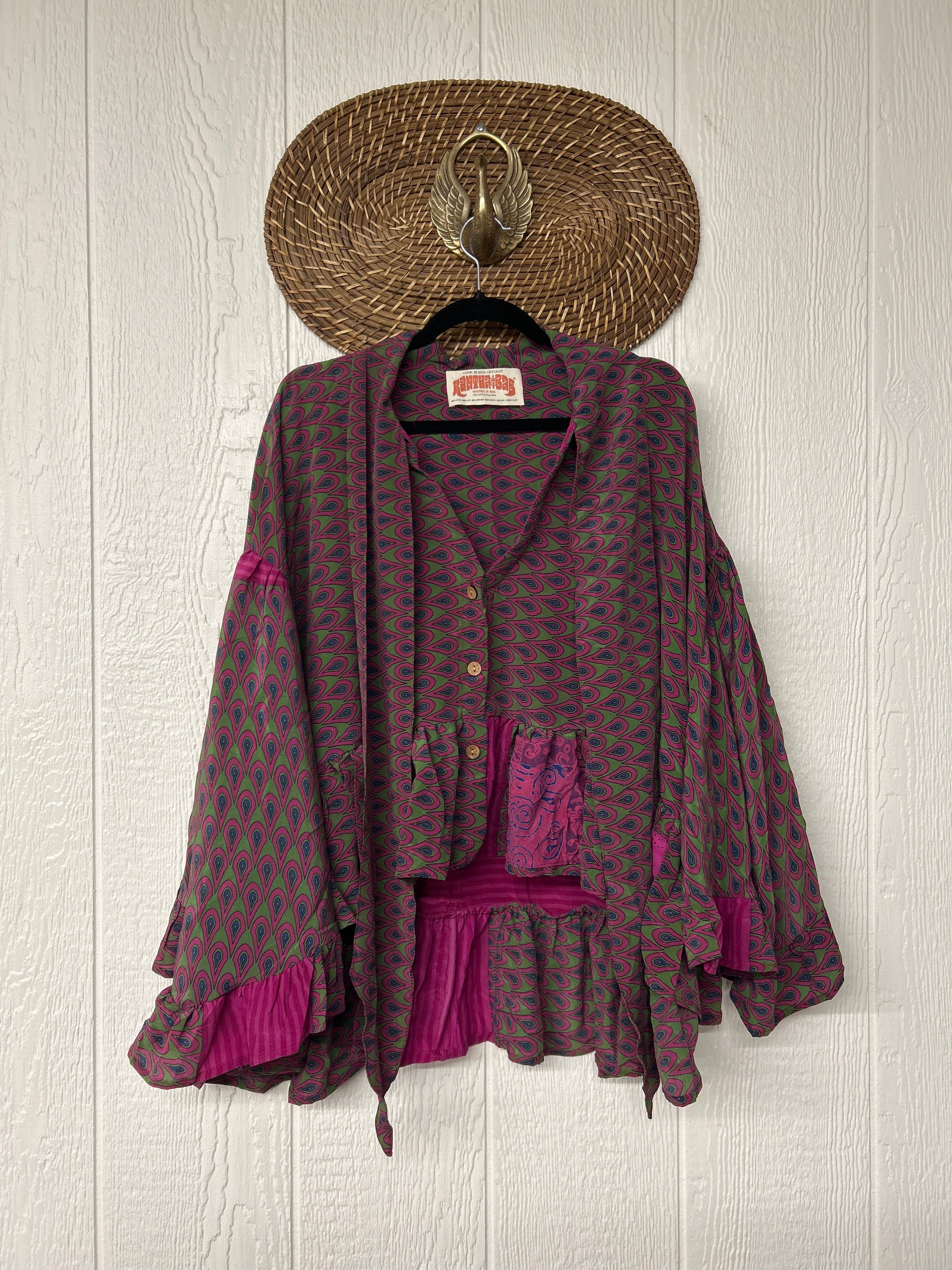 Crafted from vintage crepe sari this romantic piece features ruffles throughout, tie closure on the neck that can be opened or closed, fully functional button placket, high low hem, bell sleeve.