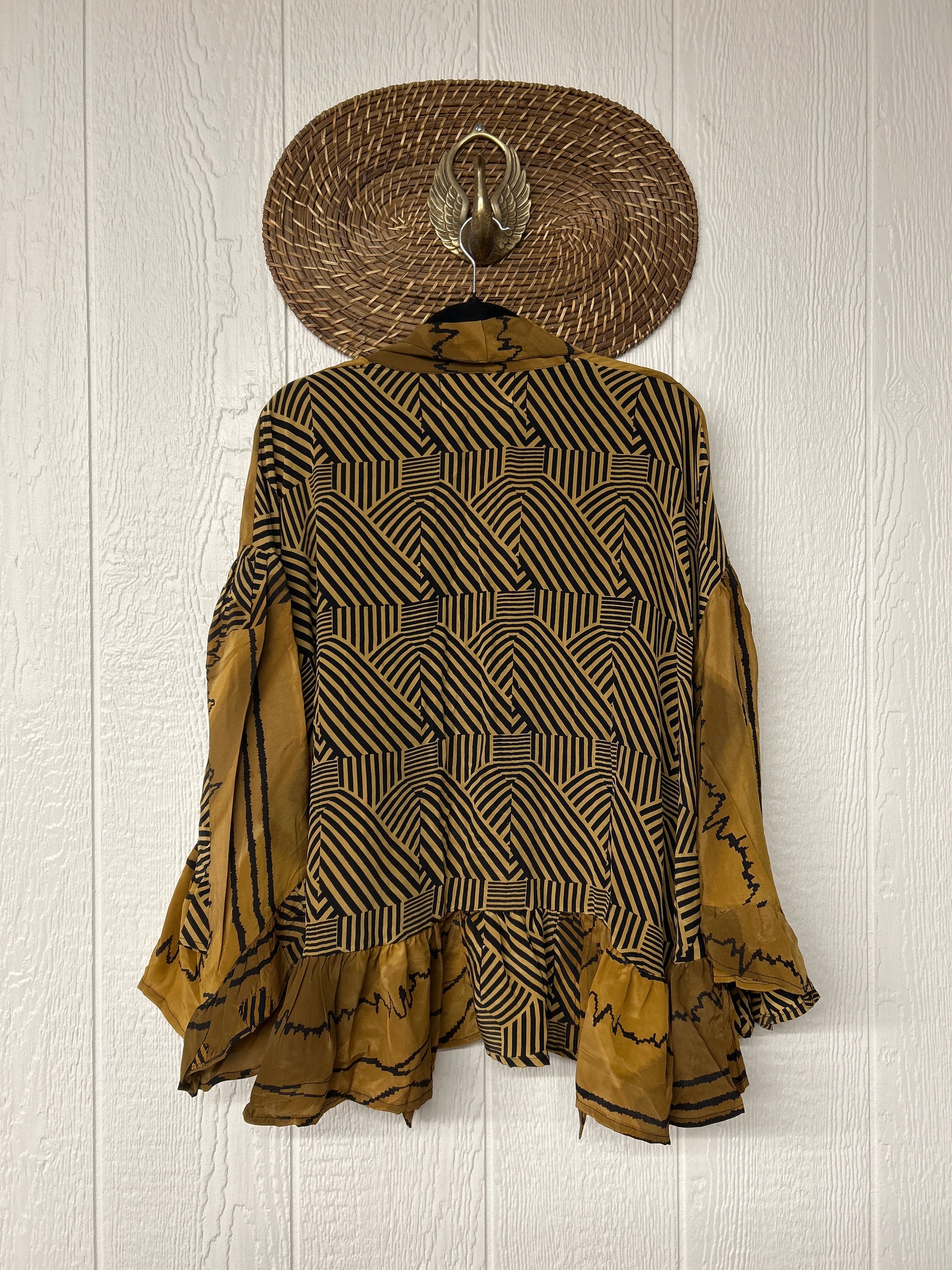 Crafted from vintage crepe sari this romantic piece features ruffles throughout, tie closure on the neck that can be opened or closed, fully functional button placket, high low hem, bell sleeve.