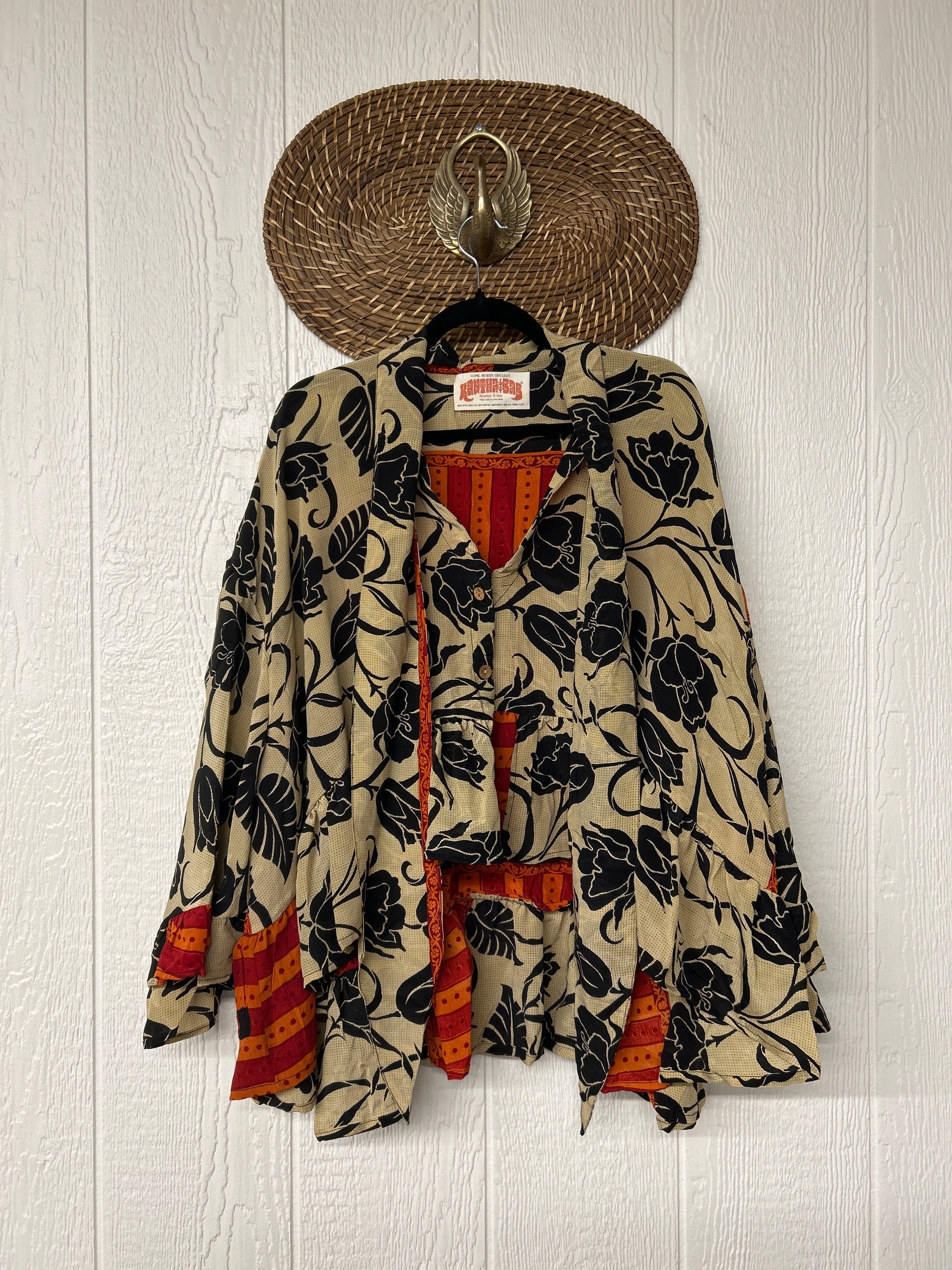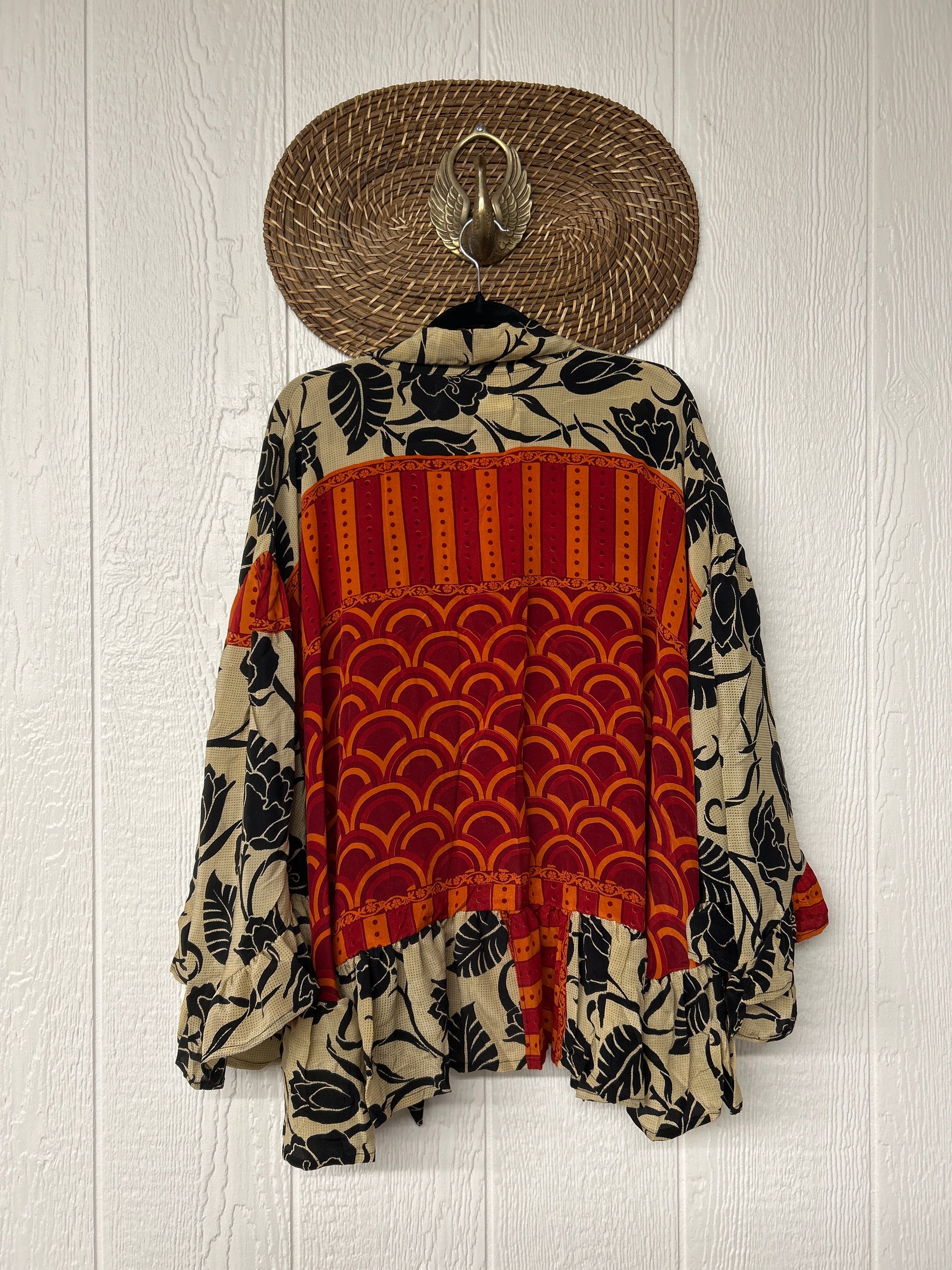 Crafted from vintage crepe sari this romantic piece features ruffles throughout, tie closure on the neck that can be opened or closed, fully functional button placket, high low hem, bell sleeve.