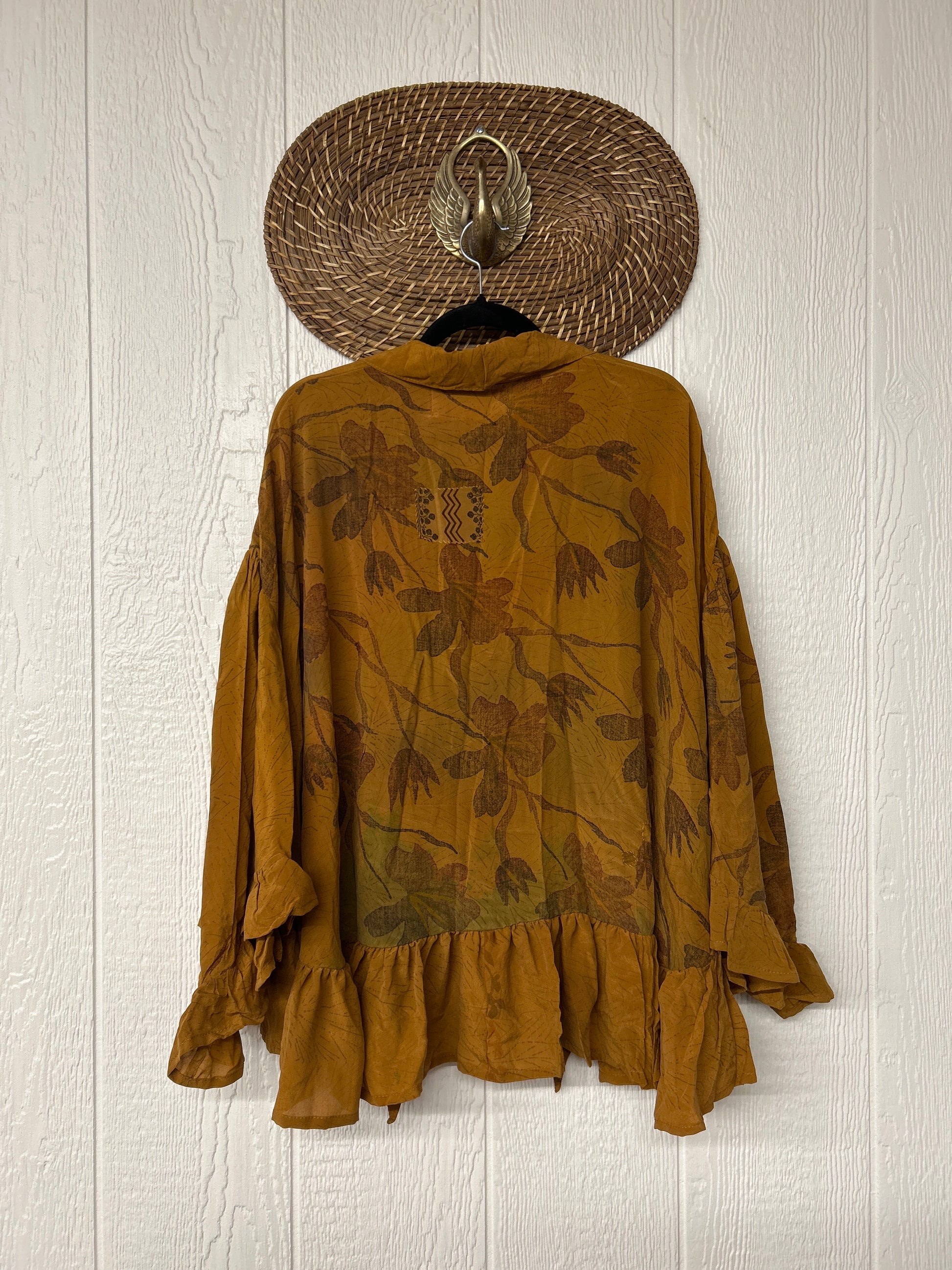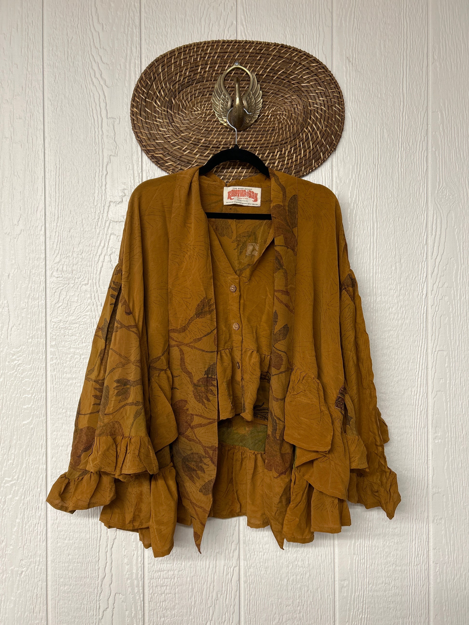 Crafted from vintage crepe sari this romantic piece features ruffles throughout, tie closure on the neck that can be opened or closed, fully functional button placket, high low hem, bell sleeve.