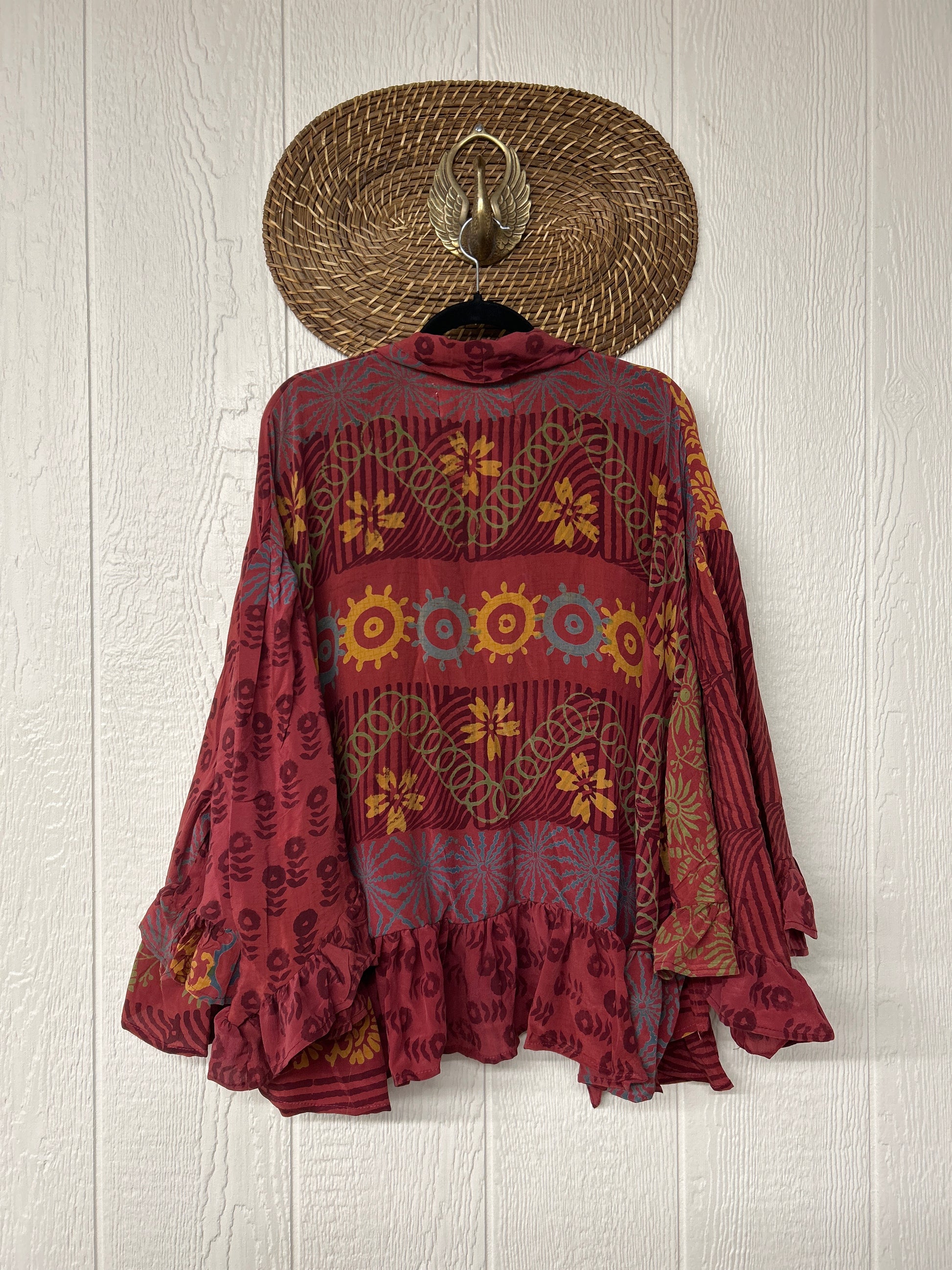 Crafted from vintage crepe sari this romantic piece features ruffles throughout, tie closure on the neck that can be opened or closed, fully functional button placket, high low hem, bell sleeve.