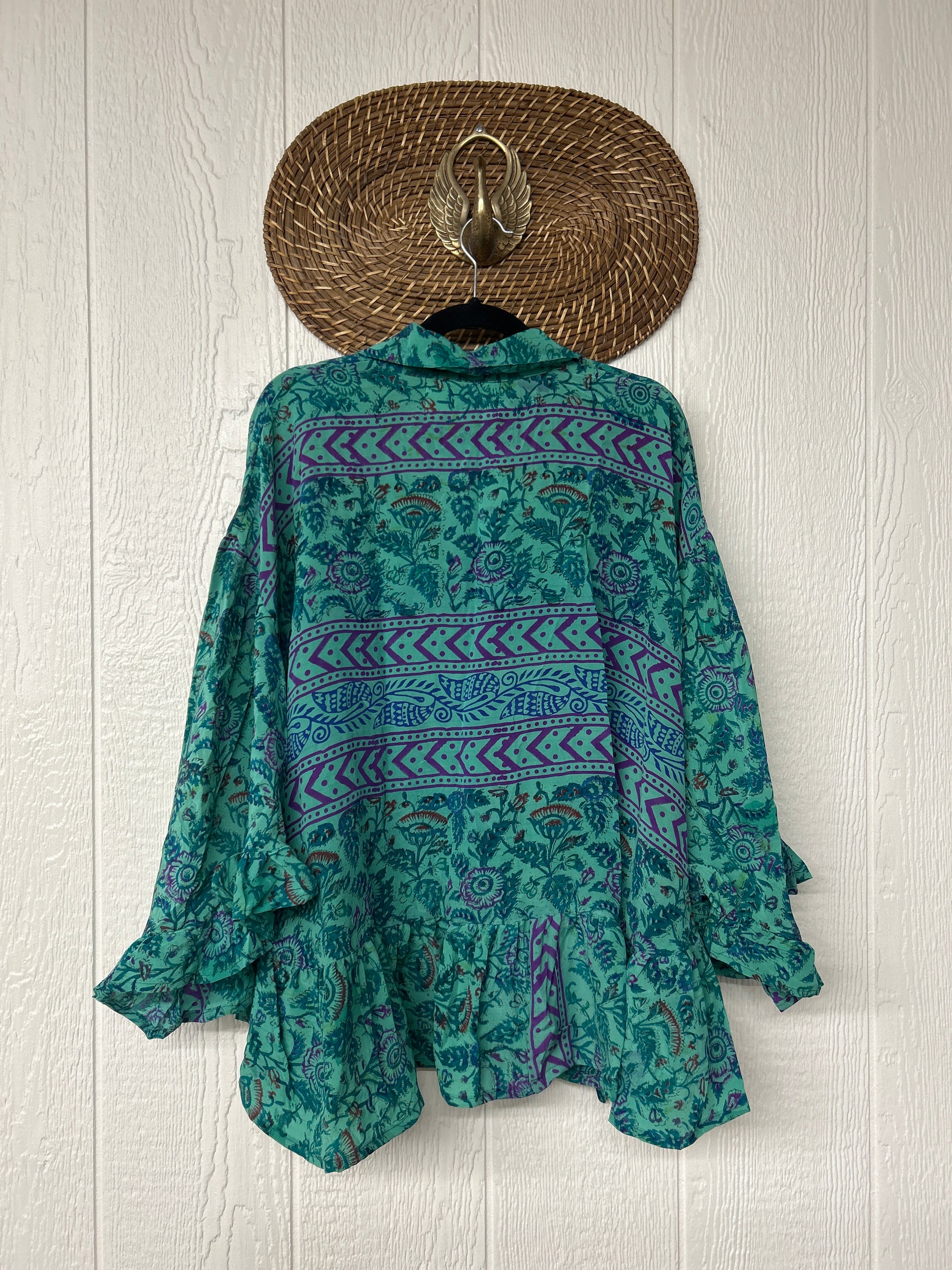 Crafted from vintage crepe sari this romantic piece features ruffles throughout, tie closure on the neck that can be opened or closed, fully functional button placket, high low hem, bell sleeve.