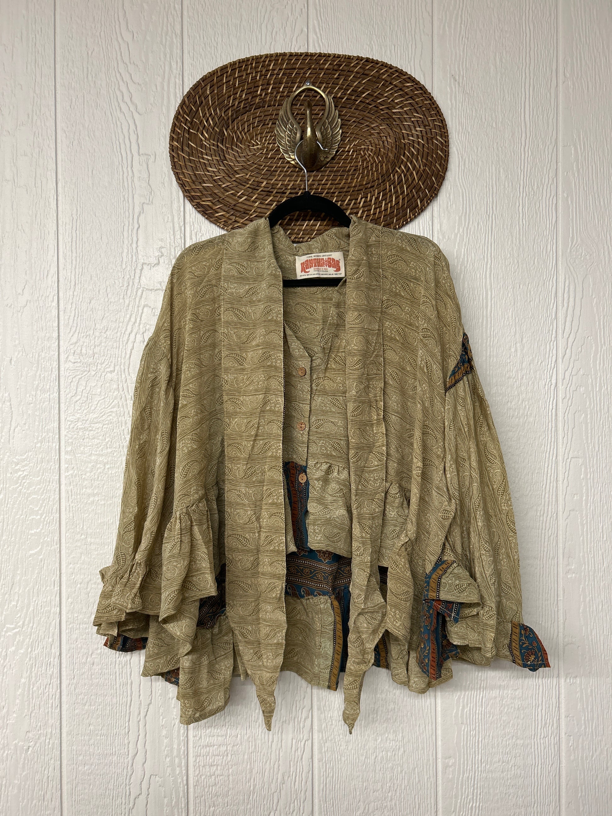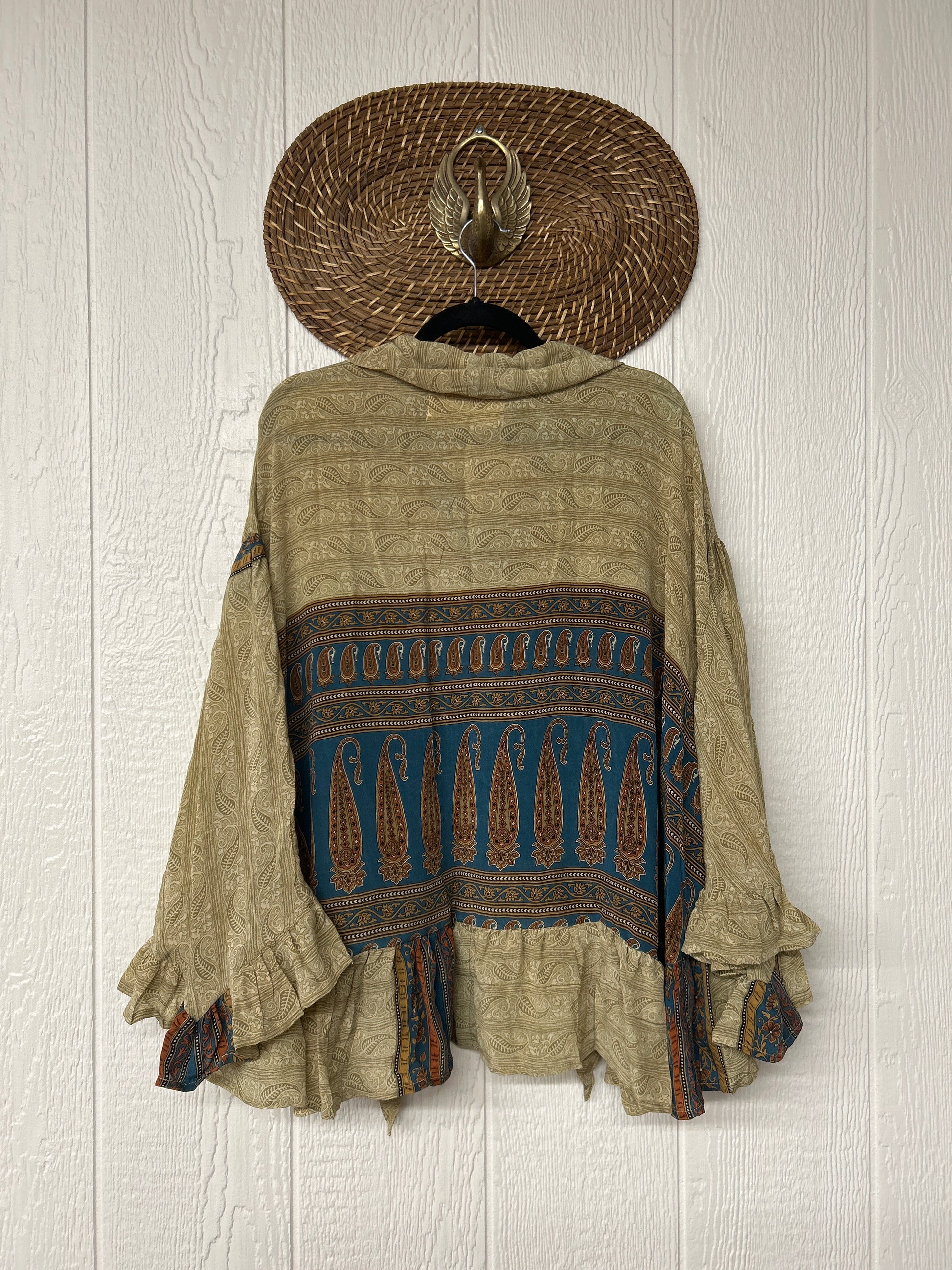 Crafted from vintage crepe sari this romantic piece features ruffles throughout, tie closure on the neck that can be opened or closed, fully functional button placket, high low hem, bell sleeve.