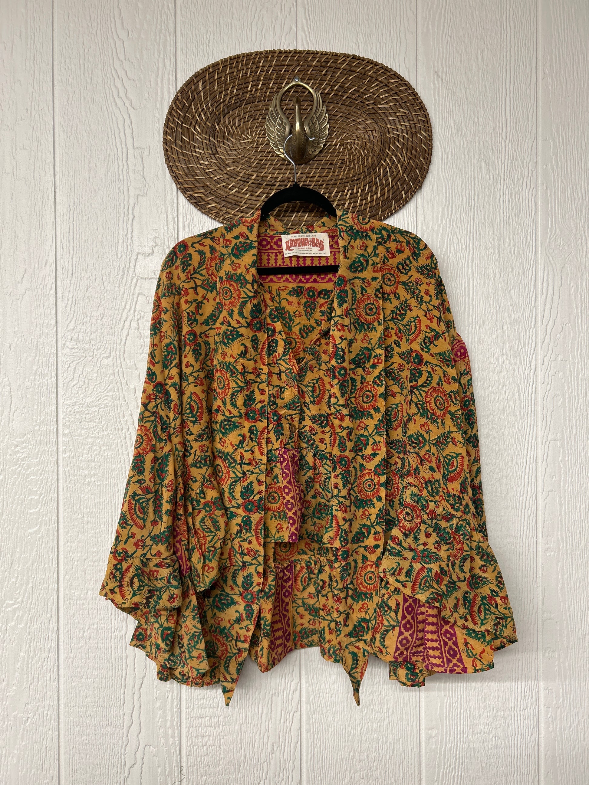 Crafted from vintage crepe sari this romantic piece features ruffles throughout, tie closure on the neck that can be opened or closed, fully functional button placket, high low hem, bell sleeve.