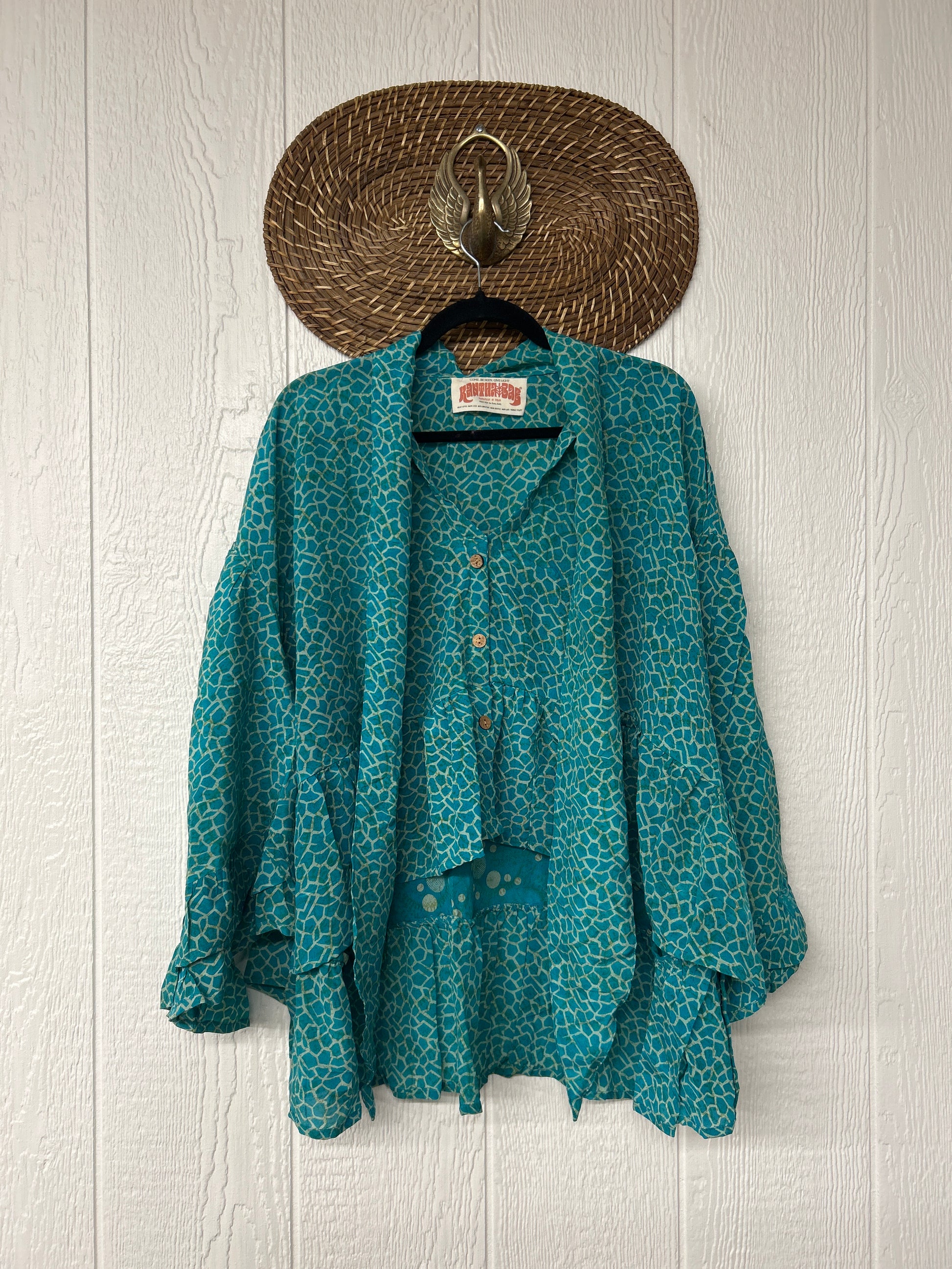 Crafted from vintage crepe sari this romantic piece features ruffles throughout, tie closure on the neck that can be opened or closed, fully functional button placket, high low hem, bell sleeve.