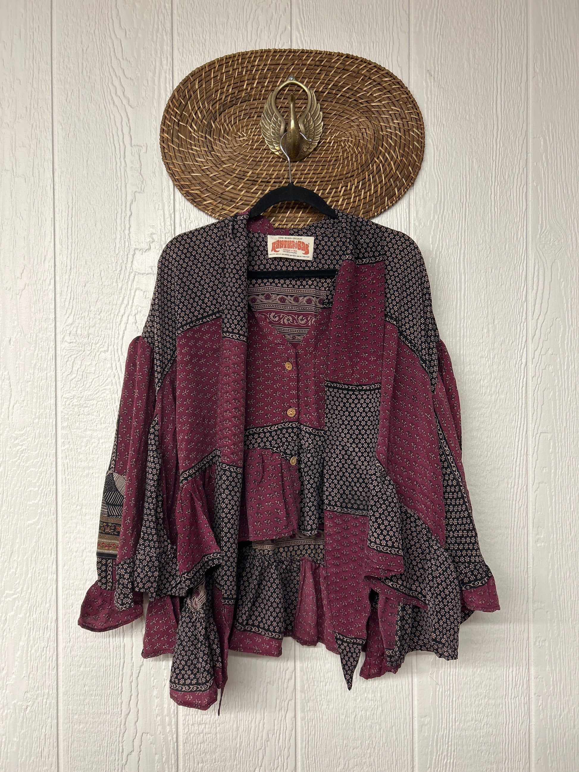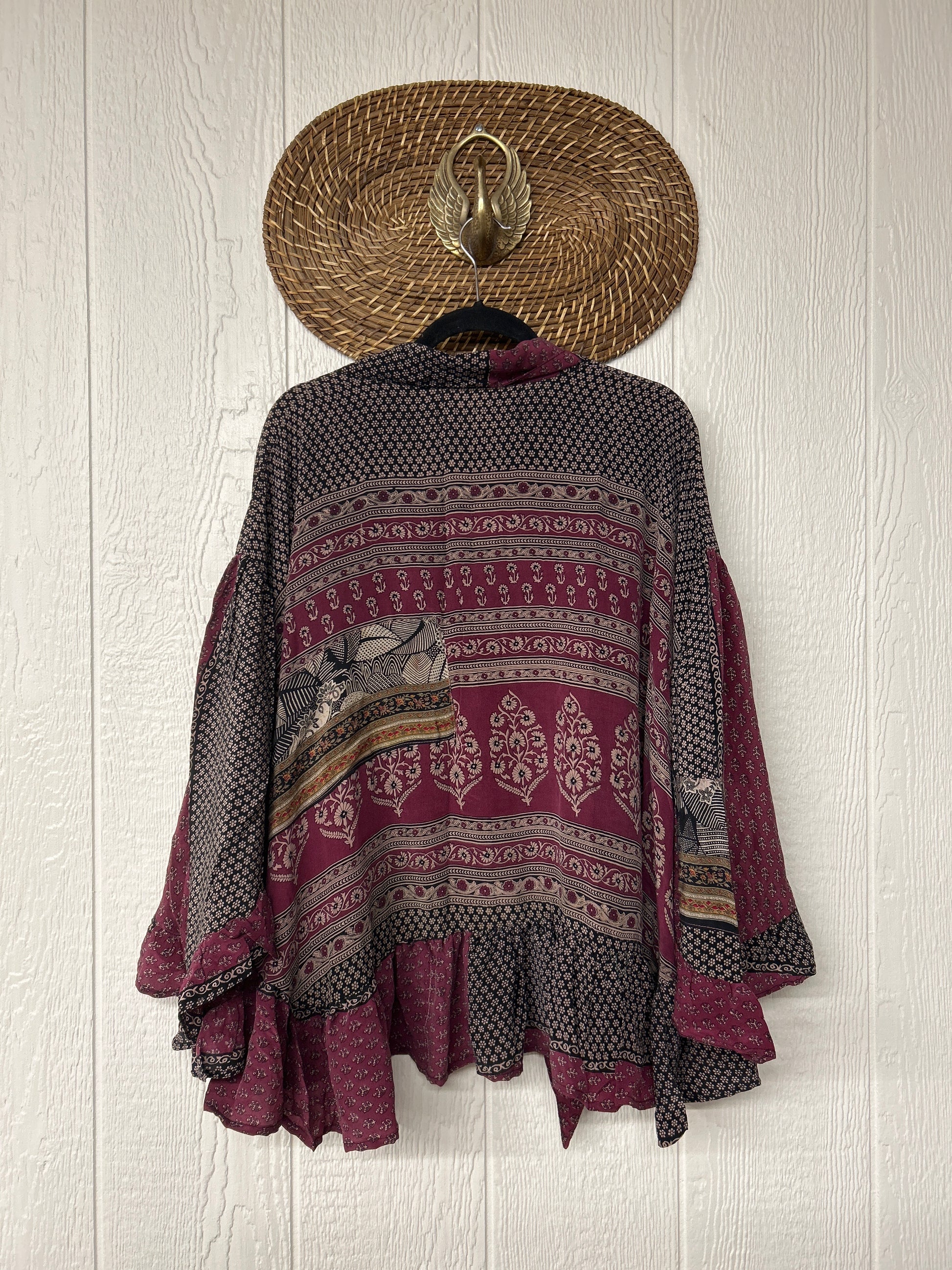 Crafted from vintage crepe sari this romantic piece features ruffles throughout, tie closure on the neck that can be opened or closed, fully functional button placket, high low hem, bell sleeve.