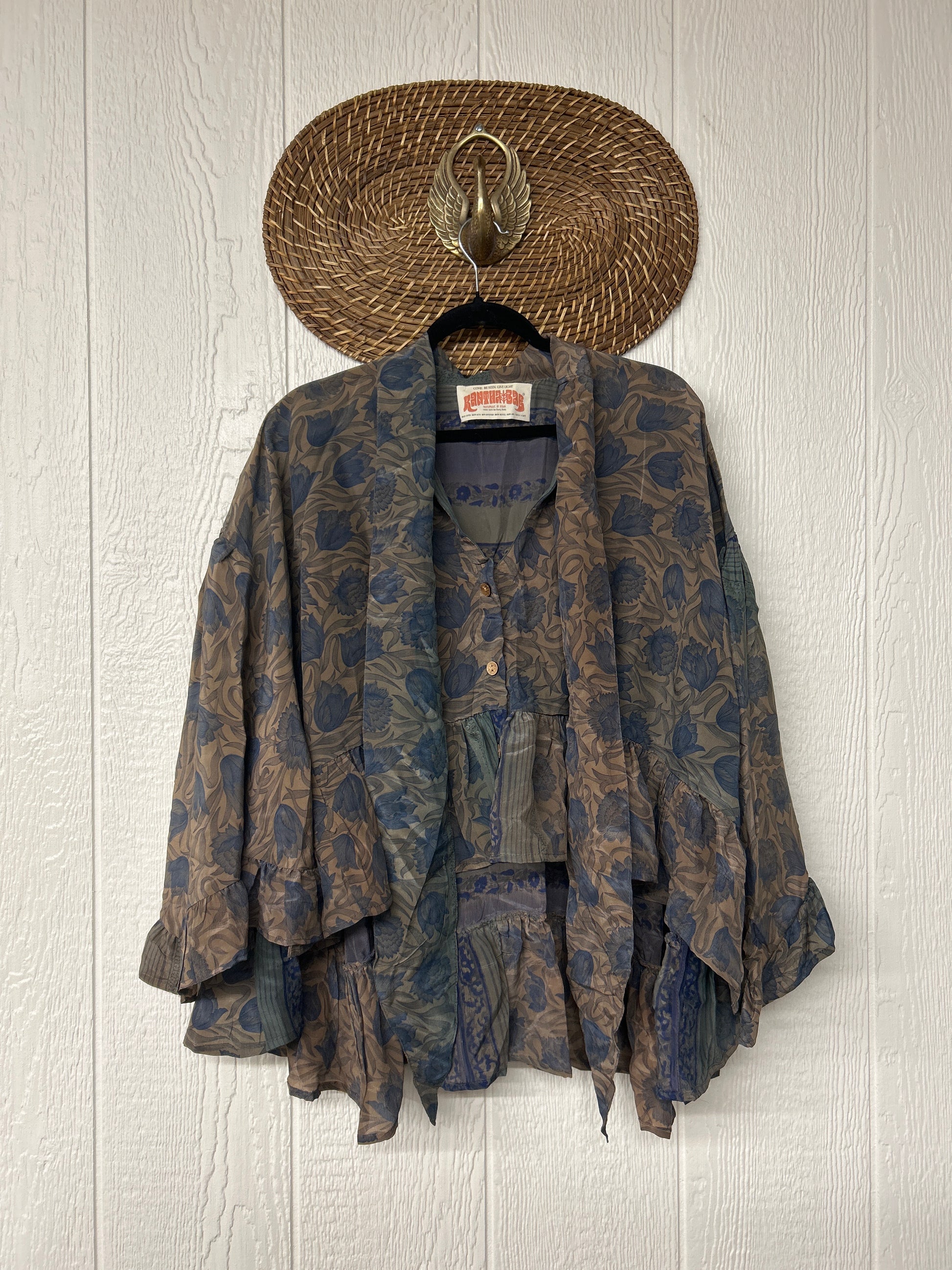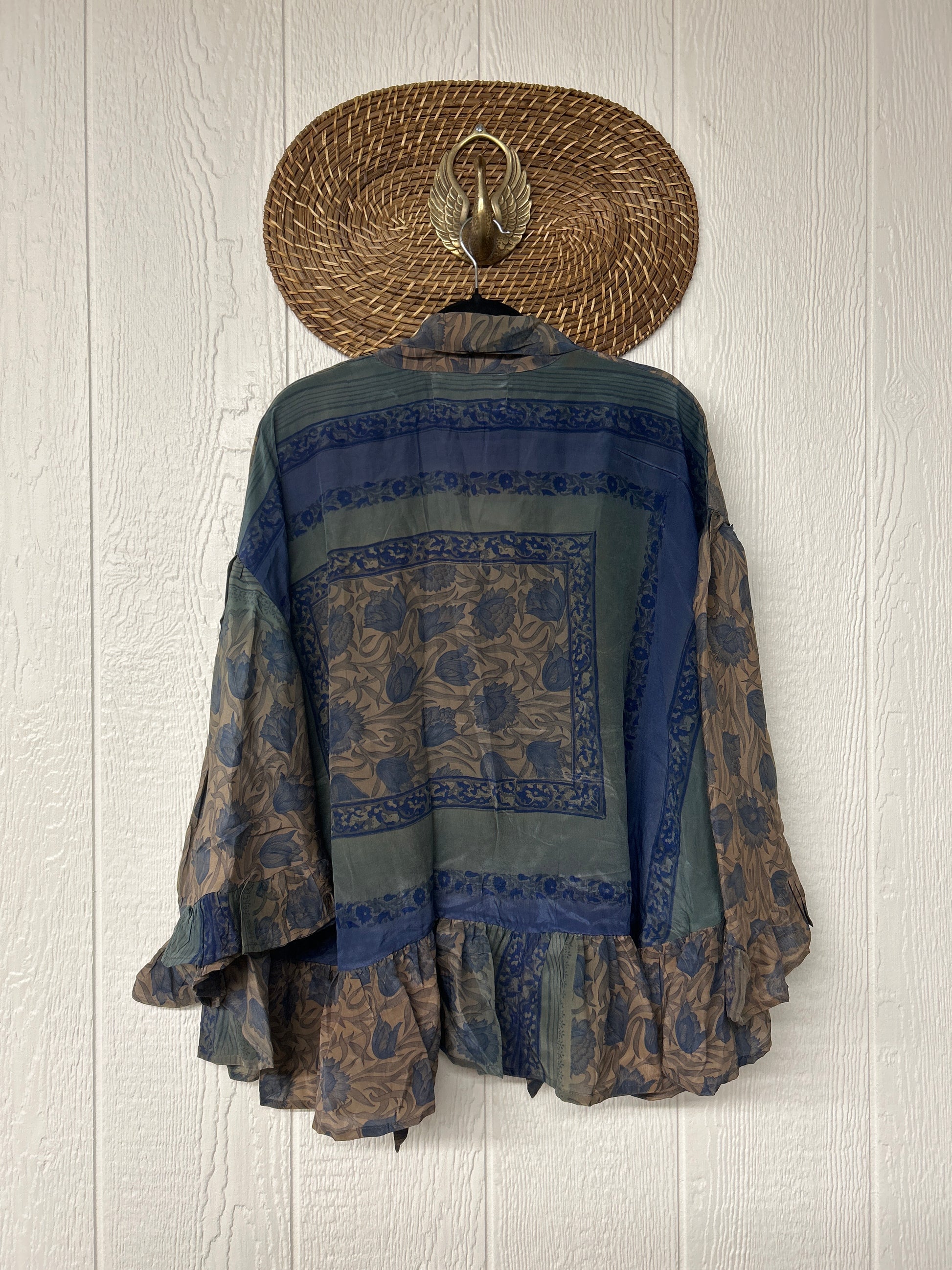 Crafted from vintage crepe sari this romantic piece features ruffles throughout, tie closure on the neck that can be opened or closed, fully functional button placket, high low hem, bell sleeve.