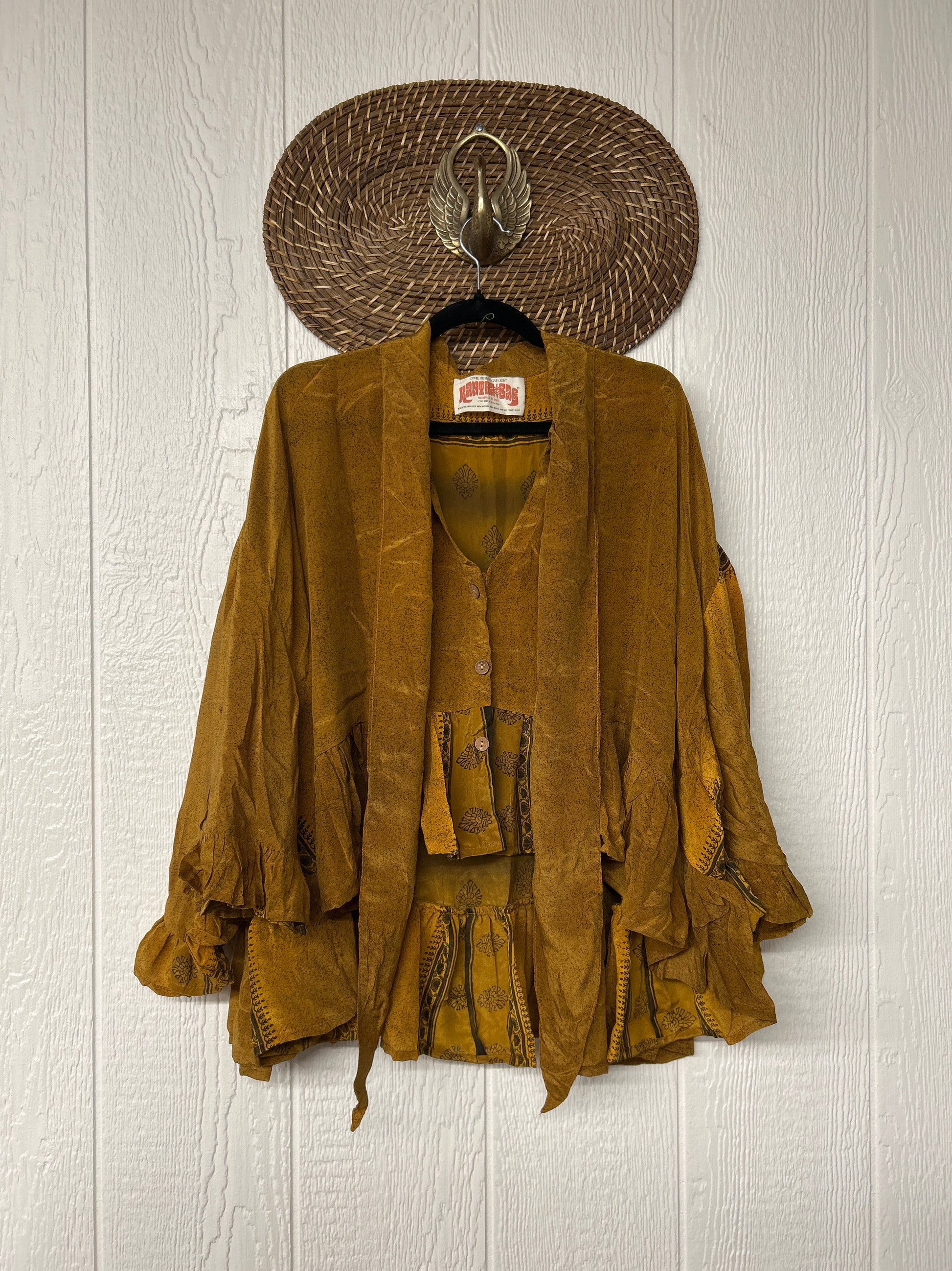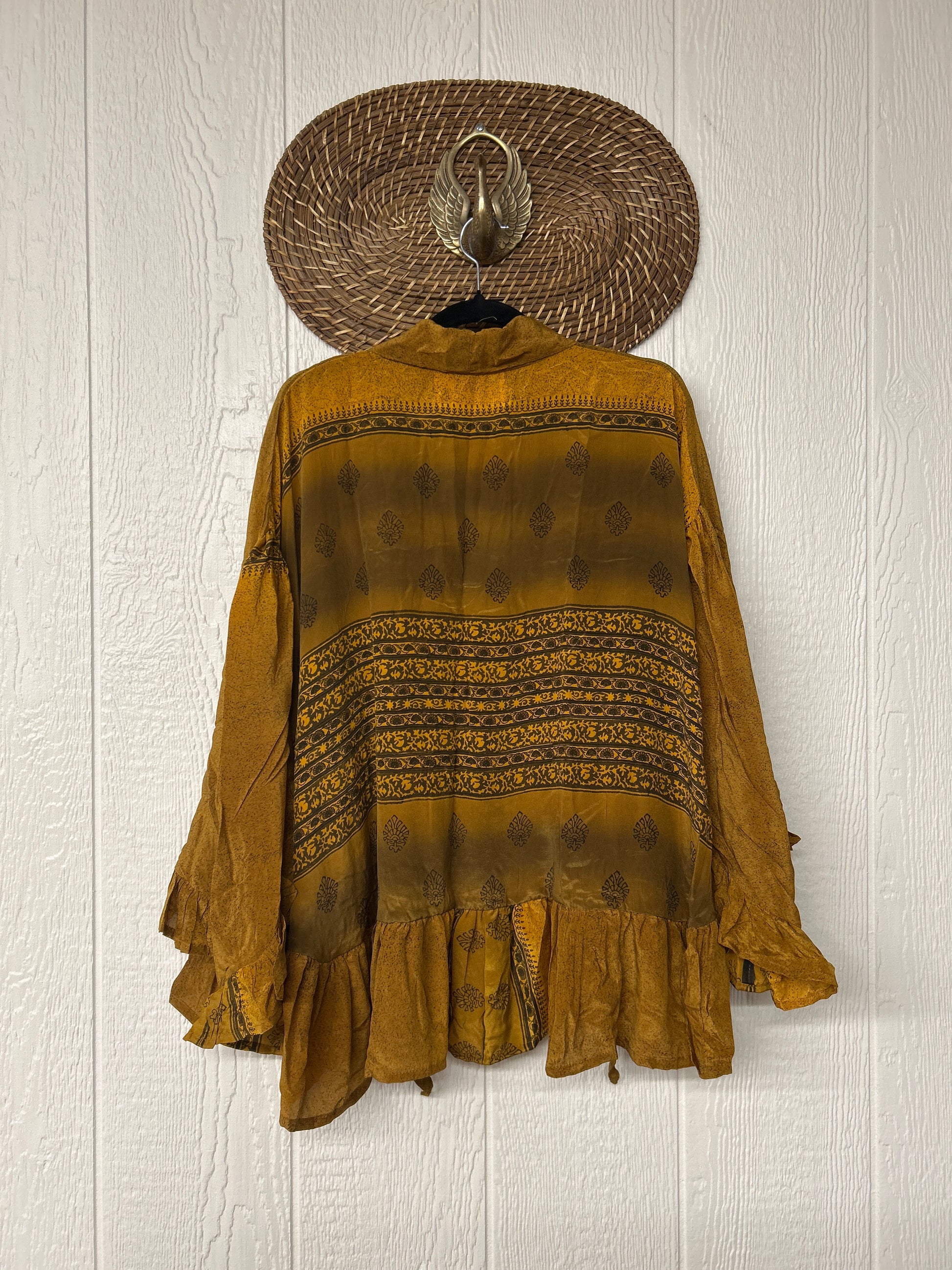 Crafted from vintage crepe sari this romantic piece features ruffles throughout, tie closure on the neck that can be opened or closed, fully functional button placket, high low hem, bell sleeve.