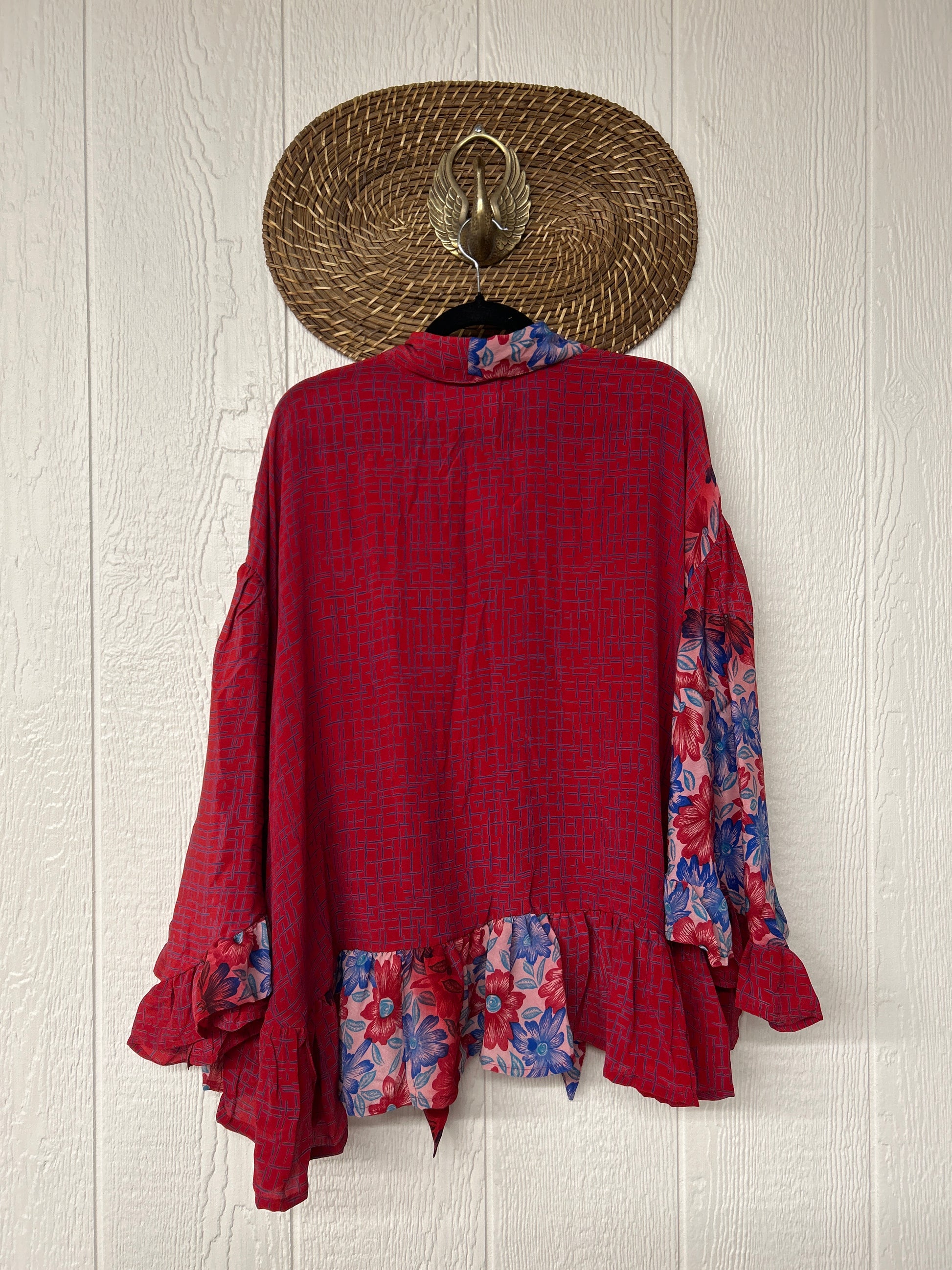 Crafted from vintage crepe sari this romantic piece features ruffles throughout, tie closure on the neck that can be opened or closed, fully functional button placket, high low hem, bell sleeve.