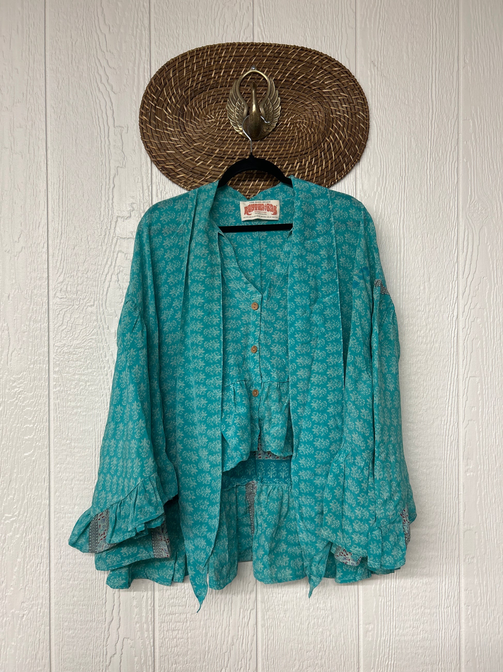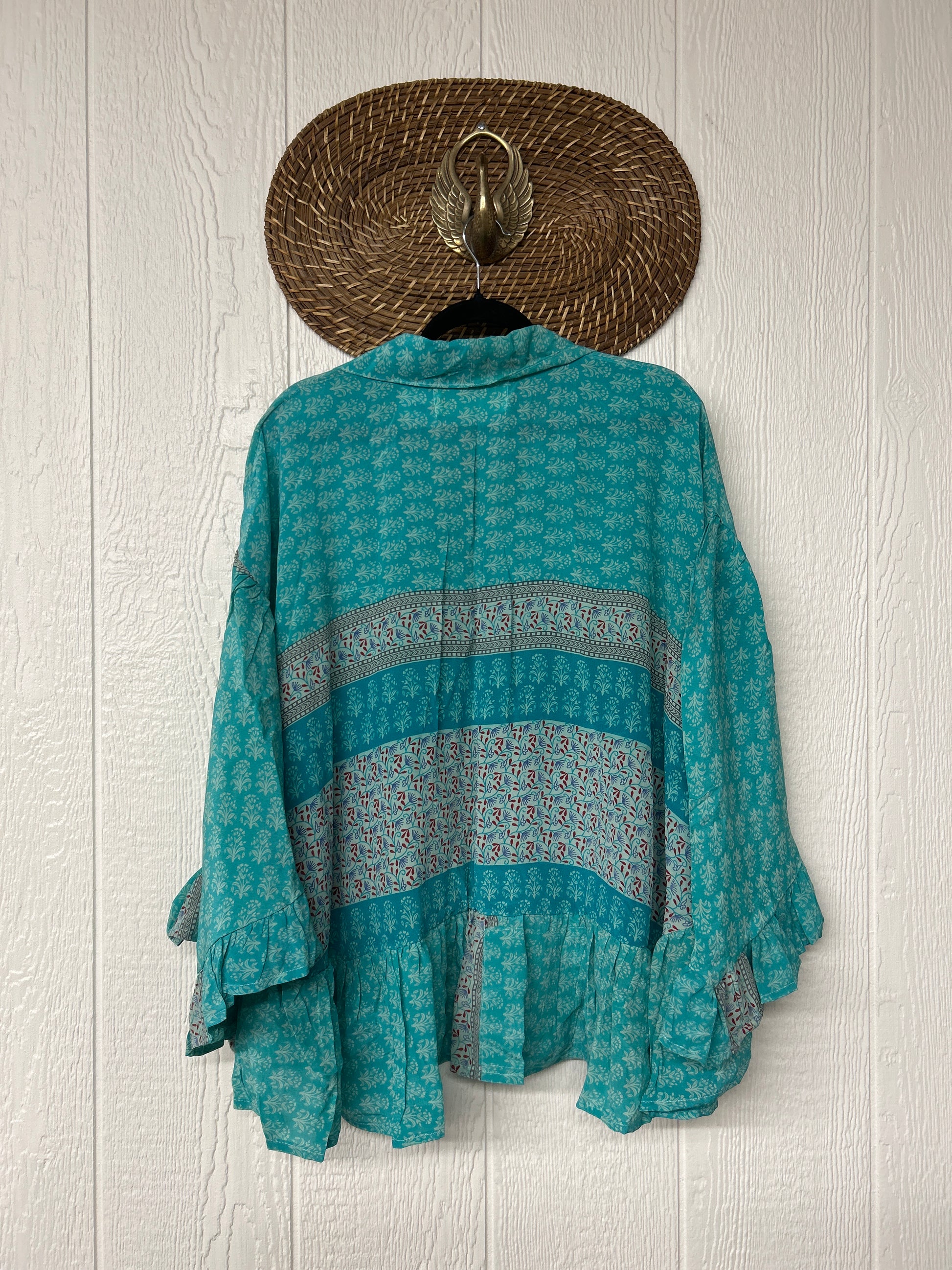 Crafted from vintage crepe sari this romantic piece features ruffles throughout, tie closure on the neck that can be opened or closed, fully functional button placket, high low hem, bell sleeve.