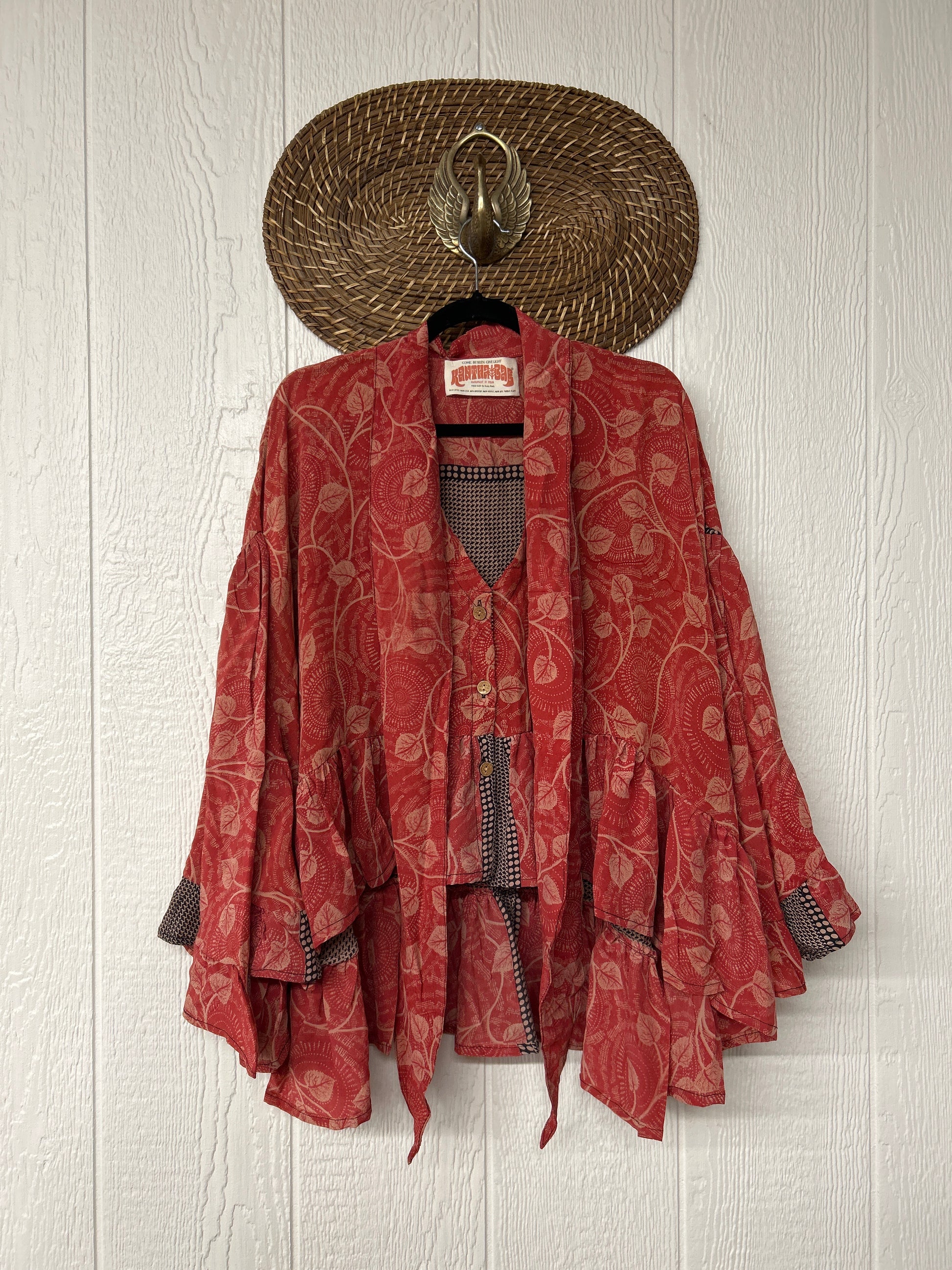 Crafted from vintage crepe sari this romantic piece features ruffles throughout, tie closure on the neck that can be opened or closed, fully functional button placket, high low hem, bell sleeve.