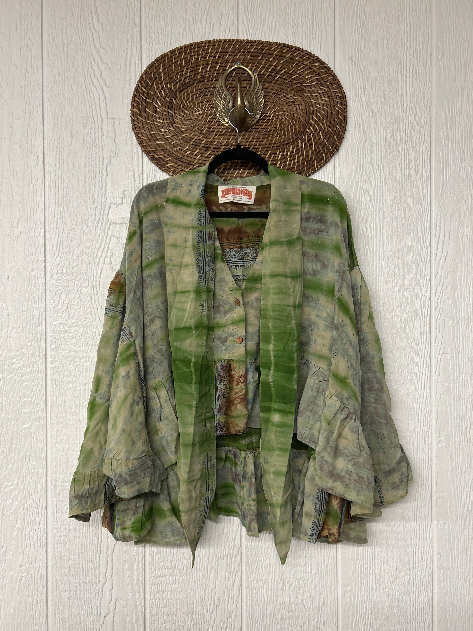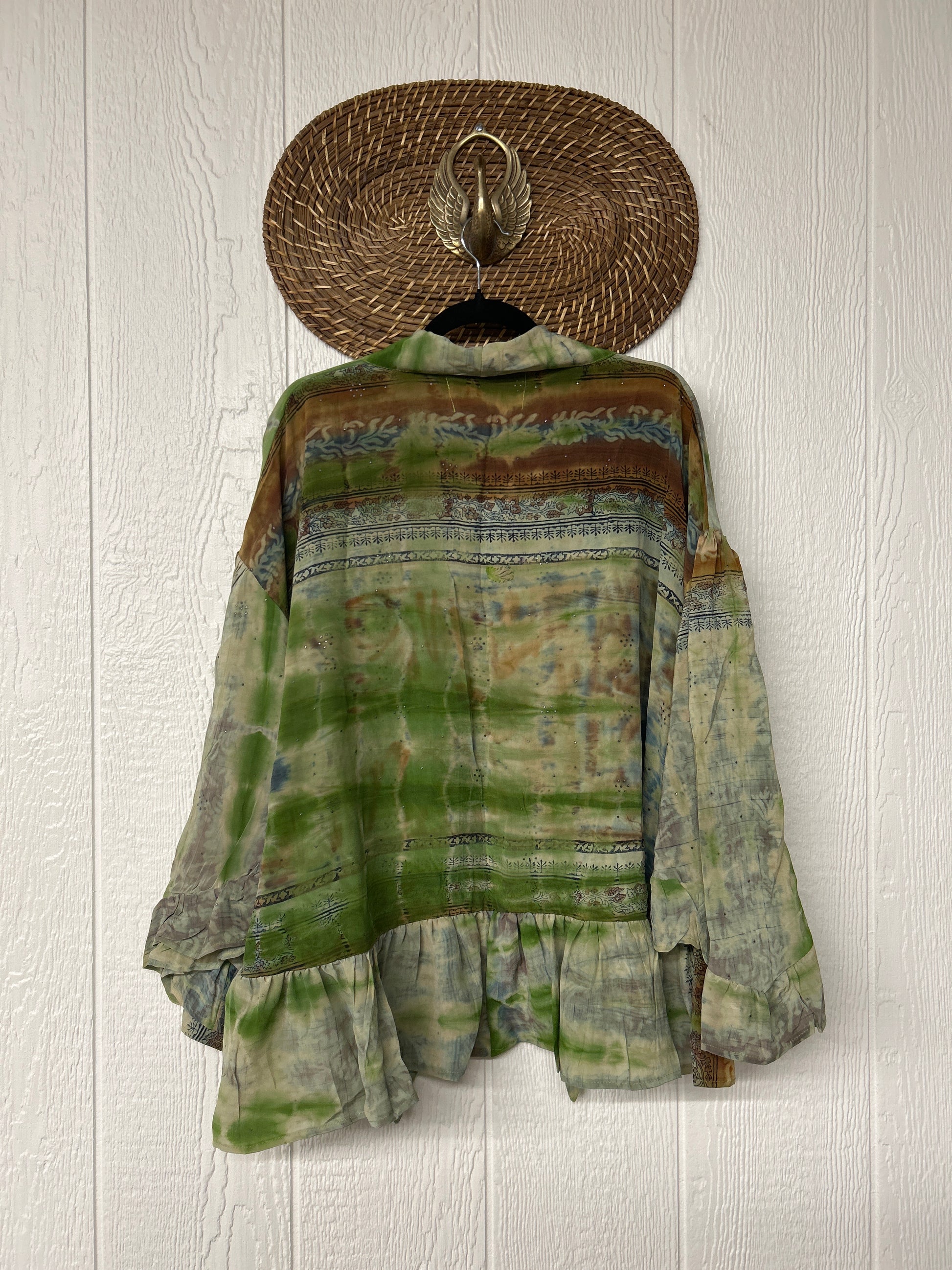 Crafted from vintage crepe sari this romantic piece features ruffles throughout, tie closure on the neck that can be opened or closed, fully functional button placket, high low hem, bell sleeve.