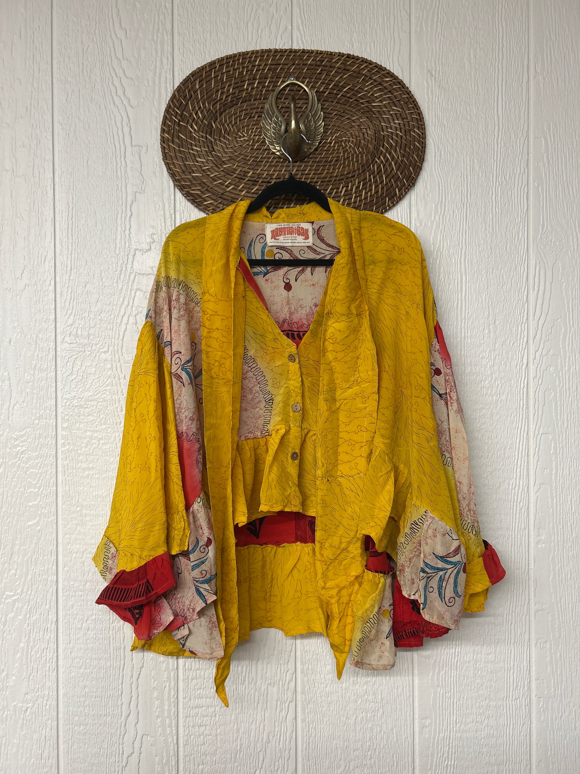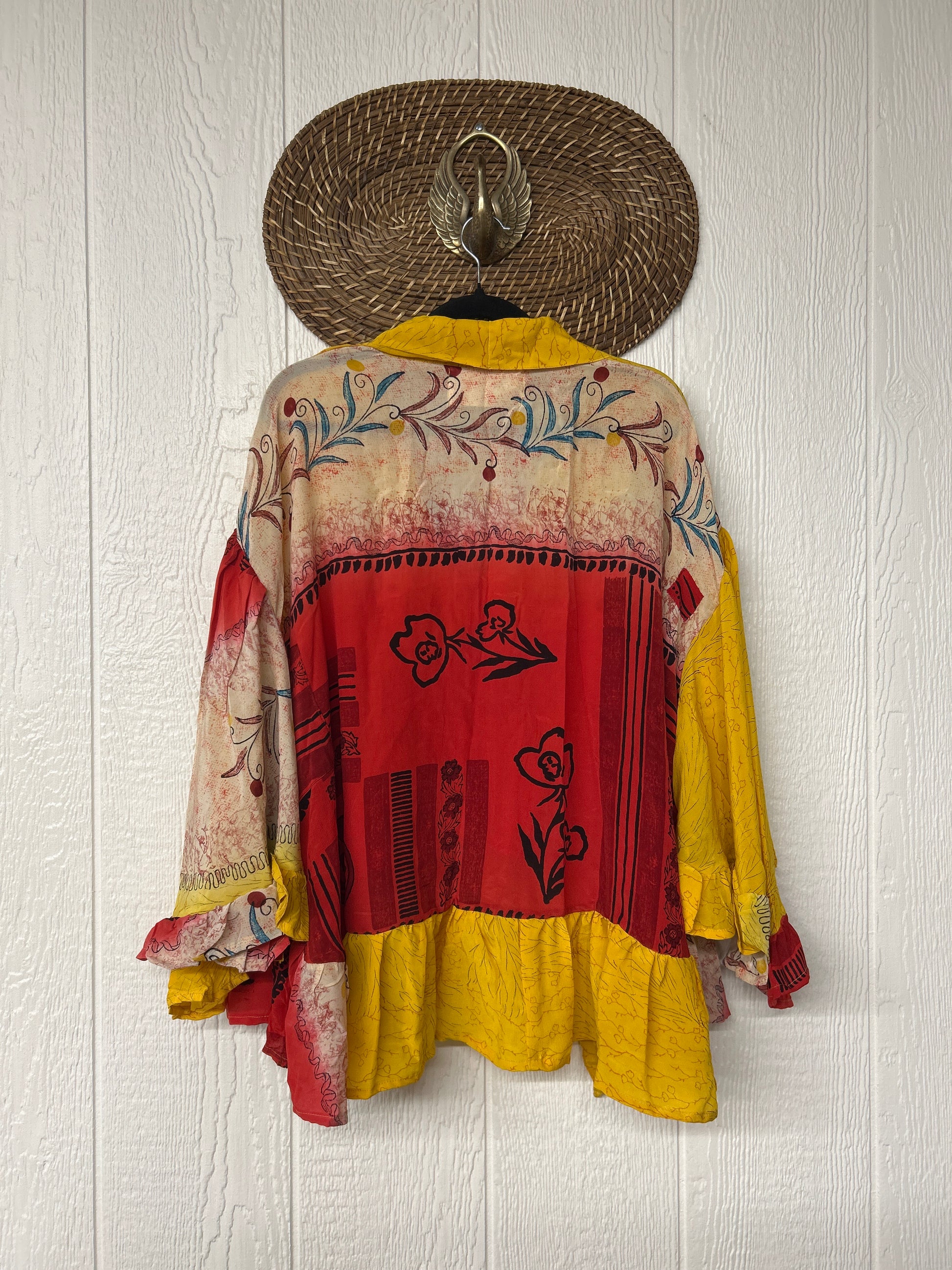 Crafted from vintage crepe sari this romantic piece features ruffles throughout, tie closure on the neck that can be opened or closed, fully functional button placket, high low hem, bell sleeve.