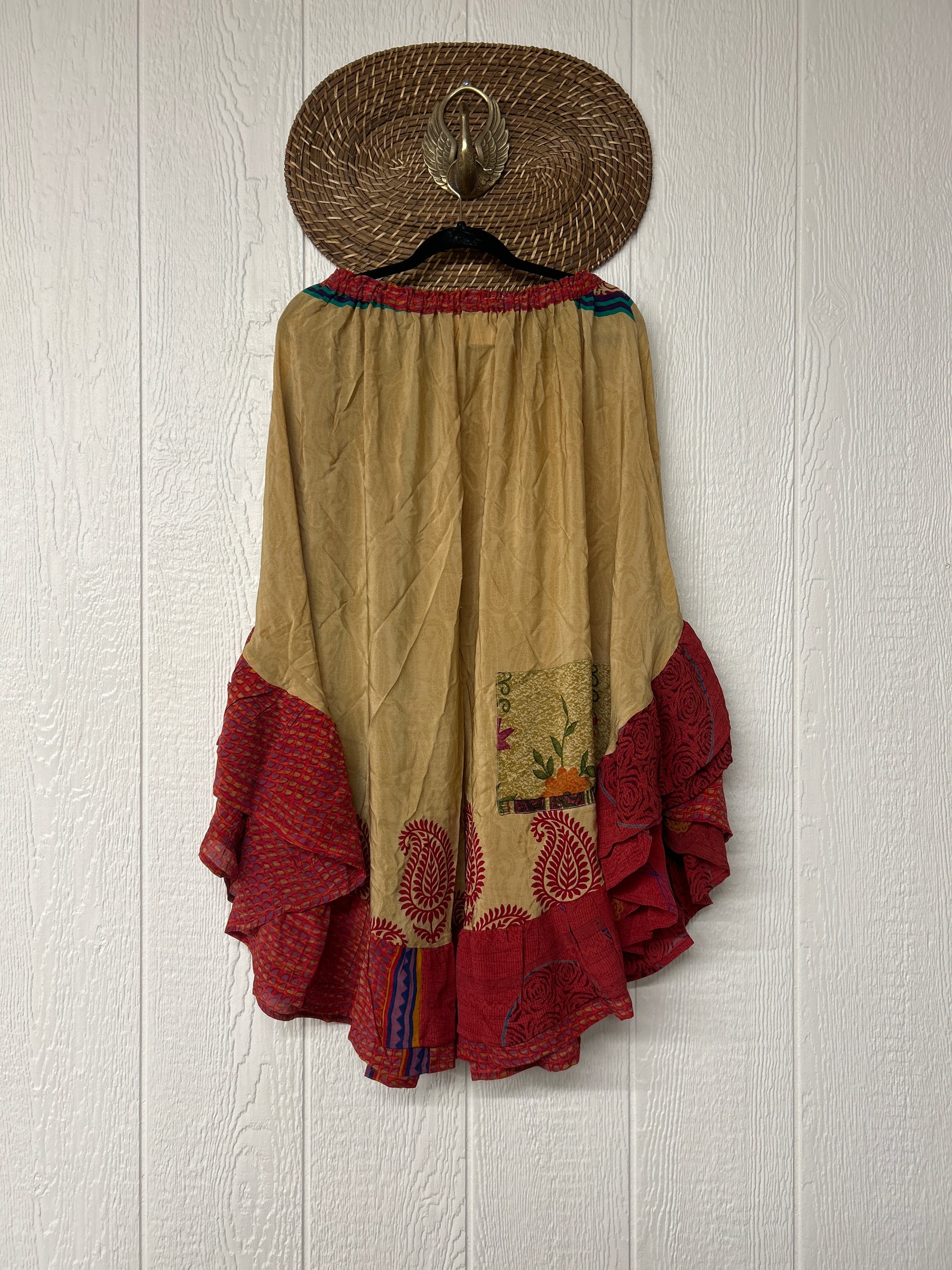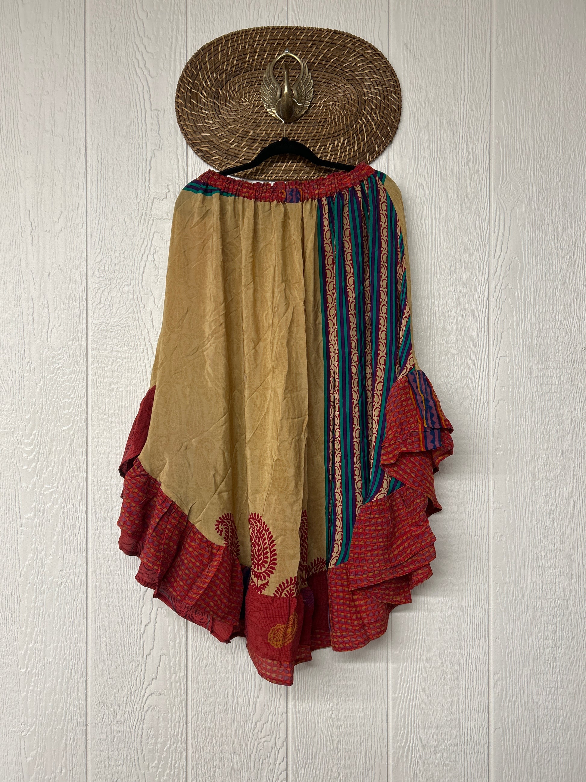 Crafted from vintage crepe sari this twirly skirt features a stretchy elastic waist and curved ruffle hem for extra dimension.