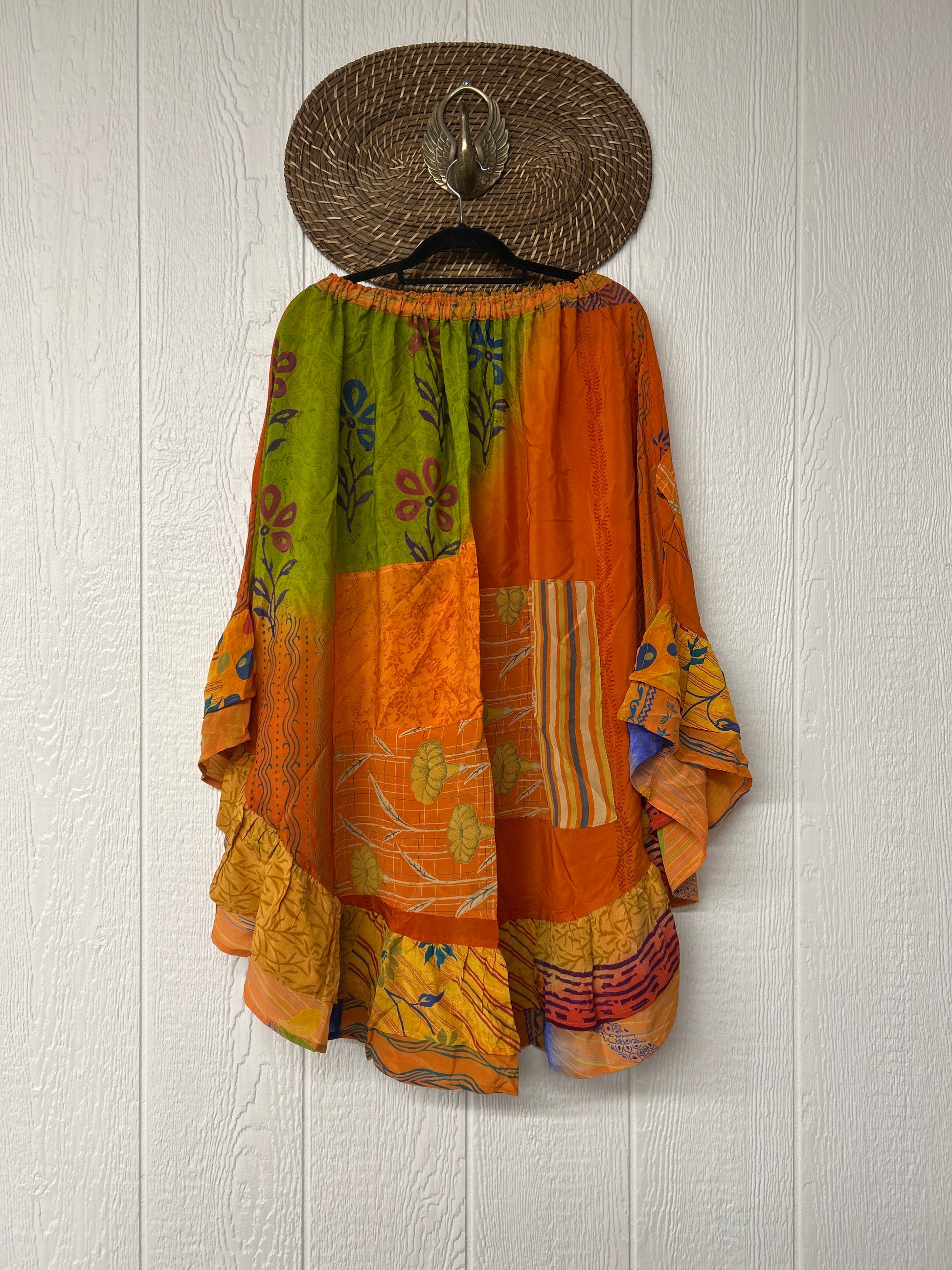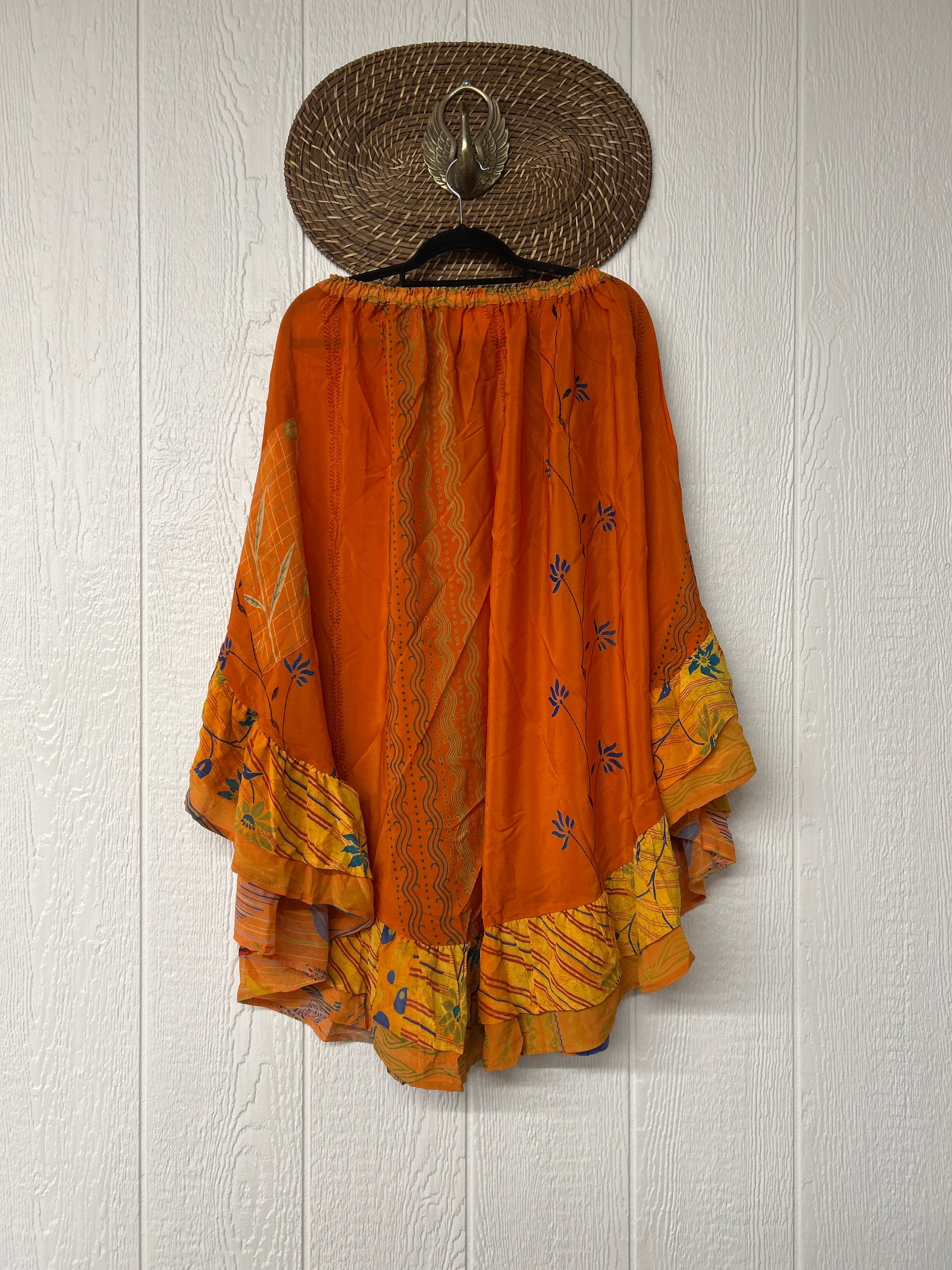 Crafted from vintage crepe sari this twirly skirt features a stretchy elastic waist and curved ruffle hem for extra dimension.
