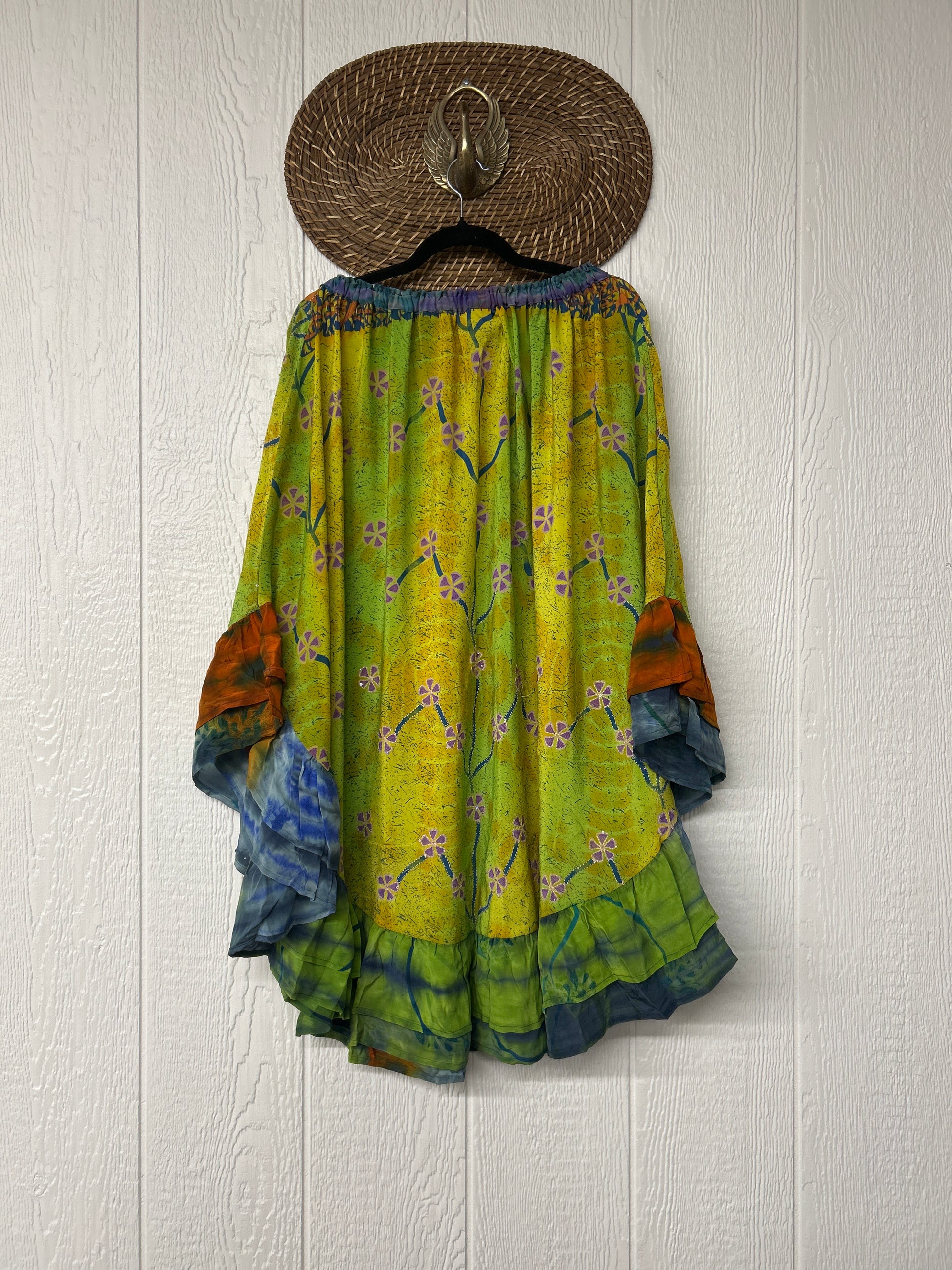 Crafted from vintage crepe sari this twirly skirt features a stretchy elastic waist and curved ruffle hem for extra dimension.