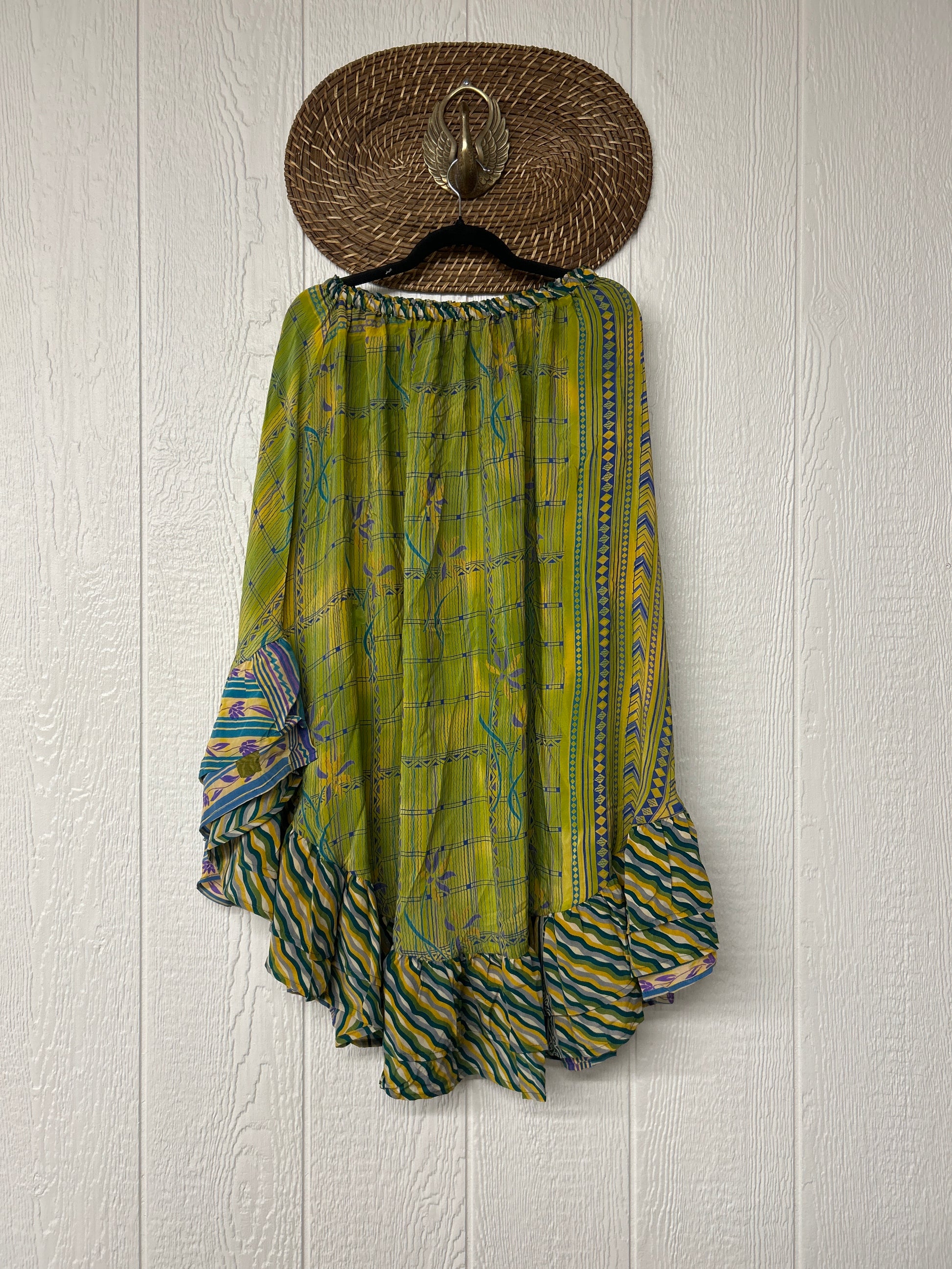 Crafted from vintage crepe sari this twirly skirt features a stretchy elastic waist and curved ruffle hem for extra dimension.