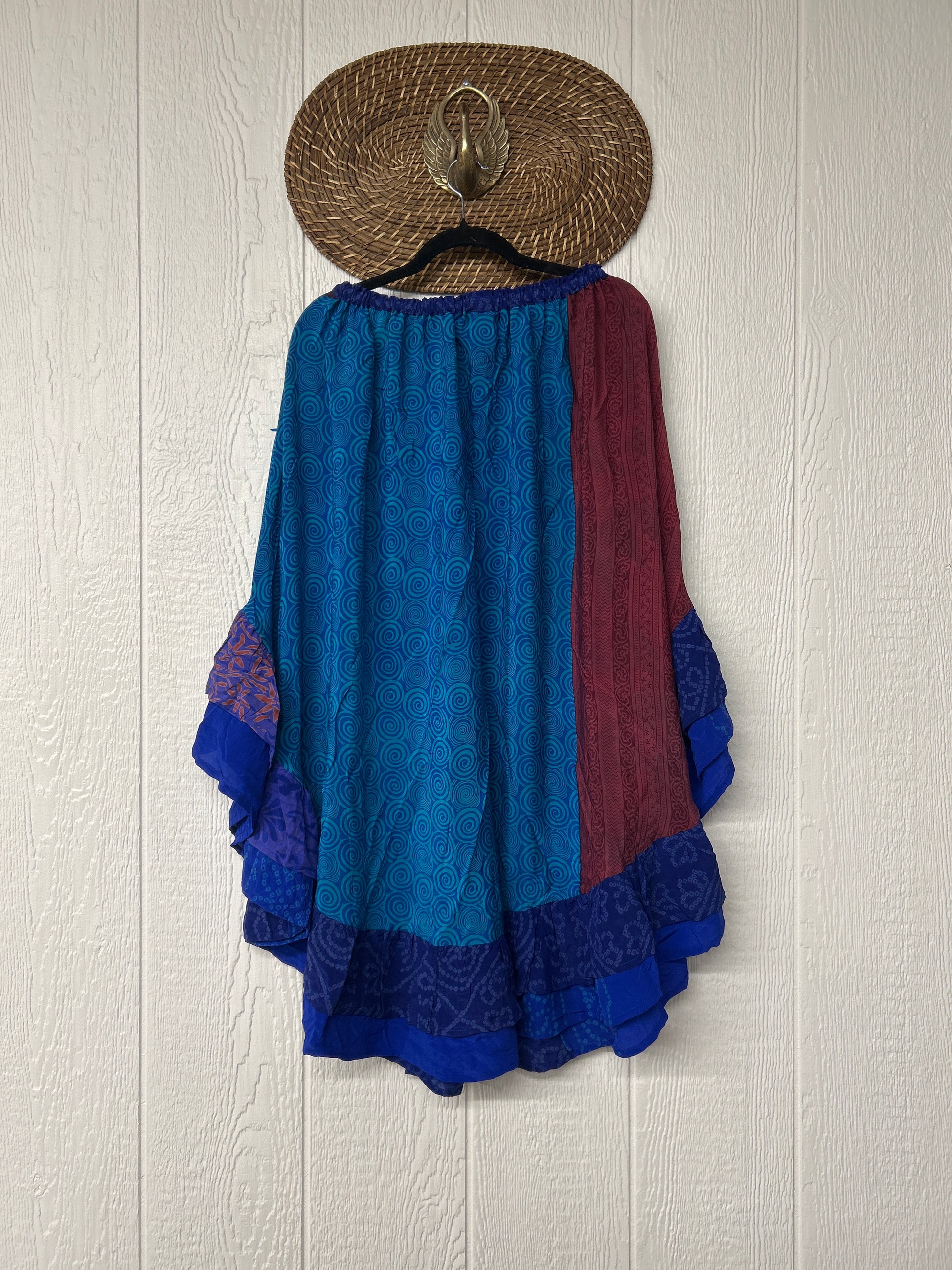 Crafted from vintage crepe sari this twirly skirt features a stretchy elastic waist and curved ruffle hem for extra dimension.