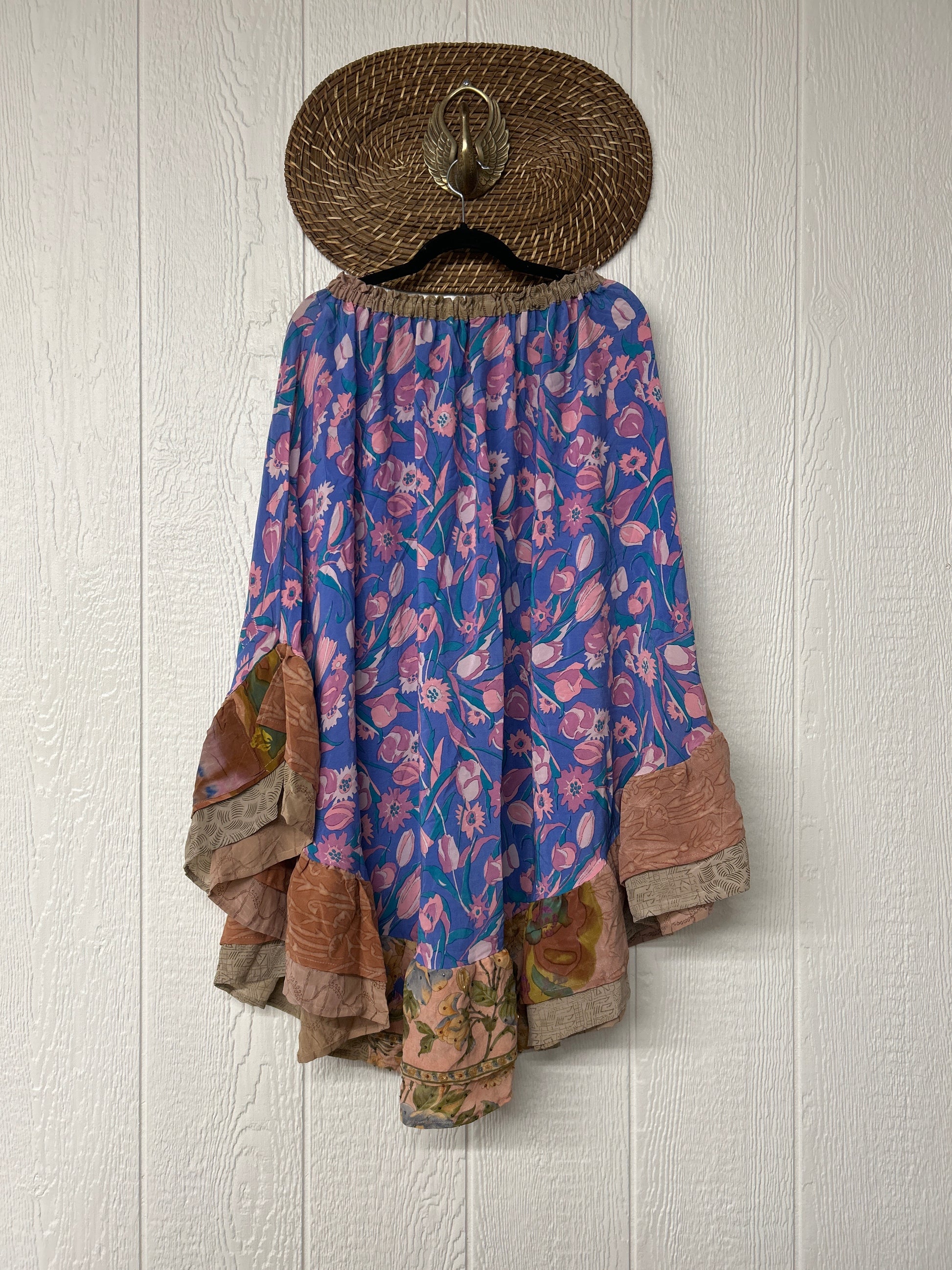 Crafted from vintage crepe sari this twirly skirt features a stretchy elastic waist and curved ruffle hem for extra dimension.