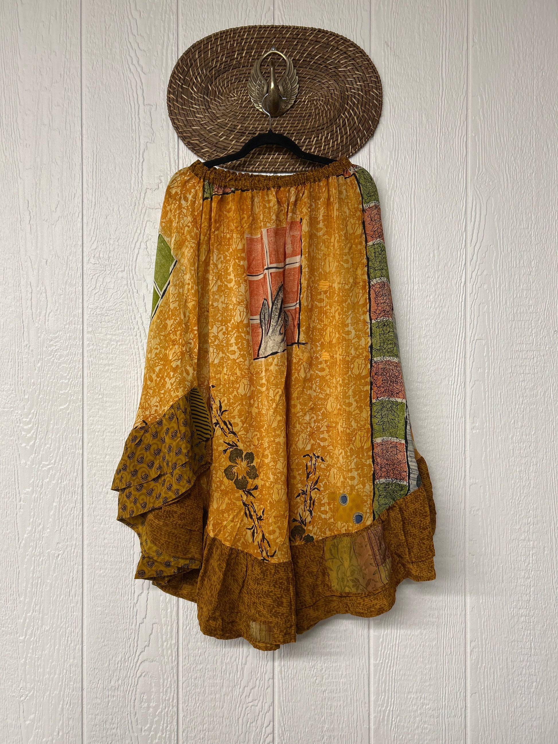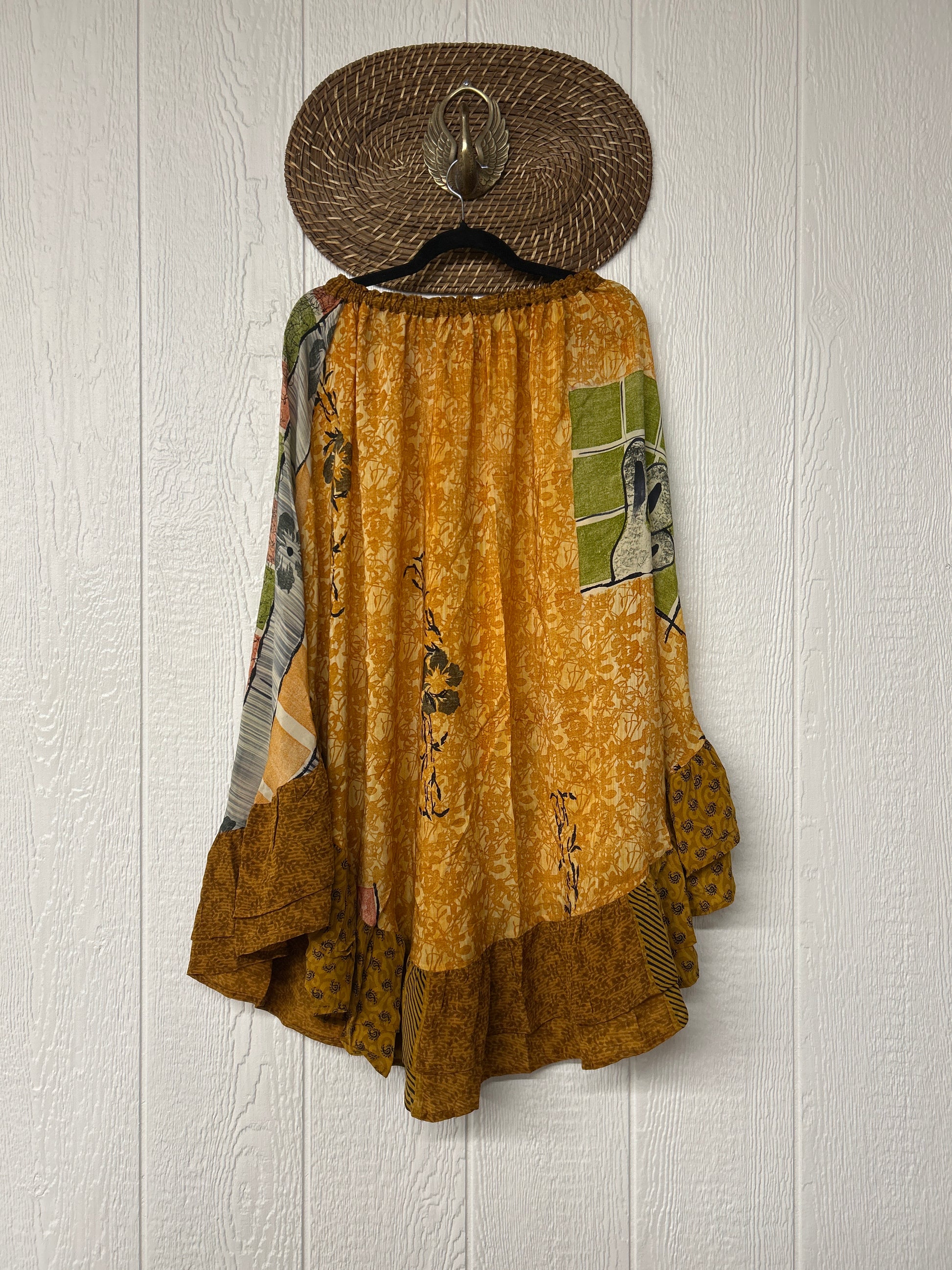 Crafted from vintage crepe sari this twirly skirt features a stretchy elastic waist and curved ruffle hem for extra dimension.