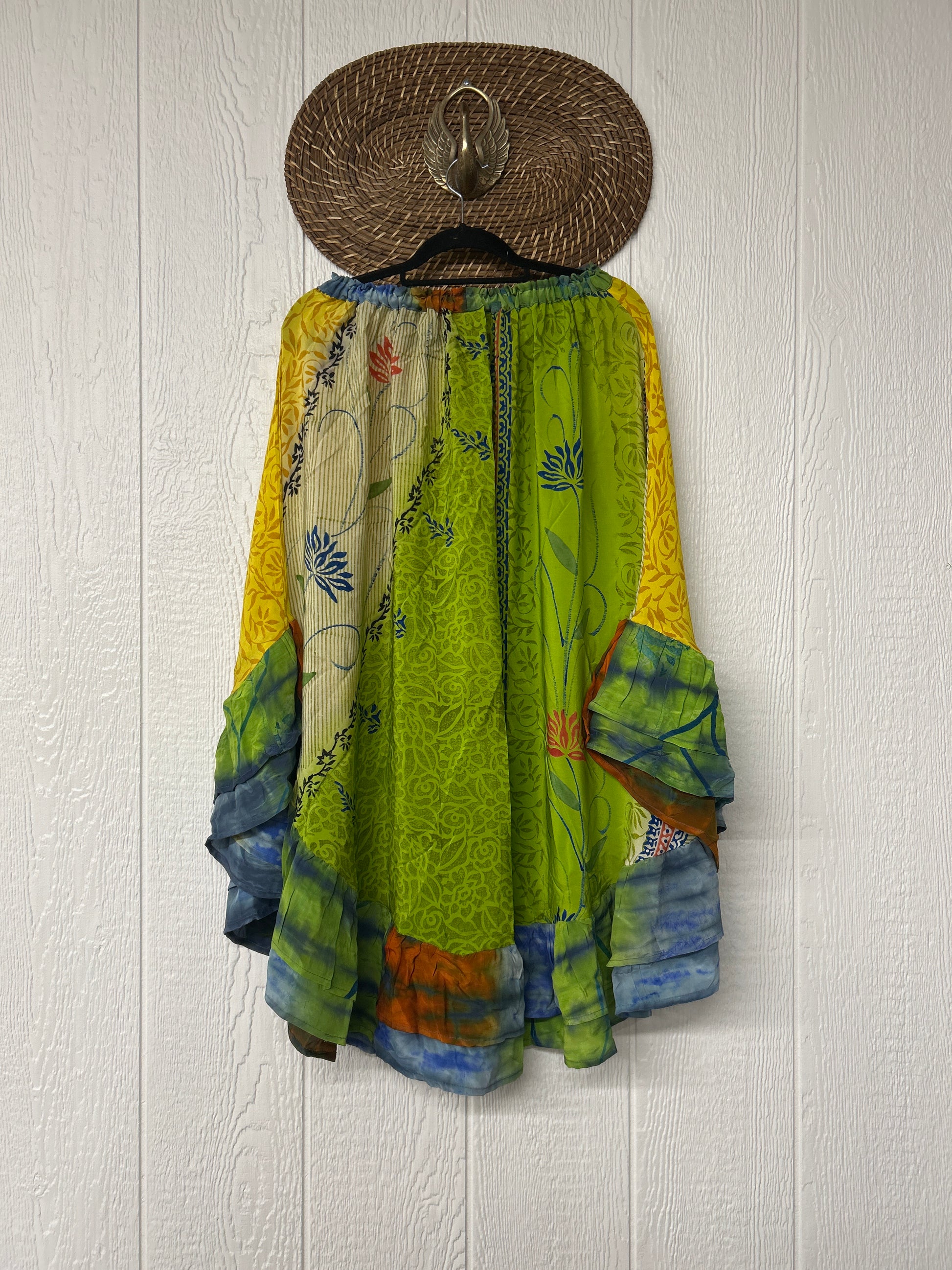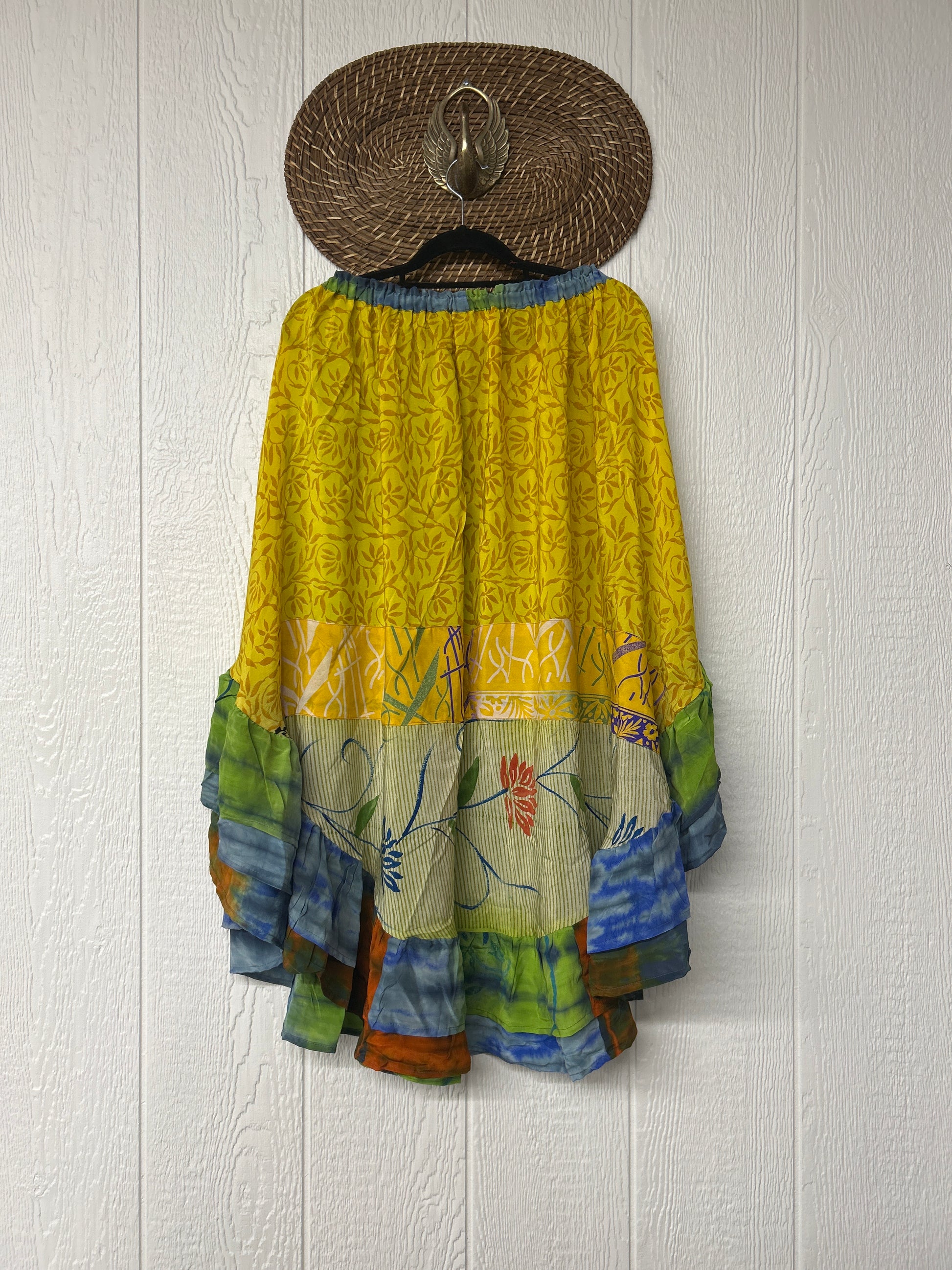 Crafted from vintage crepe sari this twirly skirt features a stretchy elastic waist and curved ruffle hem for extra dimension.
