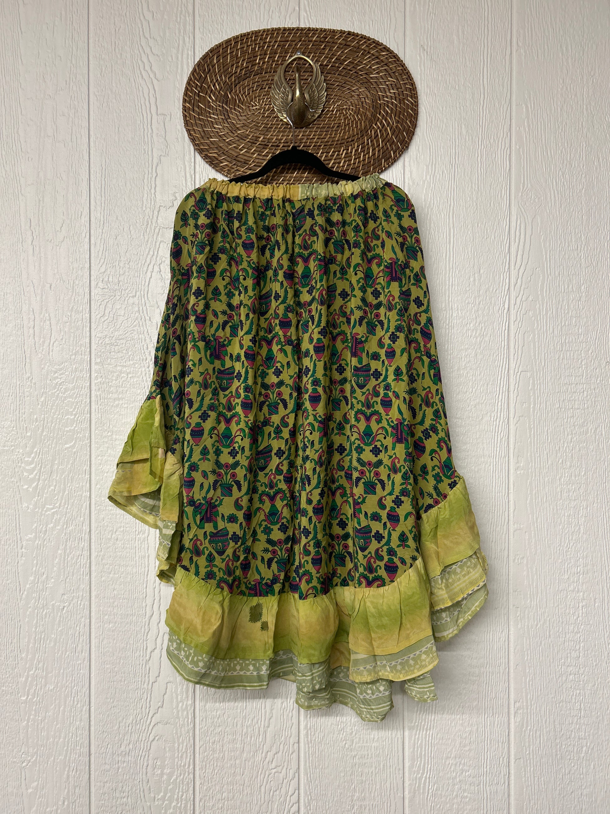 Crafted from vintage crepe sari this twirly skirt features a stretchy elastic waist and curved ruffle hem for extra dimension.