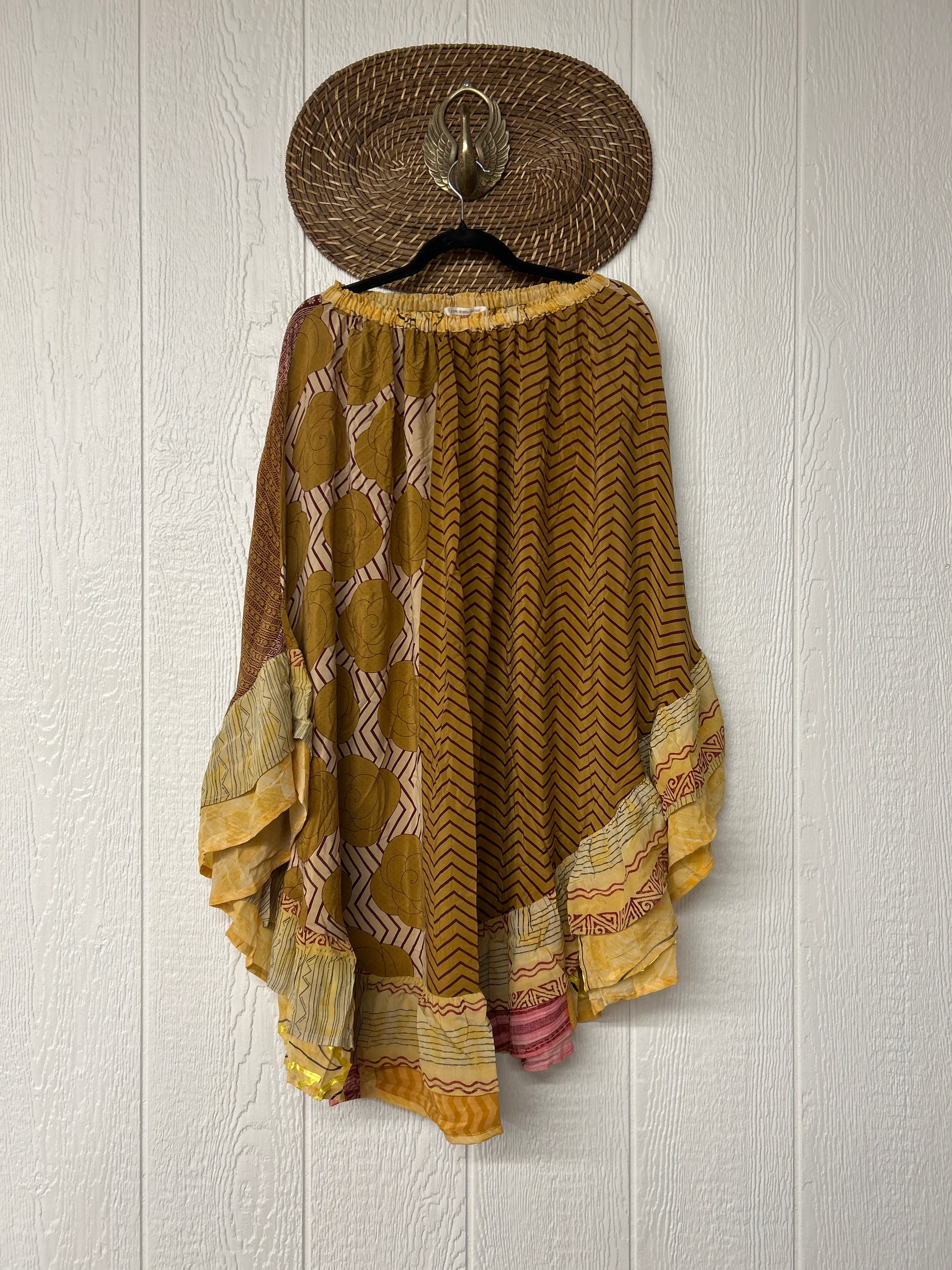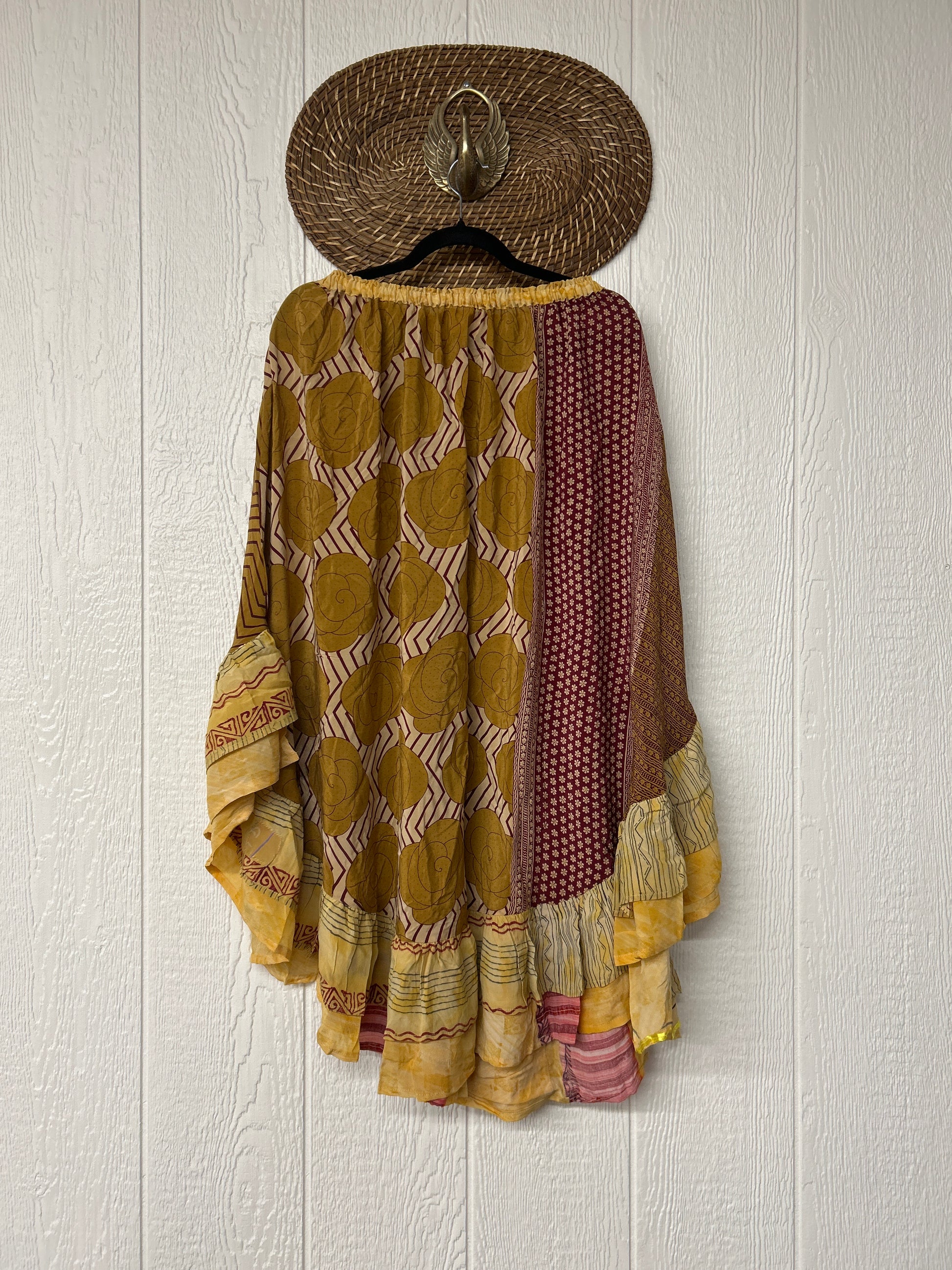 Crafted from vintage crepe sari this twirly skirt features a stretchy elastic waist and curved ruffle hem for extra dimension.