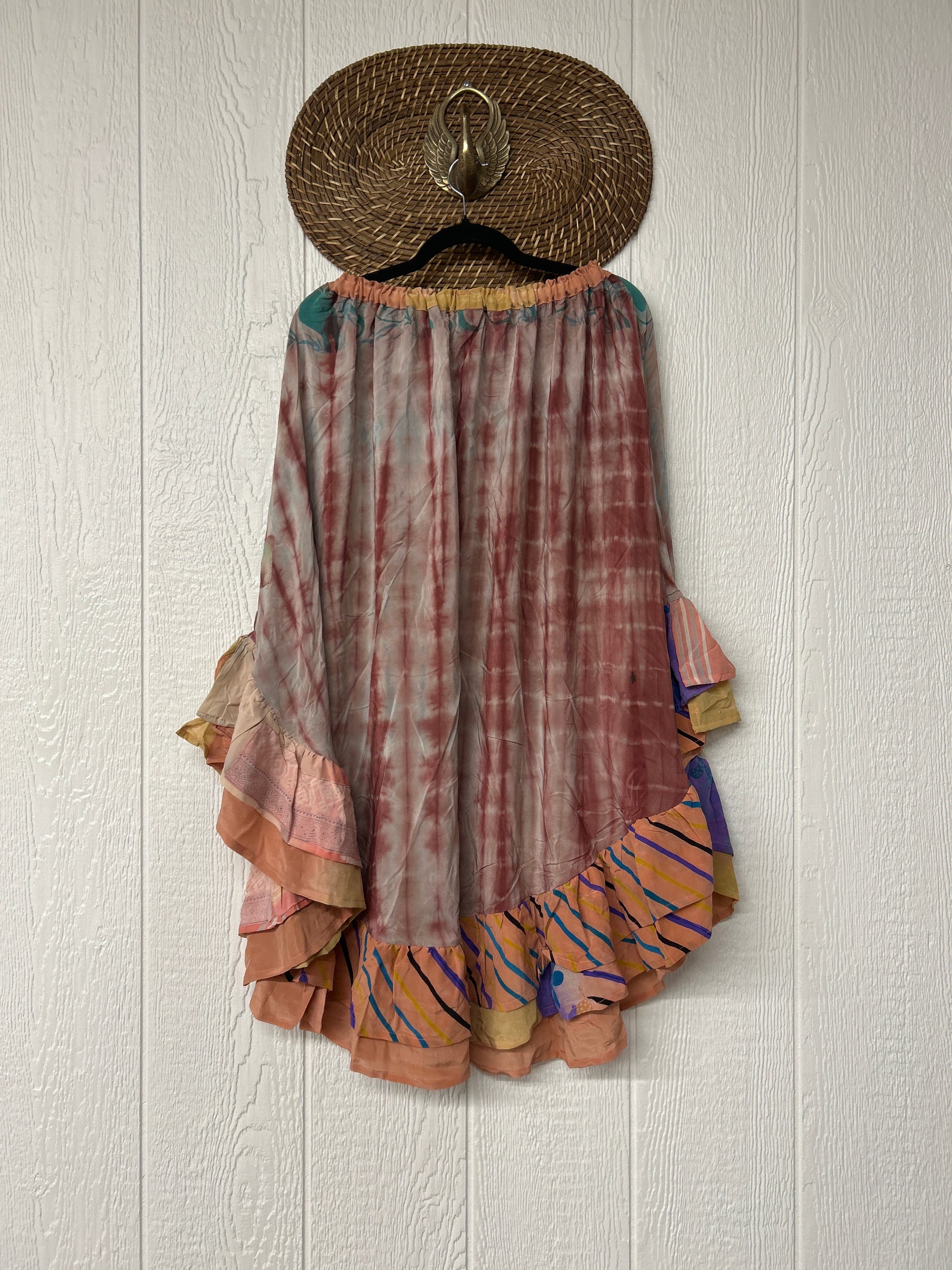 Crafted from vintage crepe sari this twirly skirt features a stretchy elastic waist and curved ruffle hem for extra dimension.