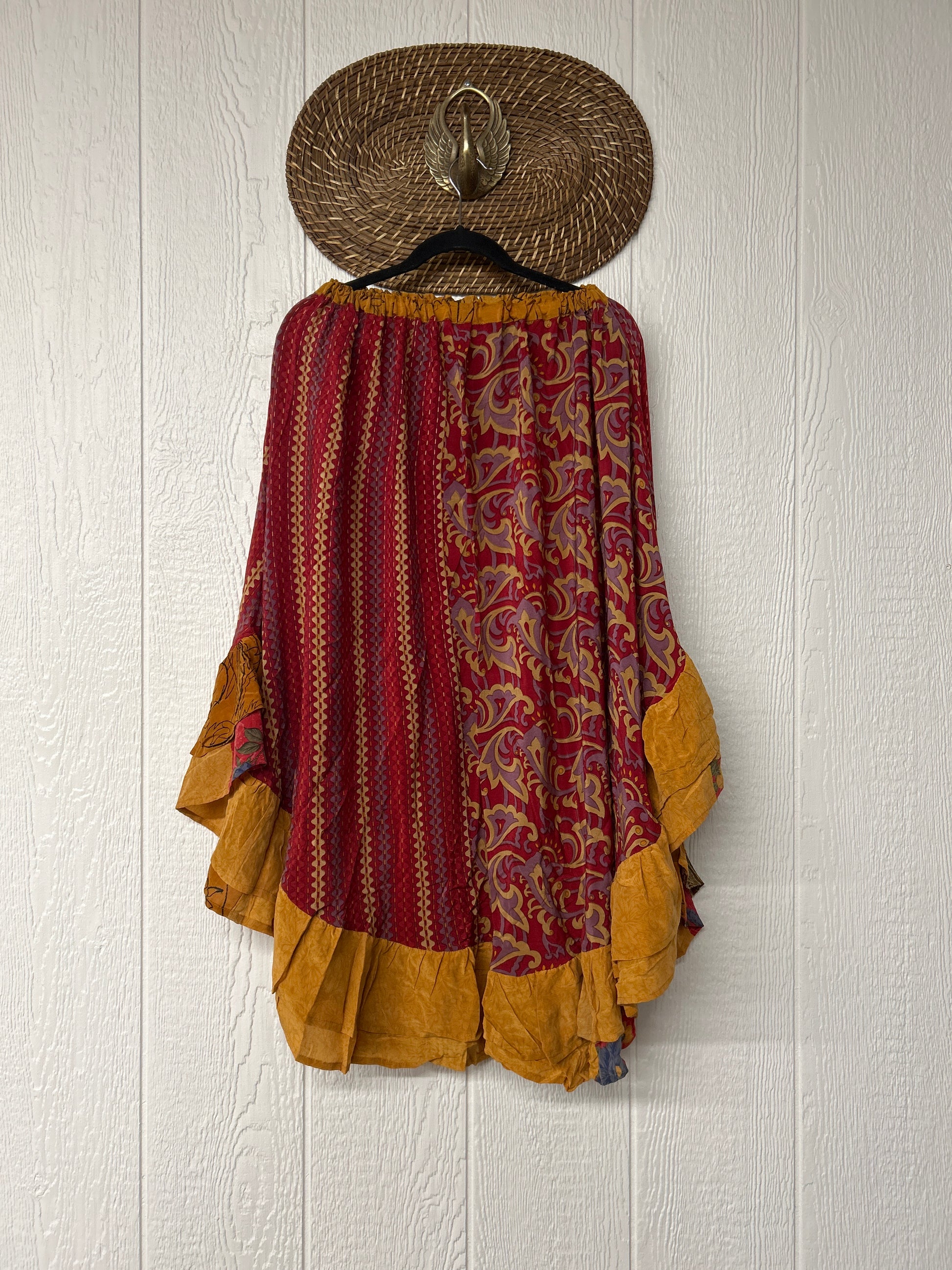 Crafted from vintage crepe sari this twirly skirt features a stretchy elastic waist and curved ruffle hem for extra dimension.