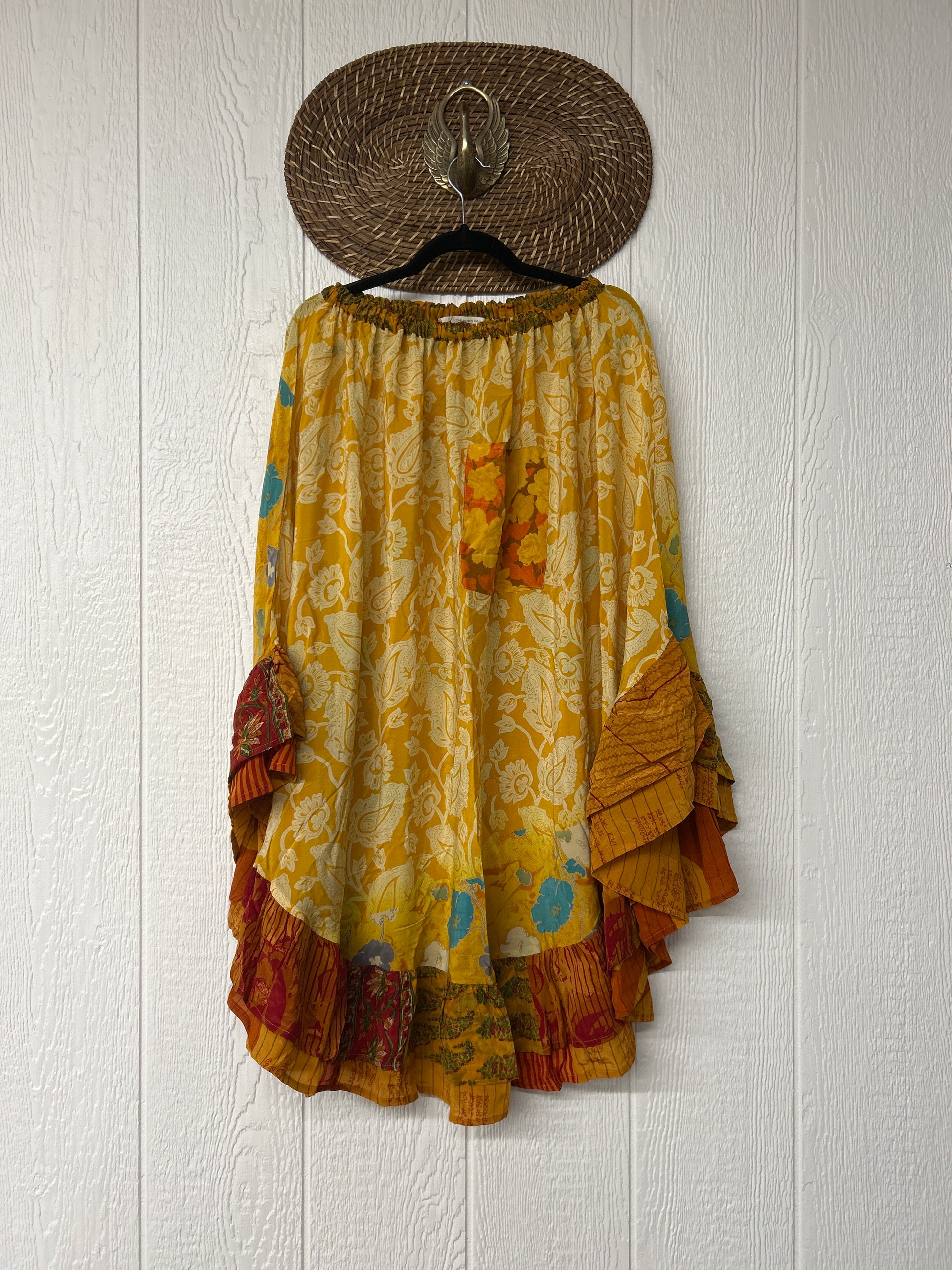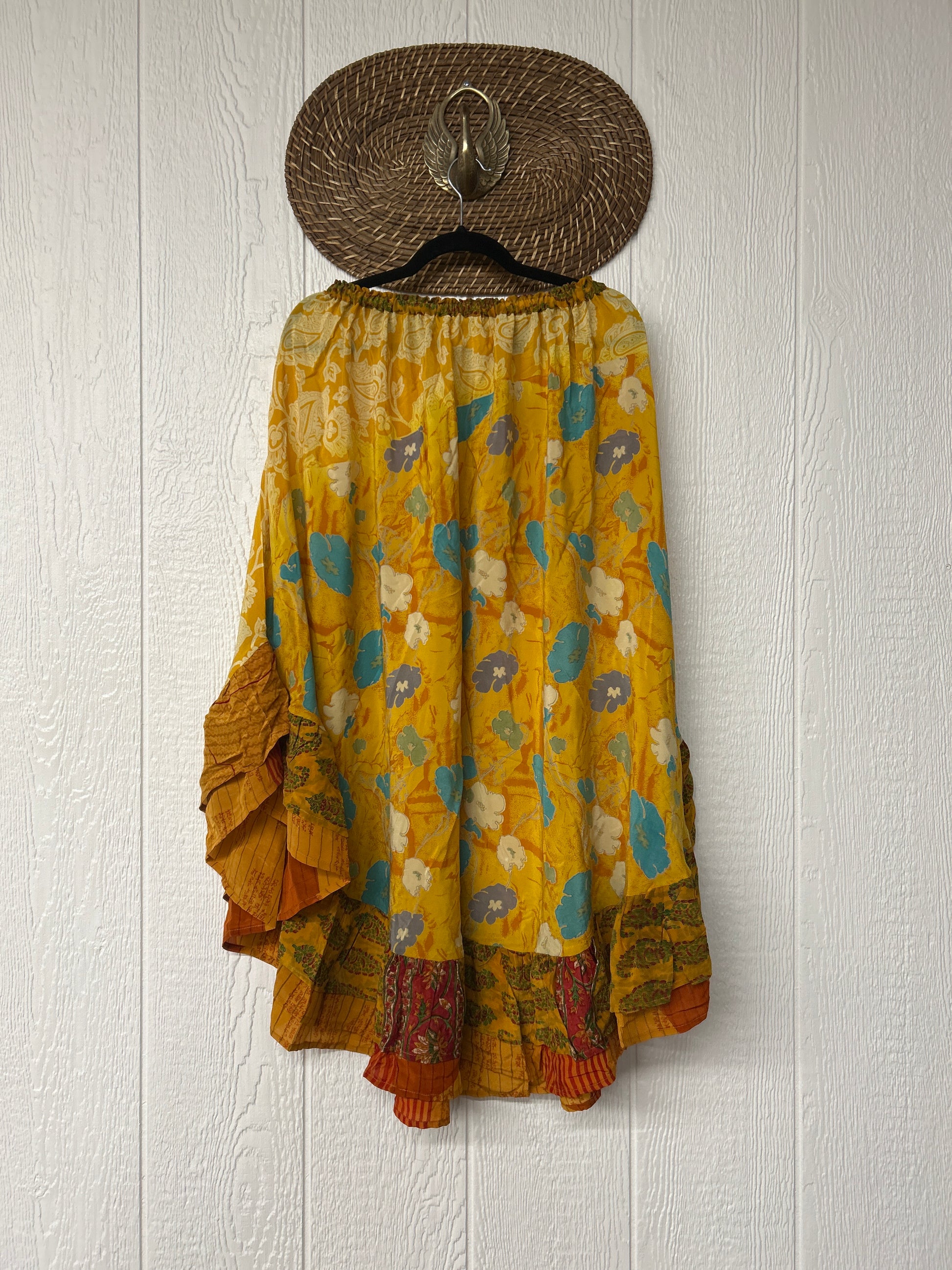 Crafted from vintage crepe sari this twirly skirt features a stretchy elastic waist and curved ruffle hem for extra dimension.