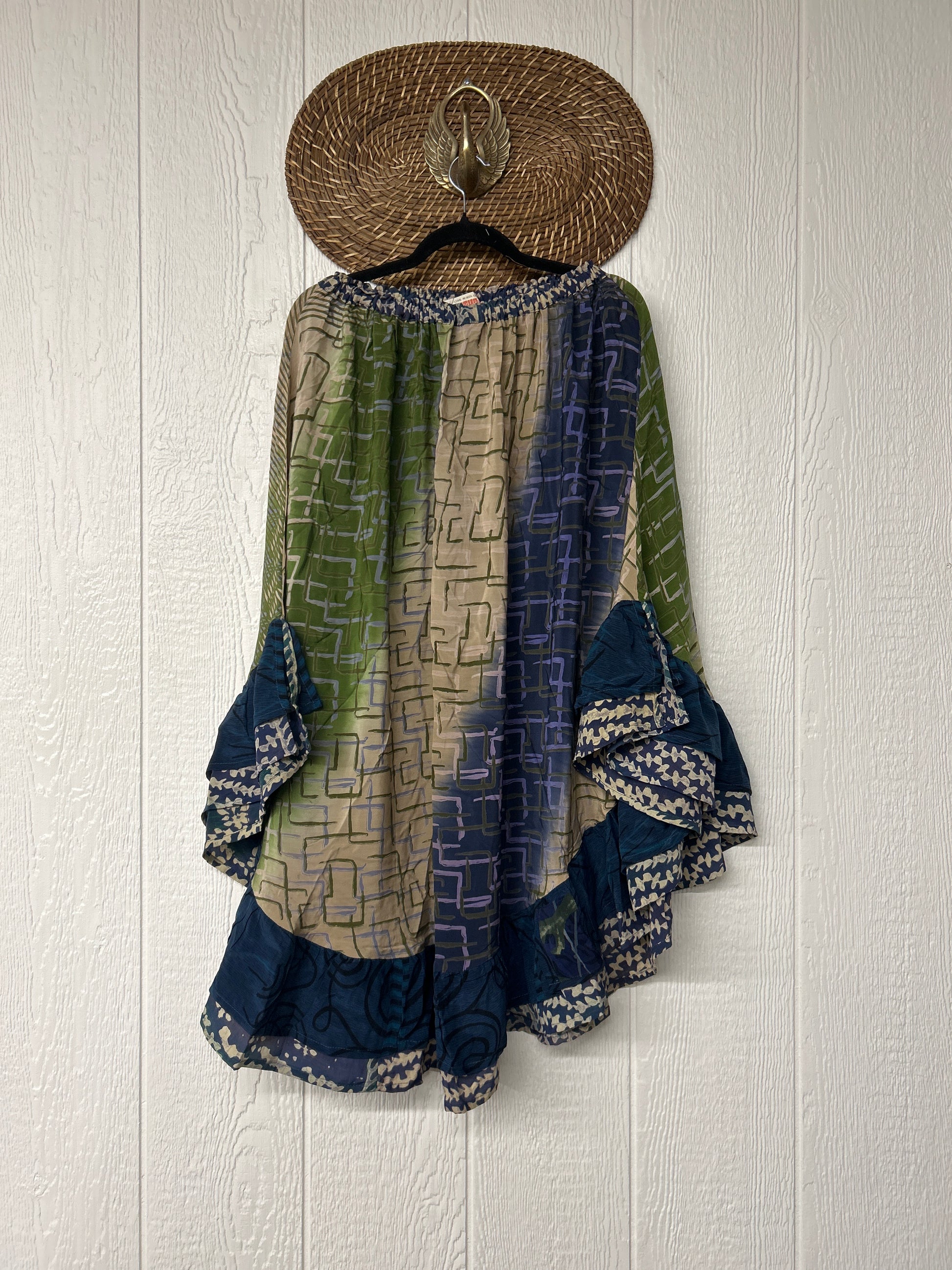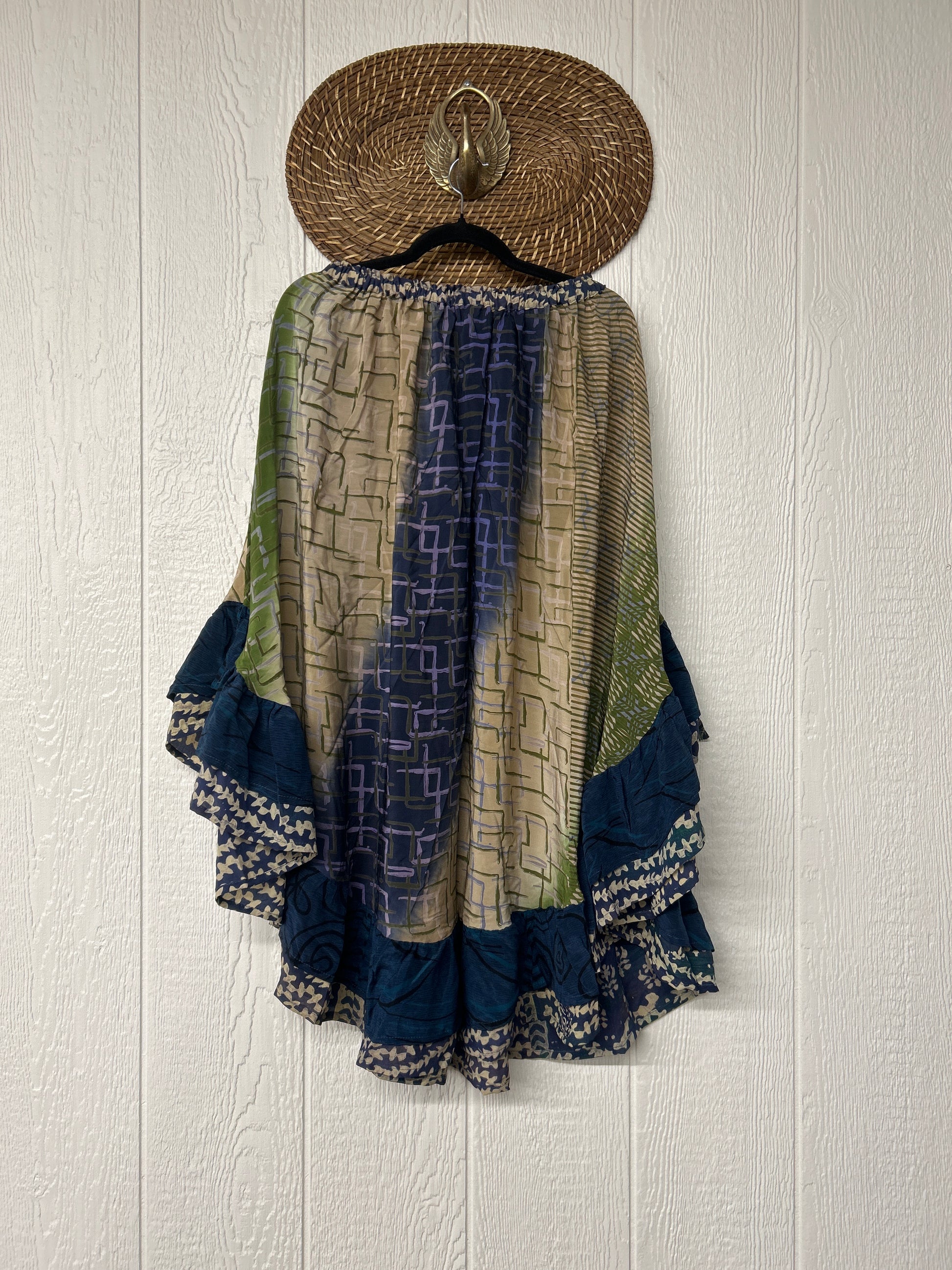 Crafted from vintage crepe sari this twirly skirt features a stretchy elastic waist and curved ruffle hem for extra dimension.