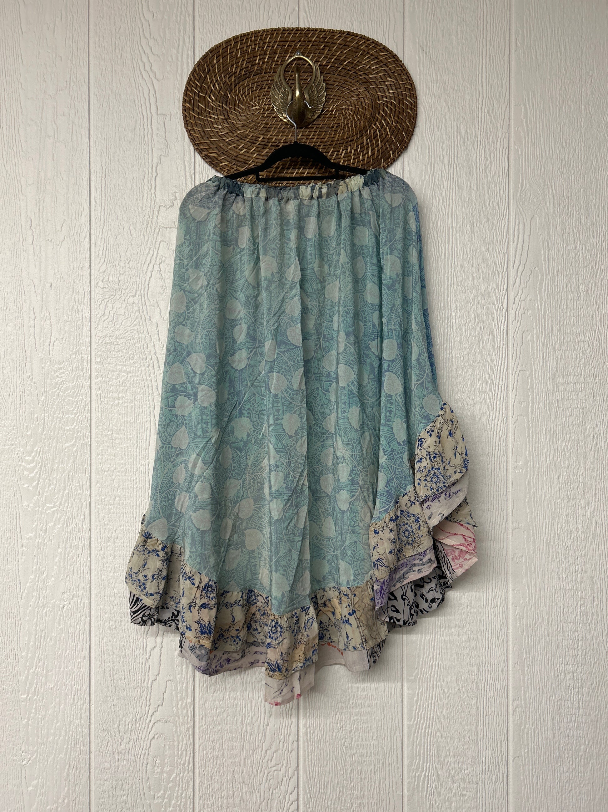 Crafted from vintage crepe sari this twirly skirt features a stretchy elastic waist and curved ruffle hem for extra dimension.