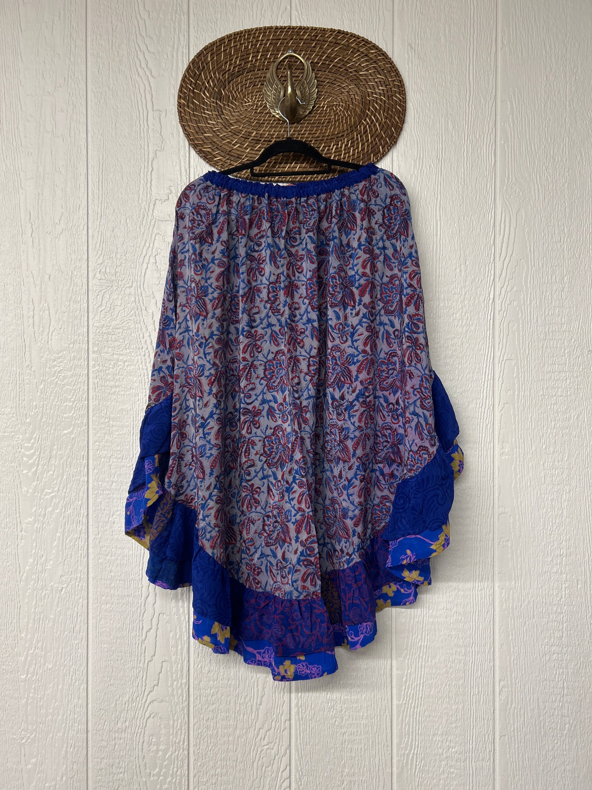 Crafted from vintage crepe sari this twirly skirt features a stretchy elastic waist and curved ruffle hem for extra dimension.