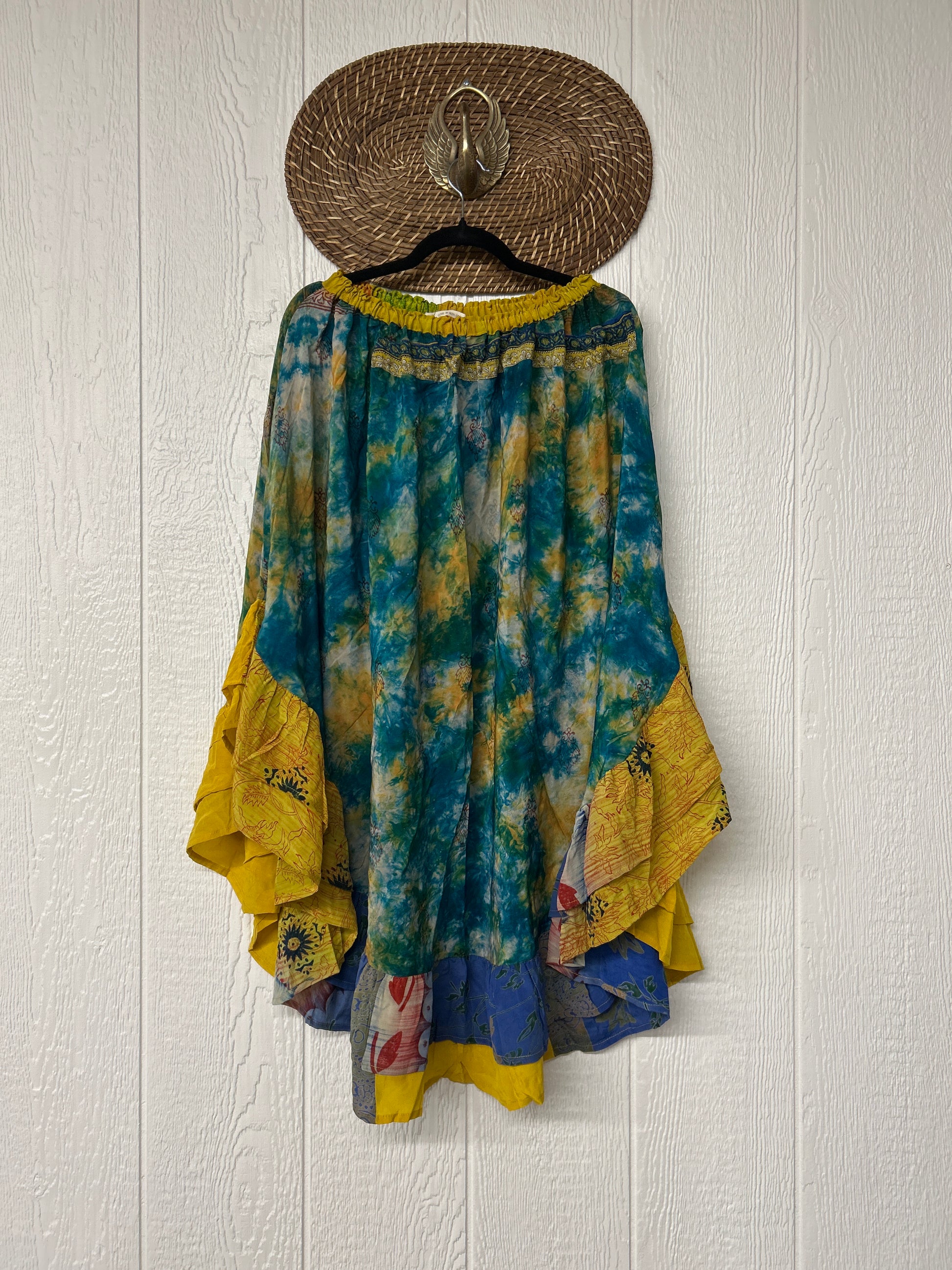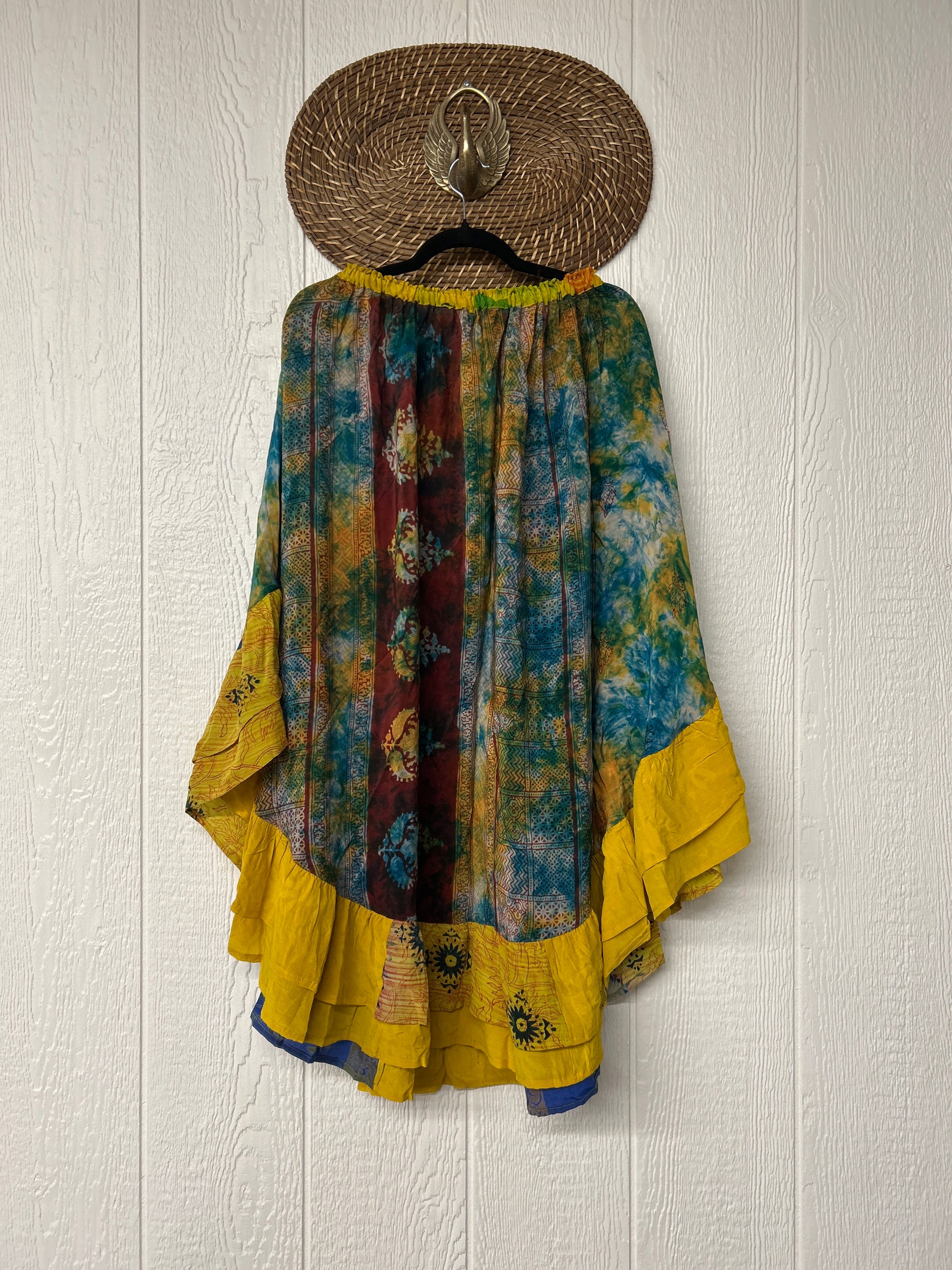 Crafted from vintage crepe sari this twirly skirt features a stretchy elastic waist and curved ruffle hem for extra dimension.