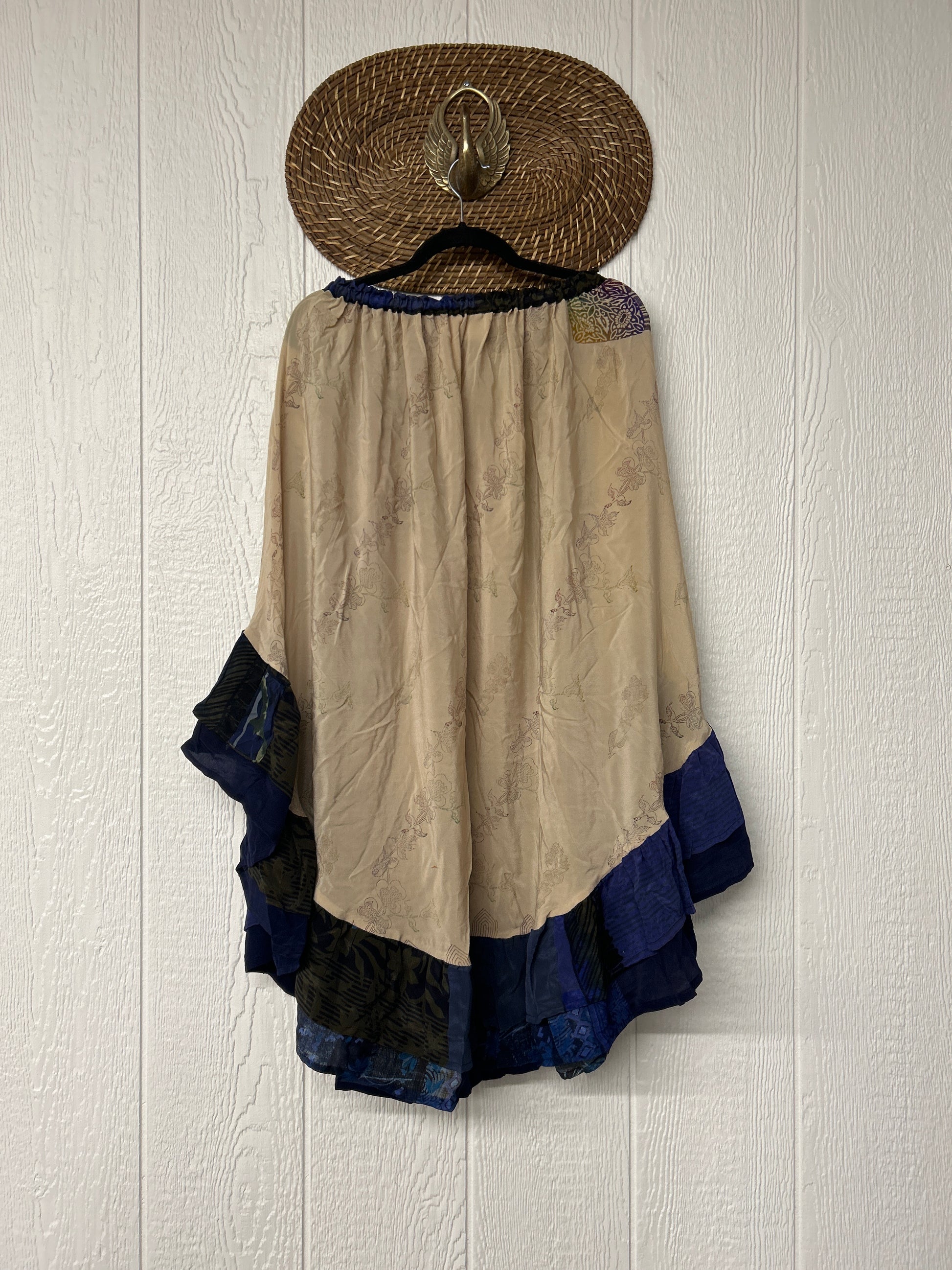 Crafted from vintage crepe sari this twirly skirt features a stretchy elastic waist and curved ruffle hem for extra dimension.