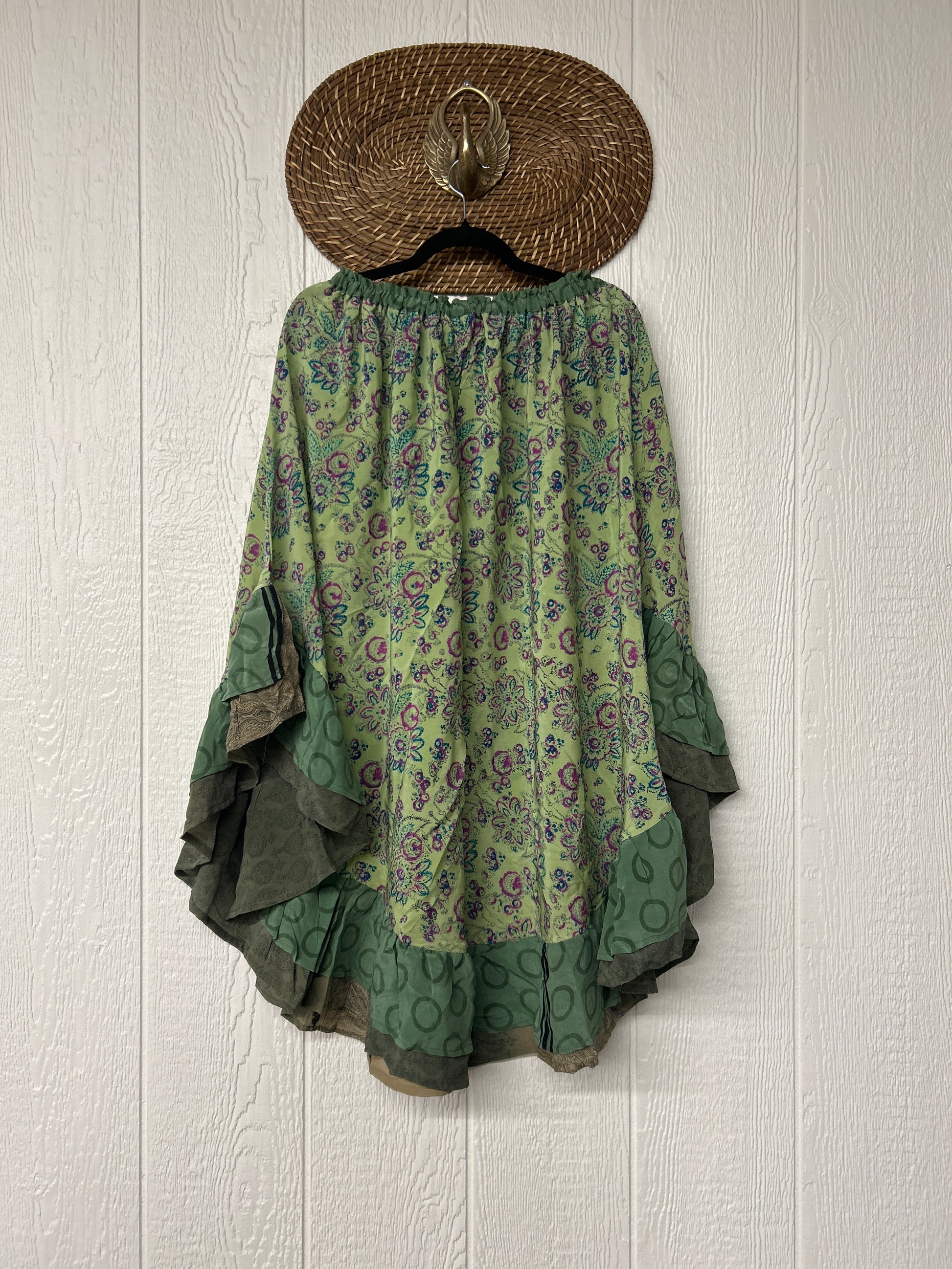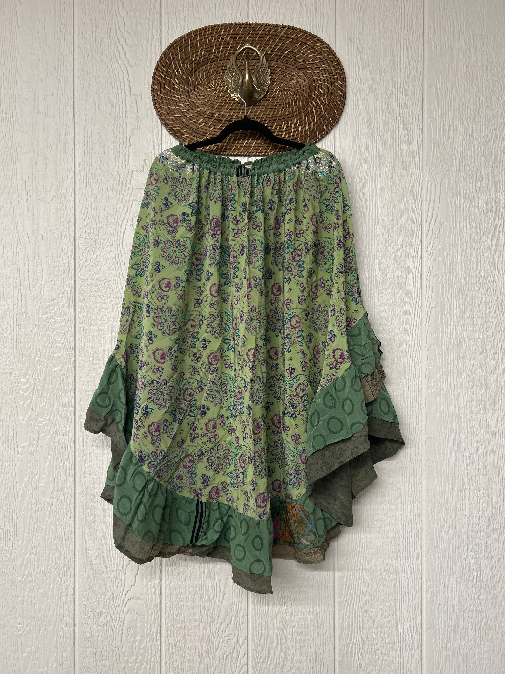 Crafted from vintage crepe sari this twirly skirt features a stretchy elastic waist and curved ruffle hem for extra dimension.