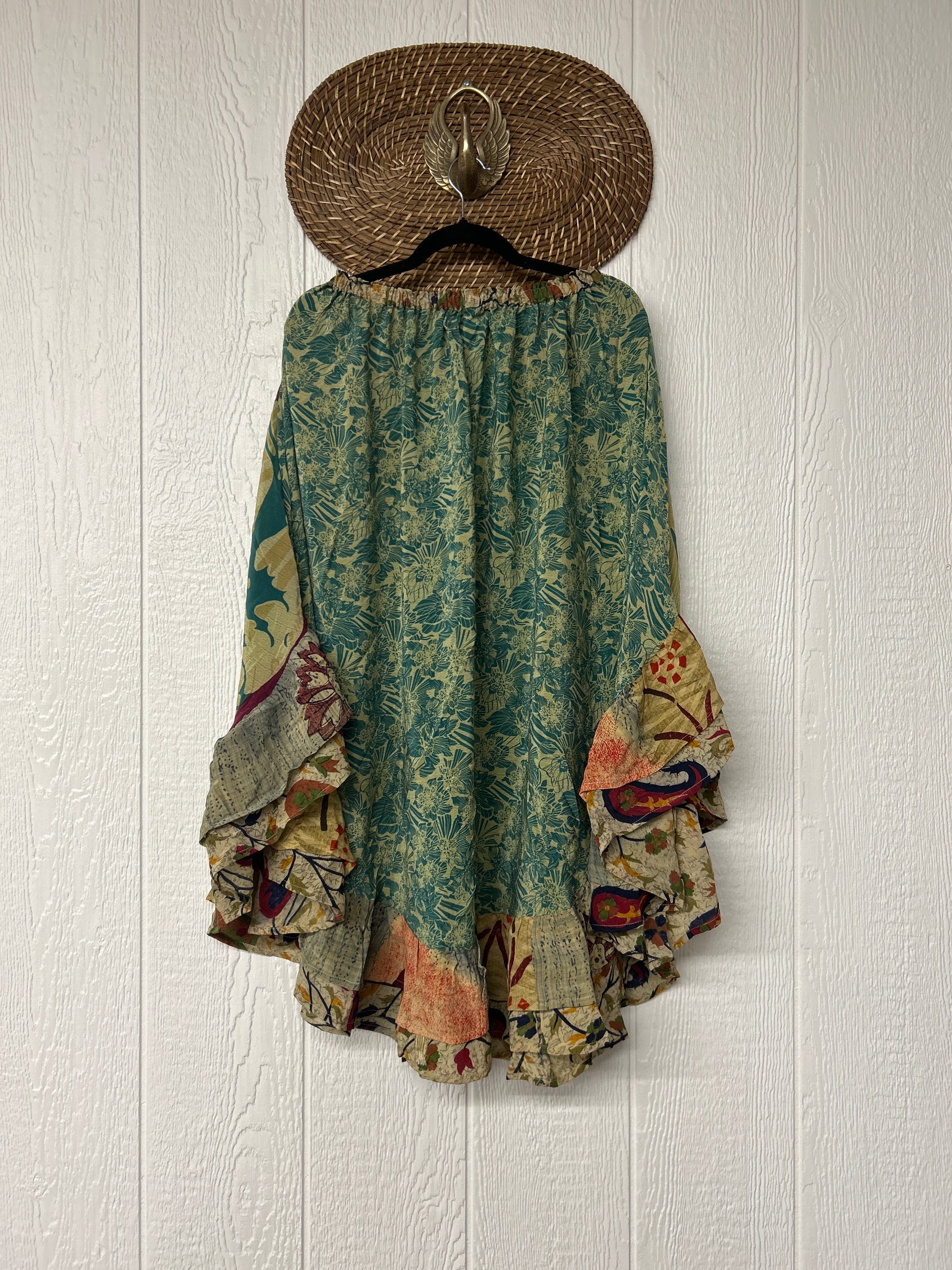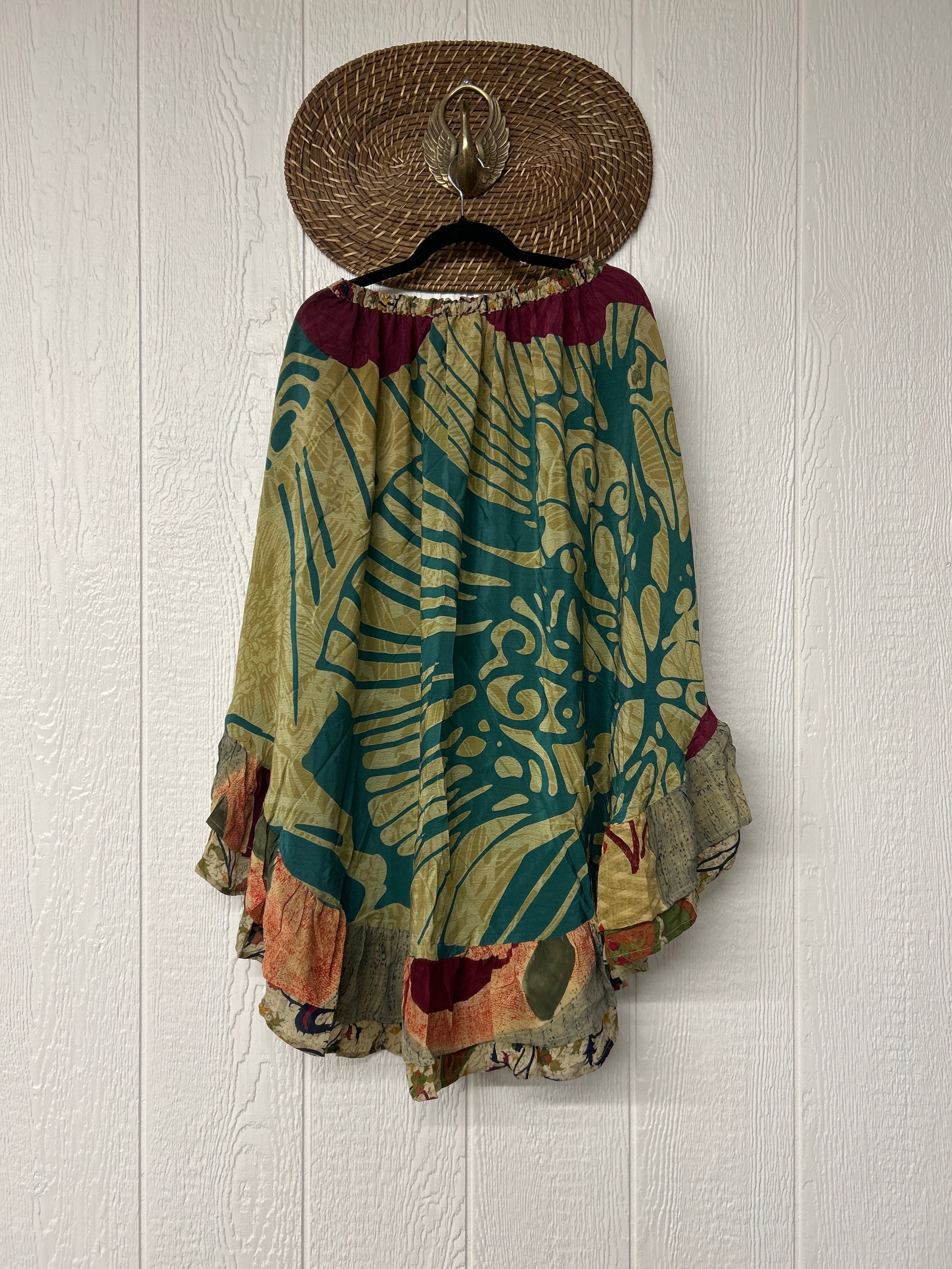 Crafted from vintage crepe sari this twirly skirt features a stretchy elastic waist and curved ruffle hem for extra dimension.